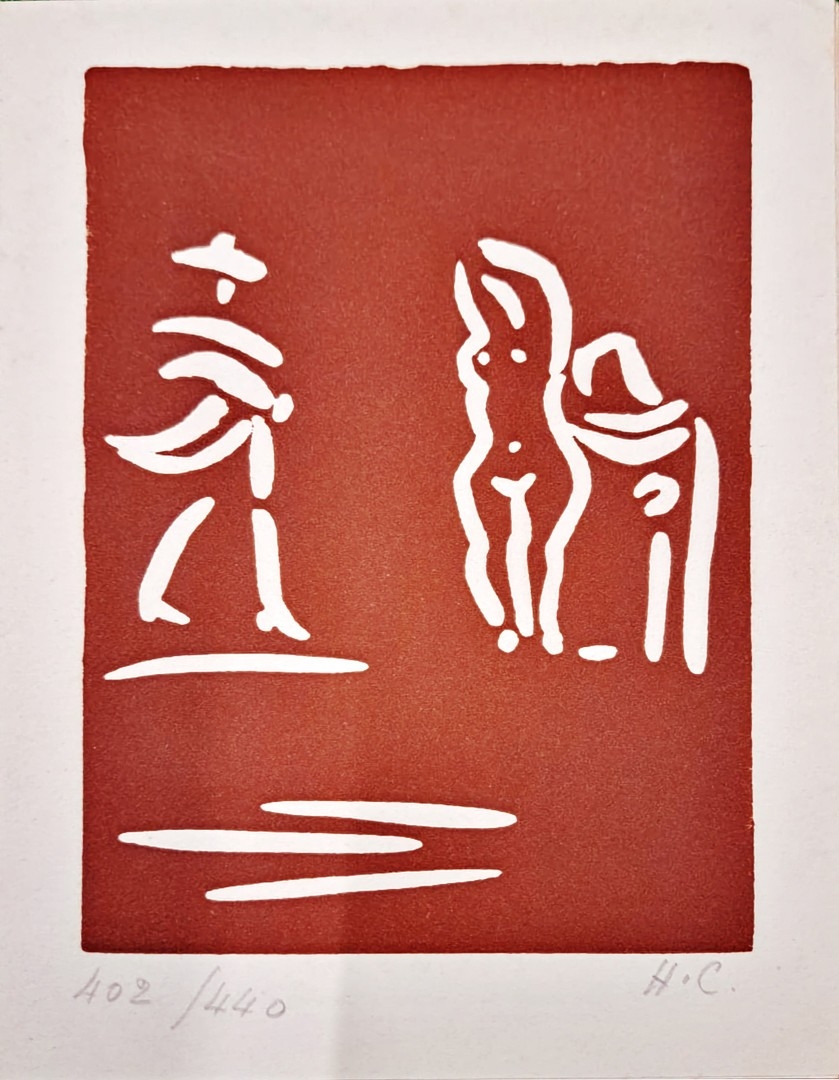 PABLO PICASSO (1881-1973). CAVALIER WALKING TOWARDS CELESTINE AND NUDE (NEW YEARS CARD FOR 1969) (S.9809) LA CELESTINE AVEC UNE FEMME ET UN CAVALIER A PIED FEMMES TOREADOR. (d) original linocut, Mouguins December 1968, printed in brown, on arches wove paper, an unsigned work, on verso, linographie originale de Picasso, specialement grave par l'auteur a l'intention de amis de Suzanne et Georges Ramie, text inside of card: Avec Les Meilleurs complements, et tous les voeux de madoura, le plan, Vallauris Madoura Boutique, Vallauris, 402/440 HC - folded with the text on pages 2 and 3, as a New Years Card for 1968, folded size: 14.5cm x 21.5cm, paper size: 11cm x 17cm , image size, portrait format: this was the New Years card for 1 968, there waws also a ceramic version of this item, printed by: Arnera, Vallauris, France, published by: Gallerie Madoura, Vallauris and Cannes. (Subject to ARR see Buyers Conditions).