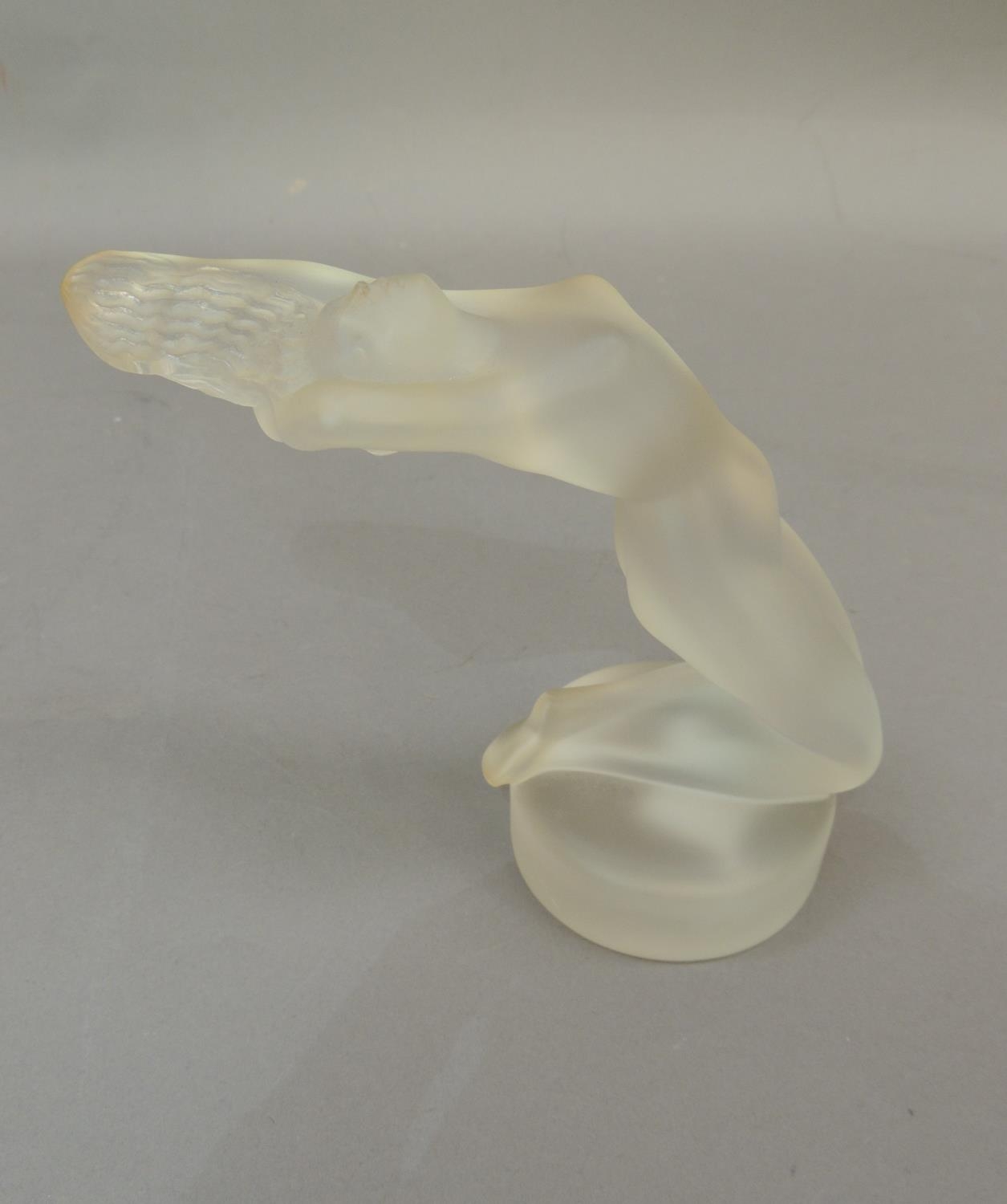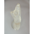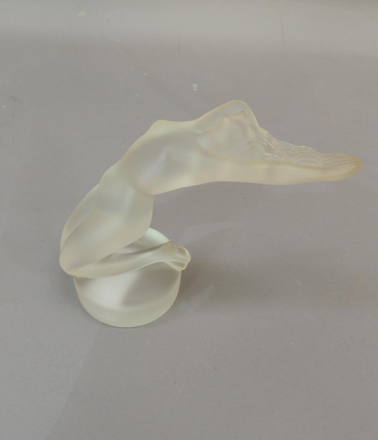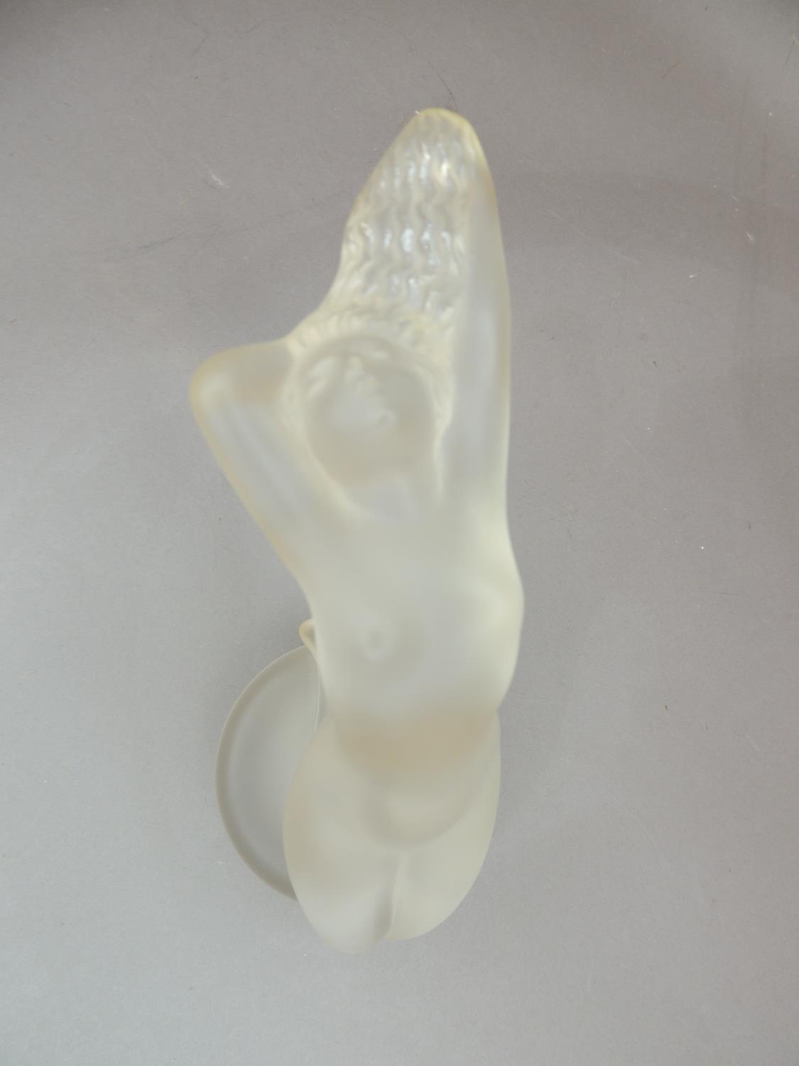 A Lalique figure of a reclining naked woman, circular base, engraved signature, 13cm high approximately