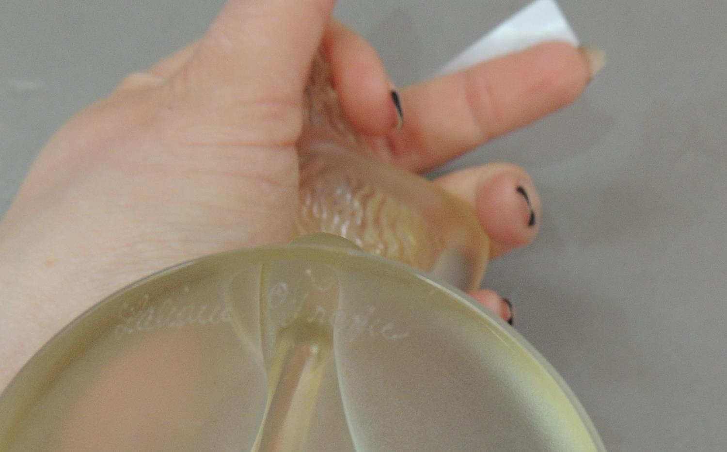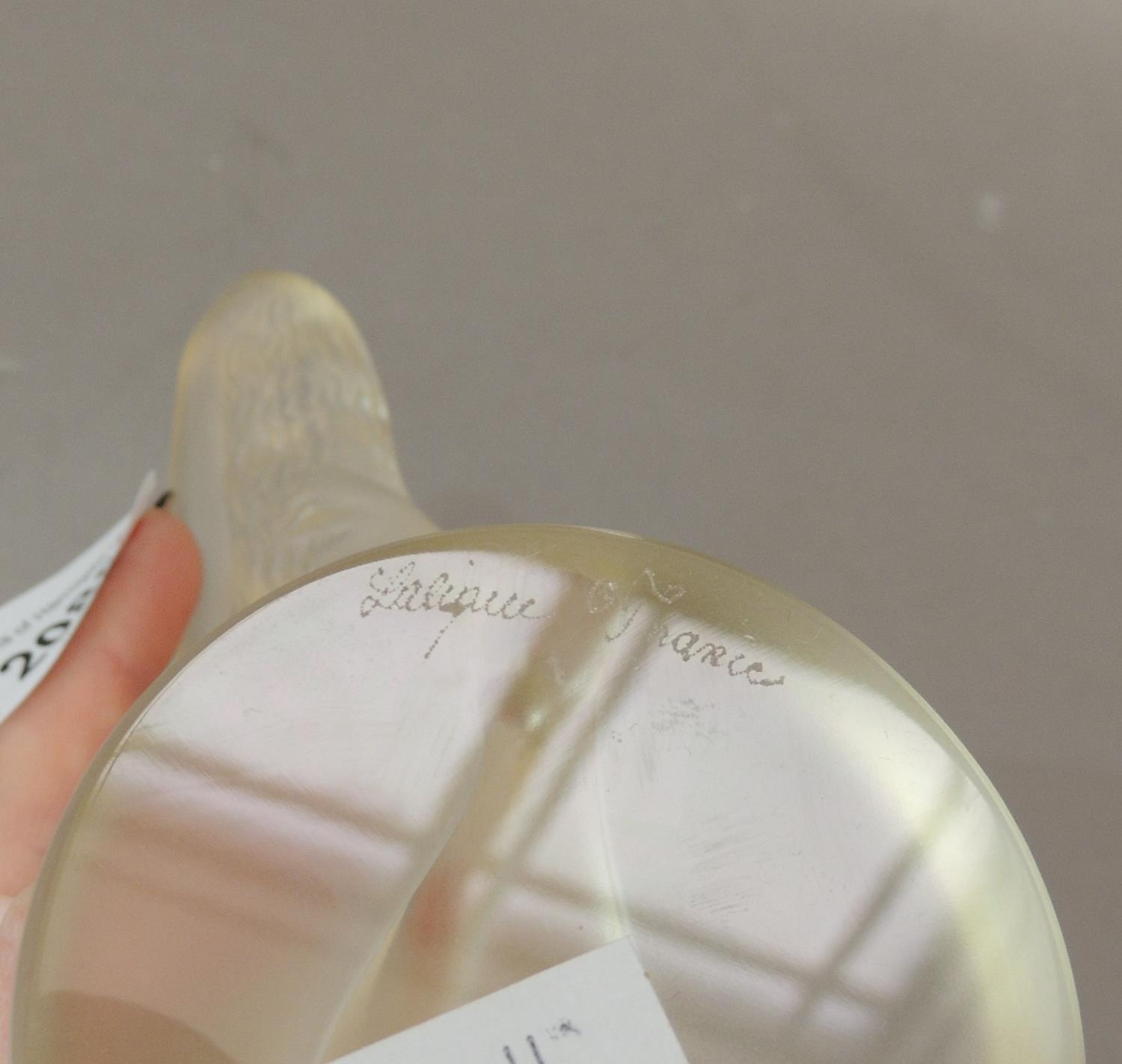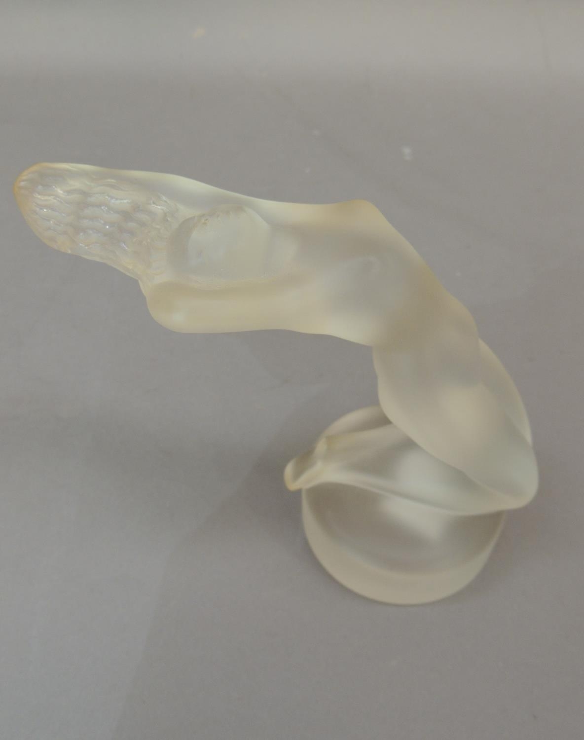 A Lalique figure of a reclining naked woman, circular base, engraved signature, 13cm high approximately