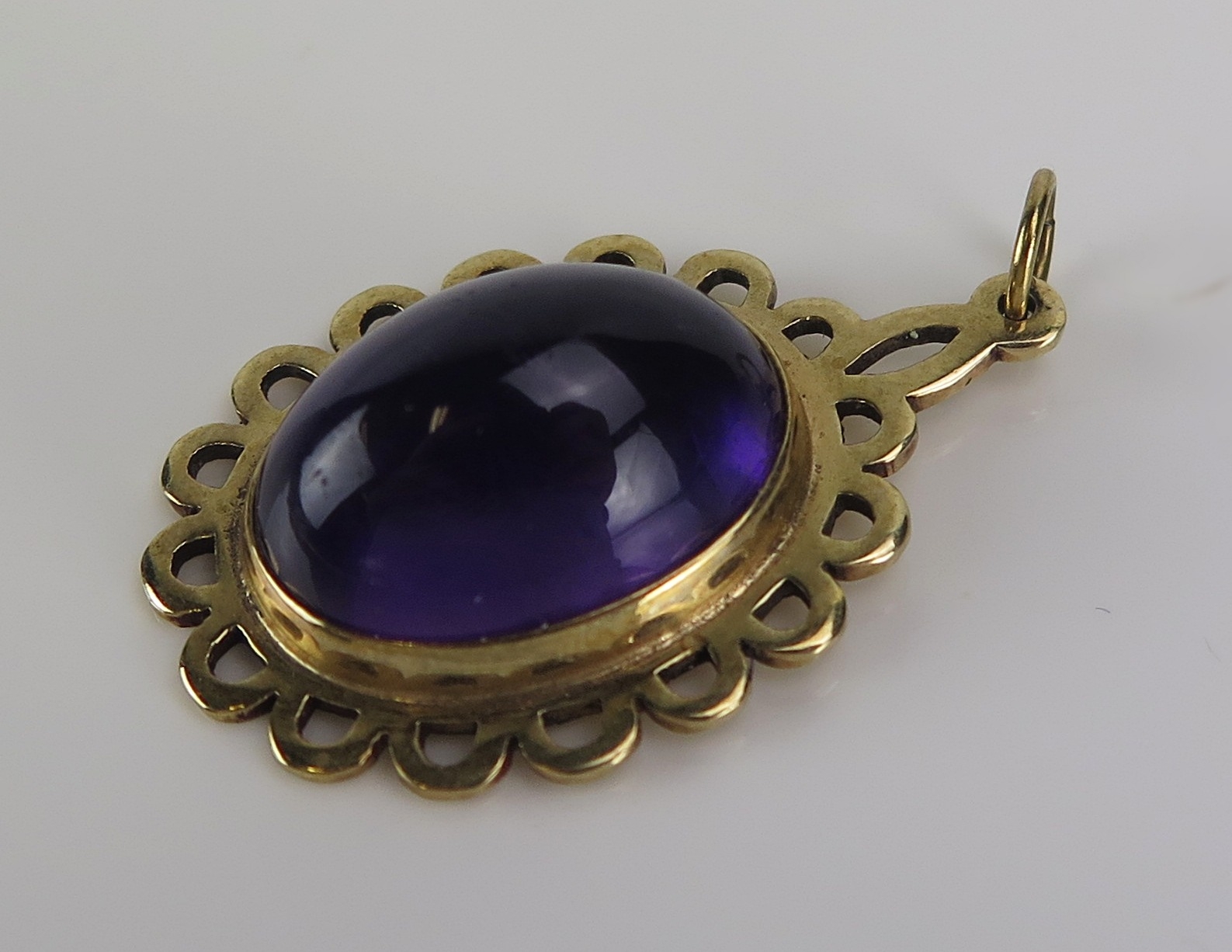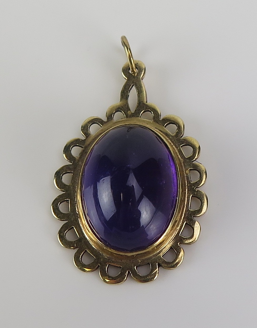 An amethyst pendant in a 9ct yellow gold setting, 37mm drop, hallmarked, 6.75g