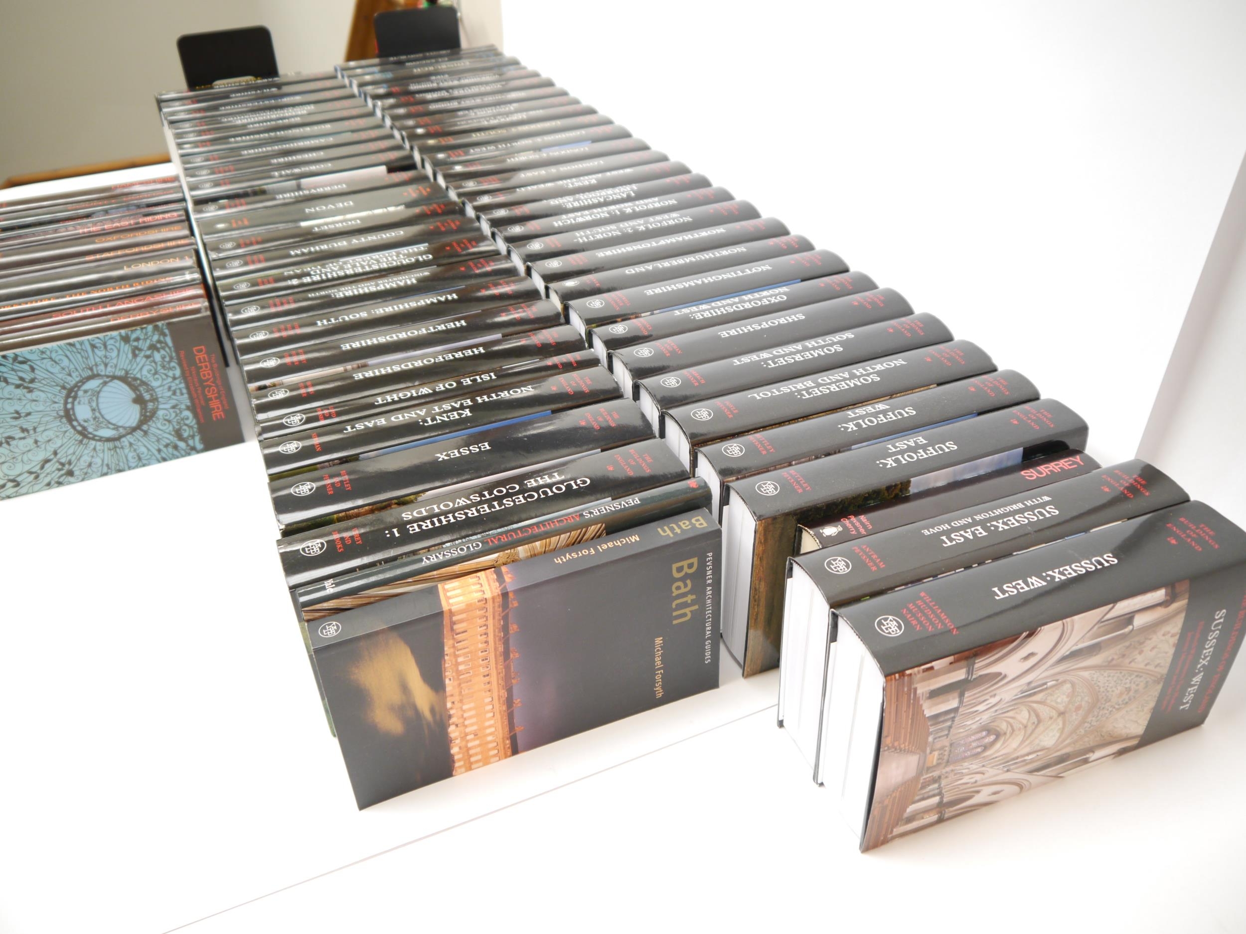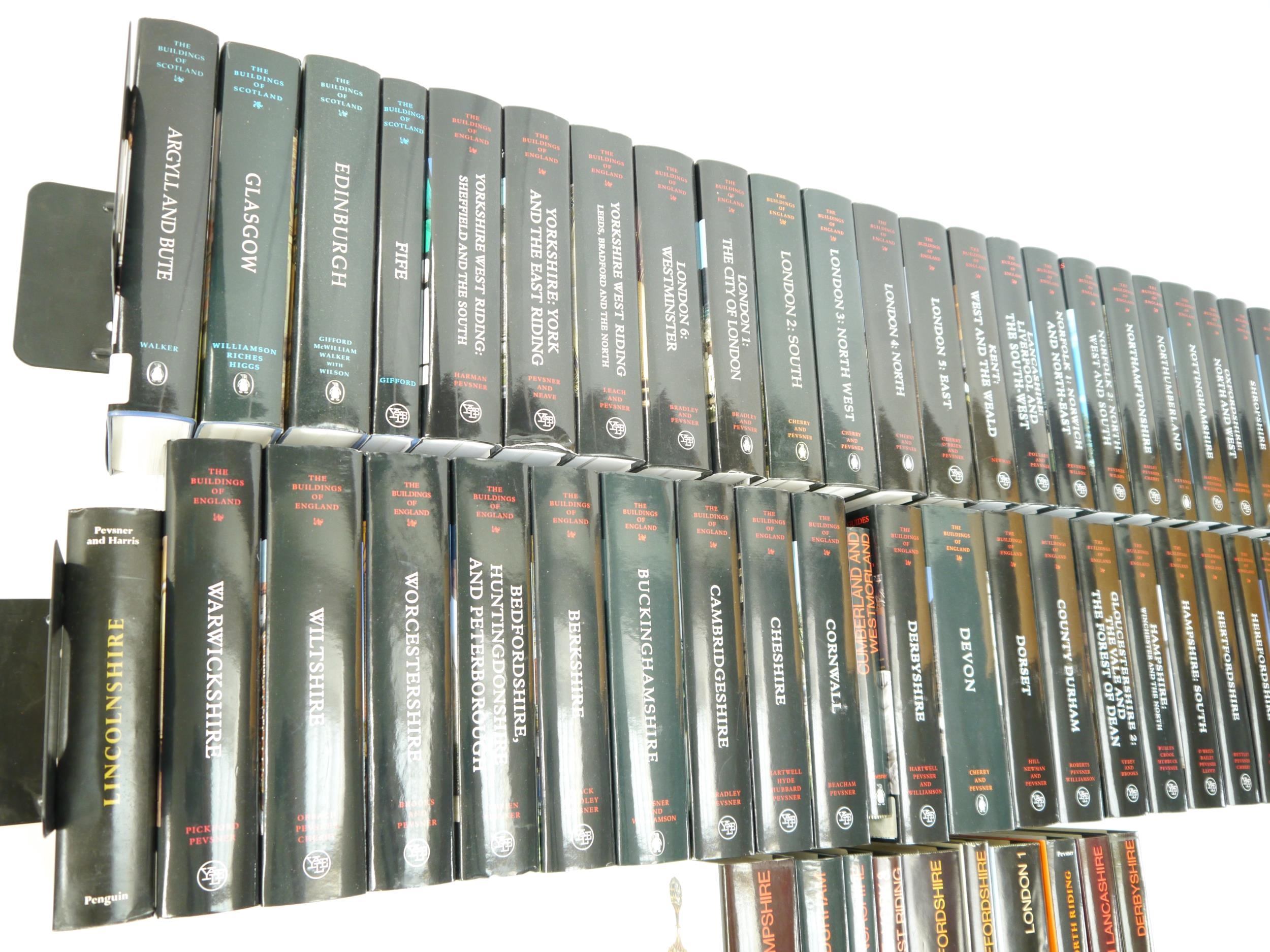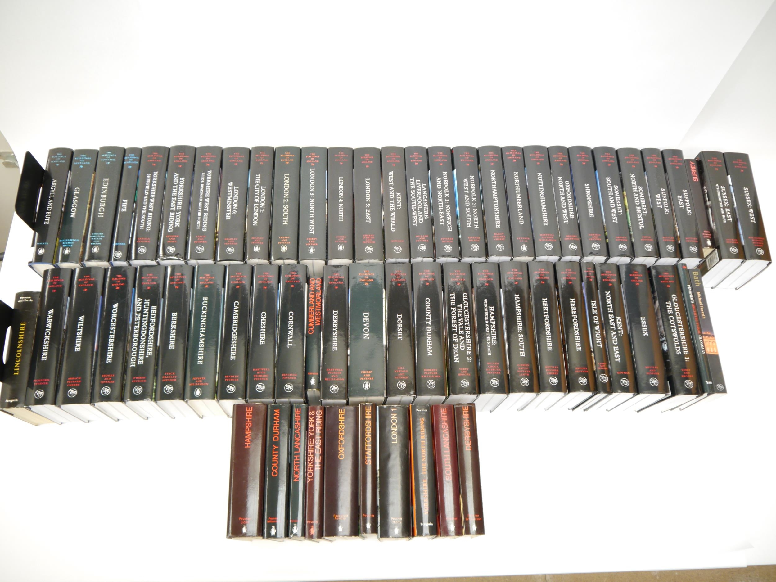 Nikolaus Pevsner 'The Buildings of England'. A collection of 48 volumes, 45 published by Yale University Press, early 2000's onwards (includes the 6 volumes on London); the remaining three, smaller format earlier Penguin imprints. The Yale volumes in original Rexine, with dust jackets, in virtually new condition; the three Penguin volumes, original cloth, dust jackets; Together with a further ten duplicate/superceded volumes in the earlier Penguin imprint; also four volumes in the Yale edition of the Buildings of Scotland; Plus two others related. (64)