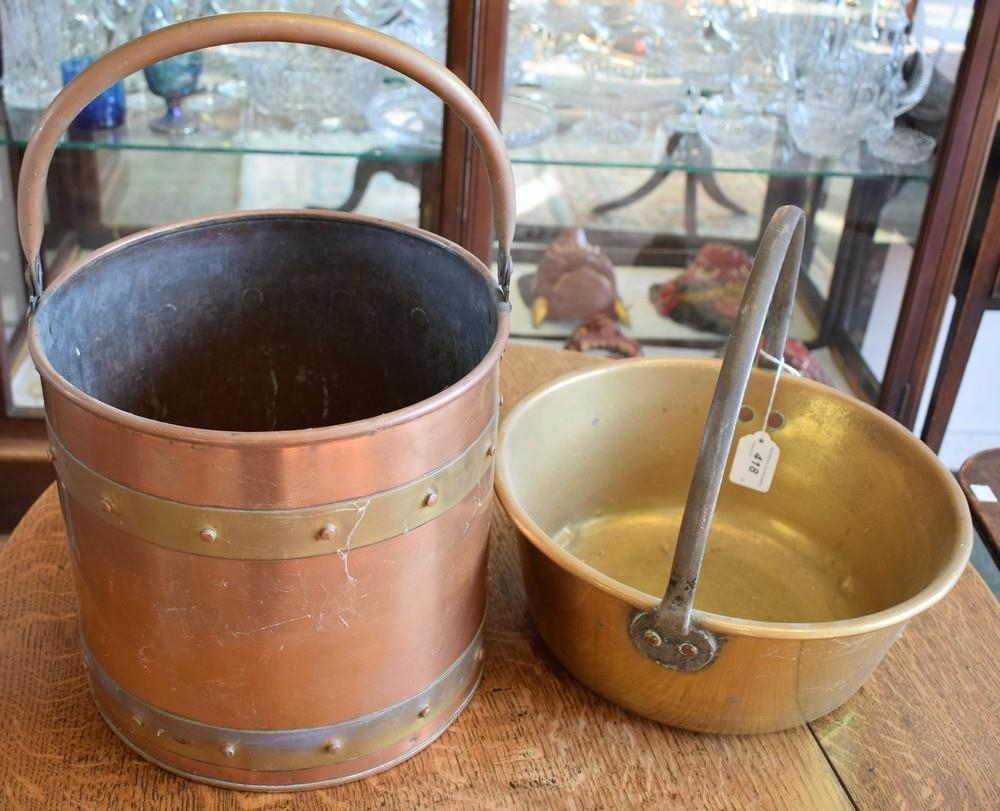A copper and brass bound log bin; a brass jam pan (2)