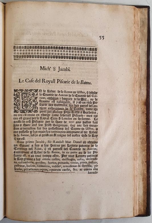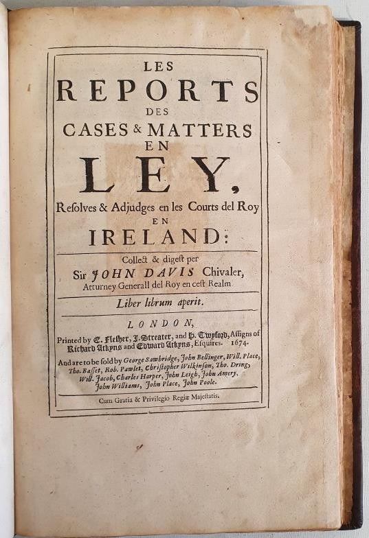 DAVIES, Sir John. Les Reports des Cases & Matters en Ley Resolves & Adjudges en les Courts del Roy en Ireland: Collect and digest per Sir John Davis Chivaler, Atturney Generall del Roy en cest Realm. London: Printed by C. Flesther, J. Streater, and H. Twyford, Assigns of Richard Atkyns and Edward Atkyns, Esquires, 1674. Small folio. pp. [xxviii], 198. Title within ruled border. Contemporary full calf. Spine professionally rebacked. Early owner’s signature ‘Christopher Tuckey’ on front free endpaper. Early bookplate of Robert Jocelyn, Esq. on verso of titlepage. Professional paper repair to corners of blanks and titlepage. Some early marginalia in ink. Old inoffensive water stain. A very good clean copy. Exceedingly rare