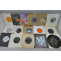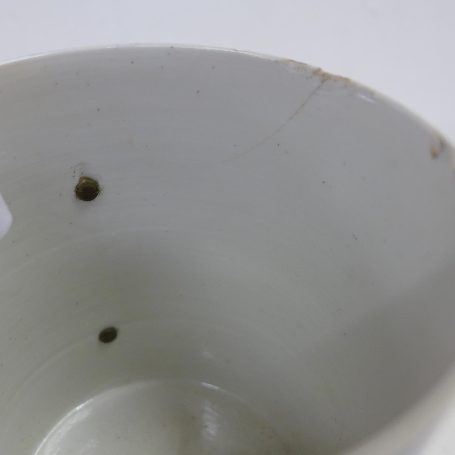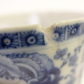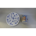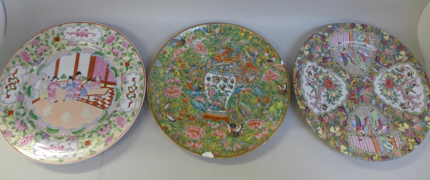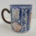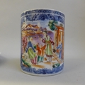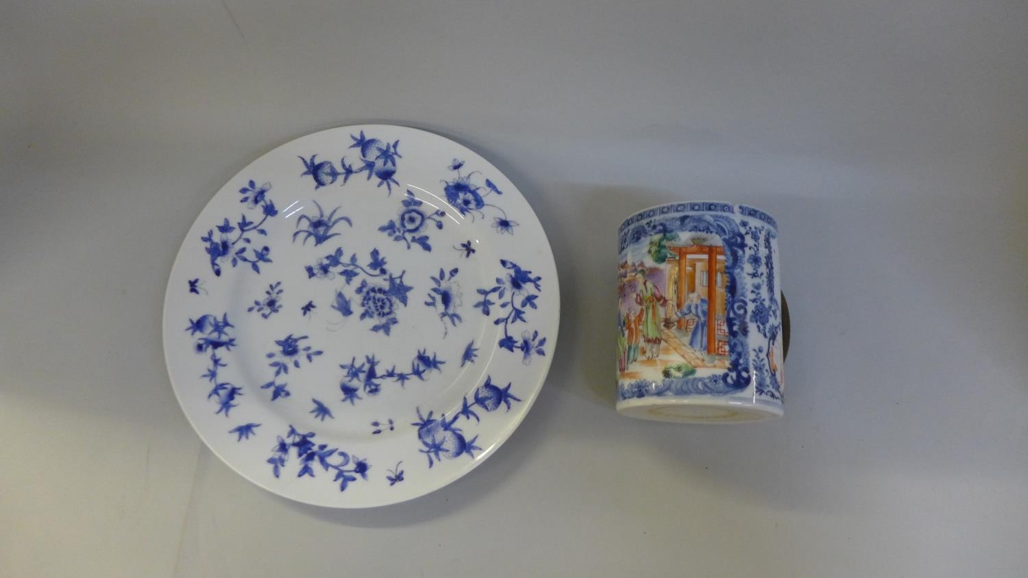 A Qianlong Chinese mug, a/f, and four oriental plates, famille verte x3 and blue and white, one plate a/f, (5 pieces)