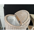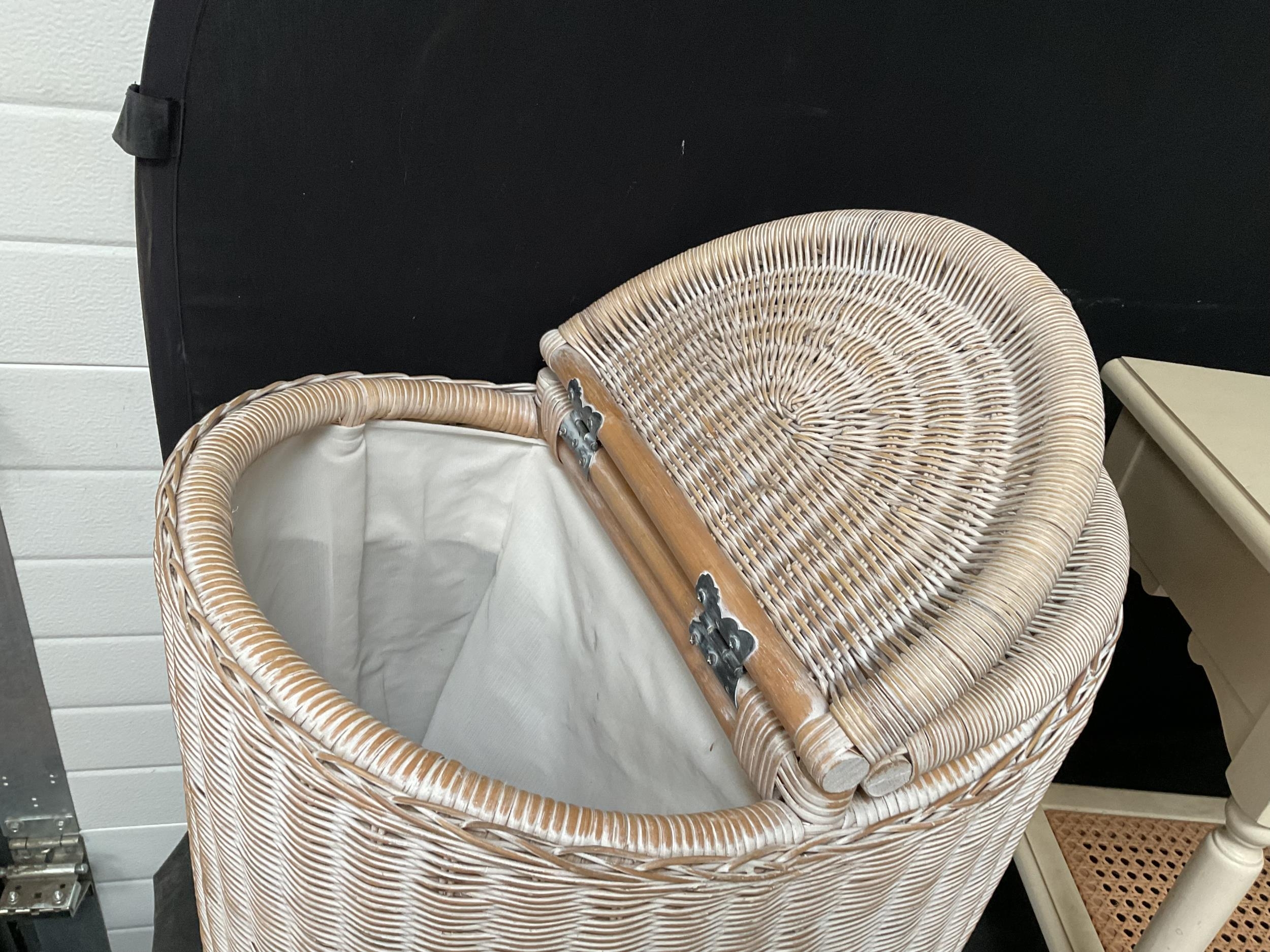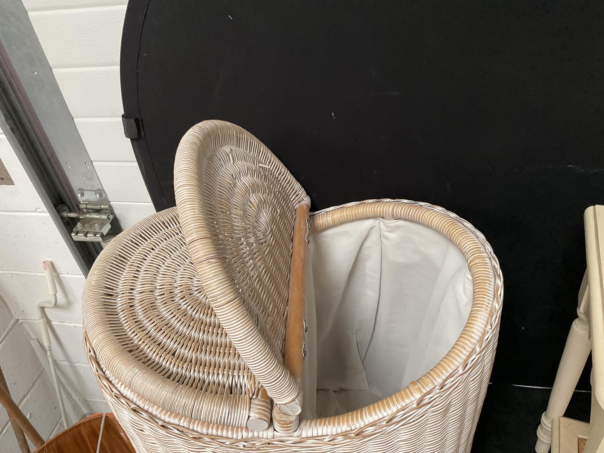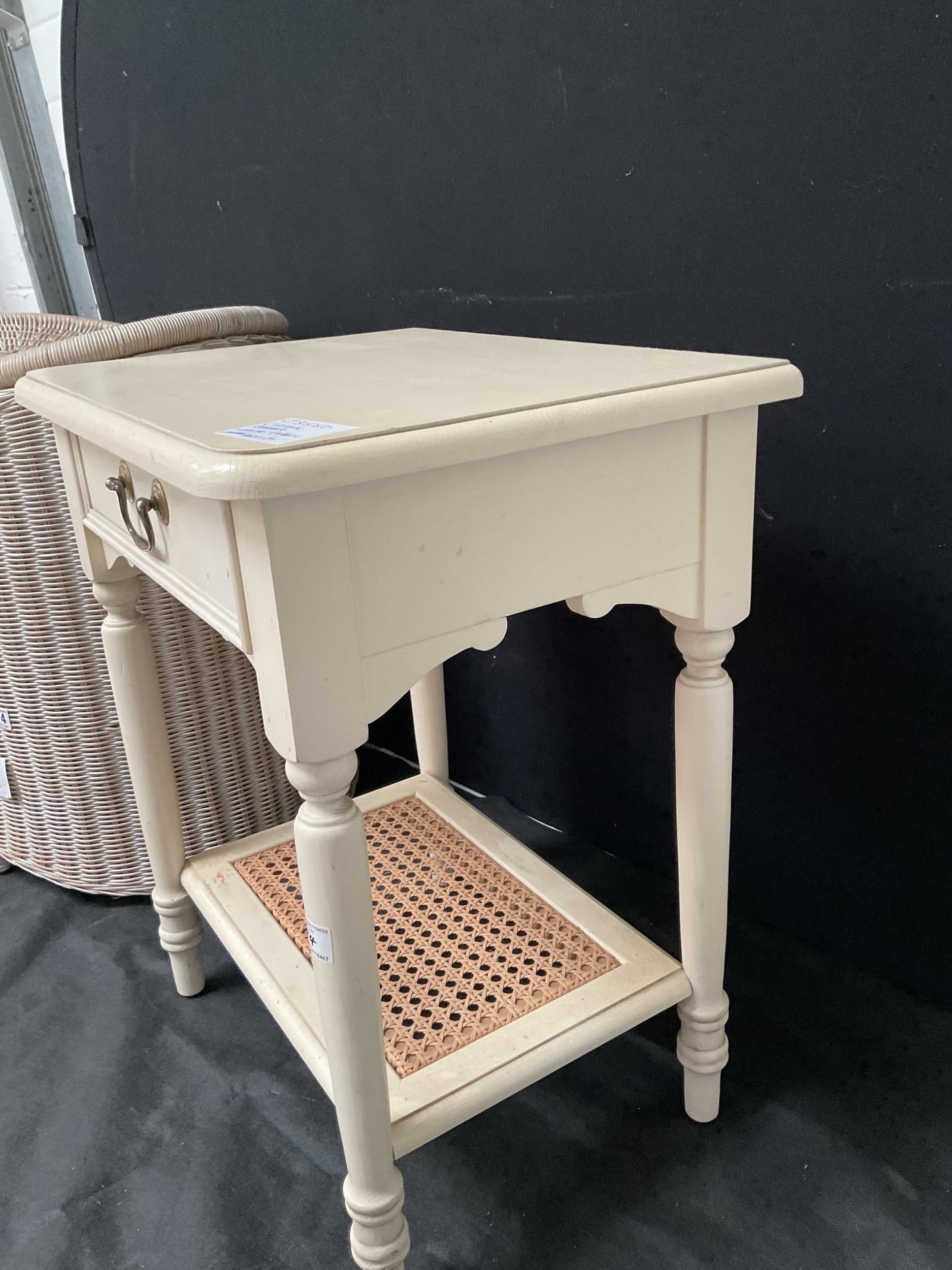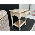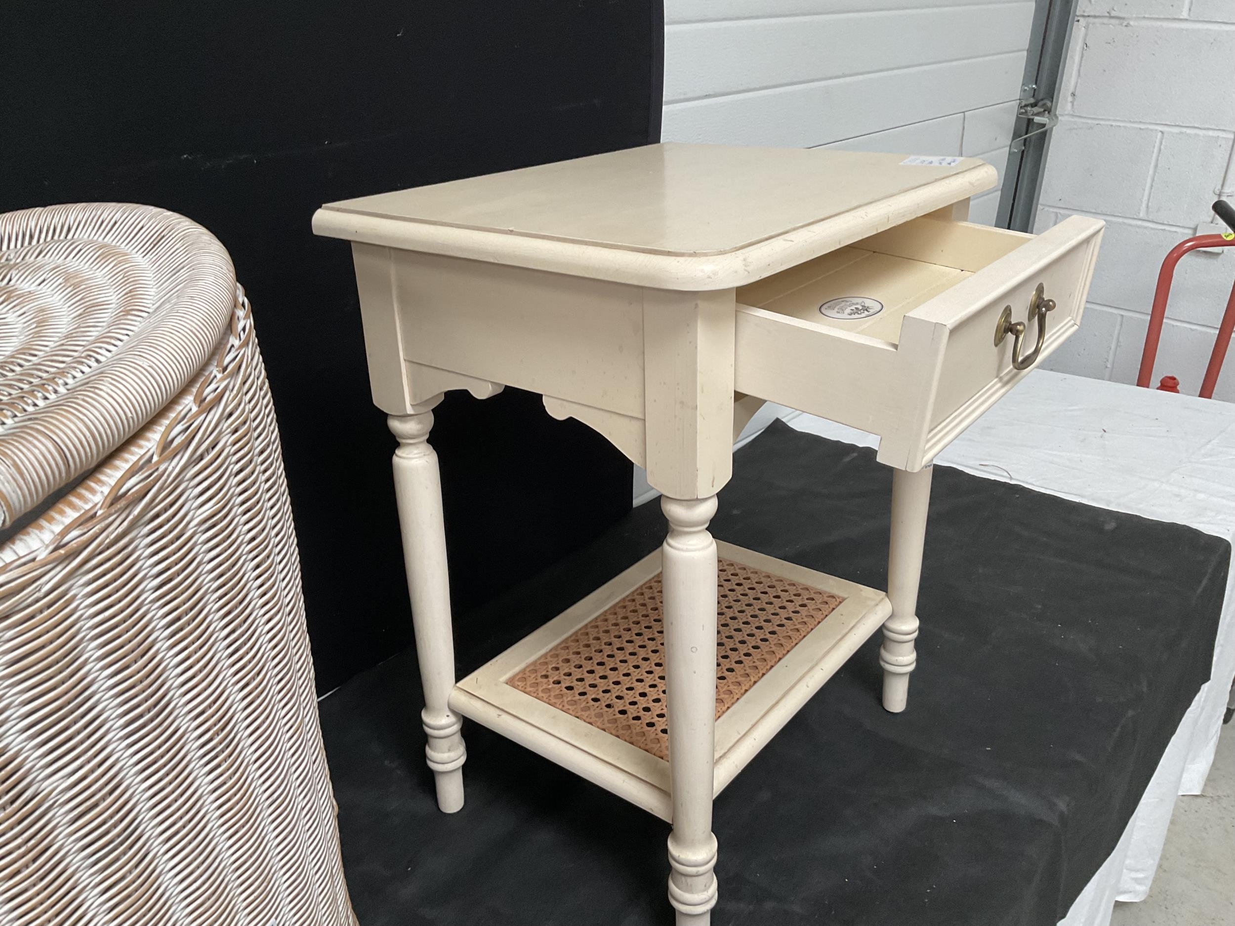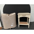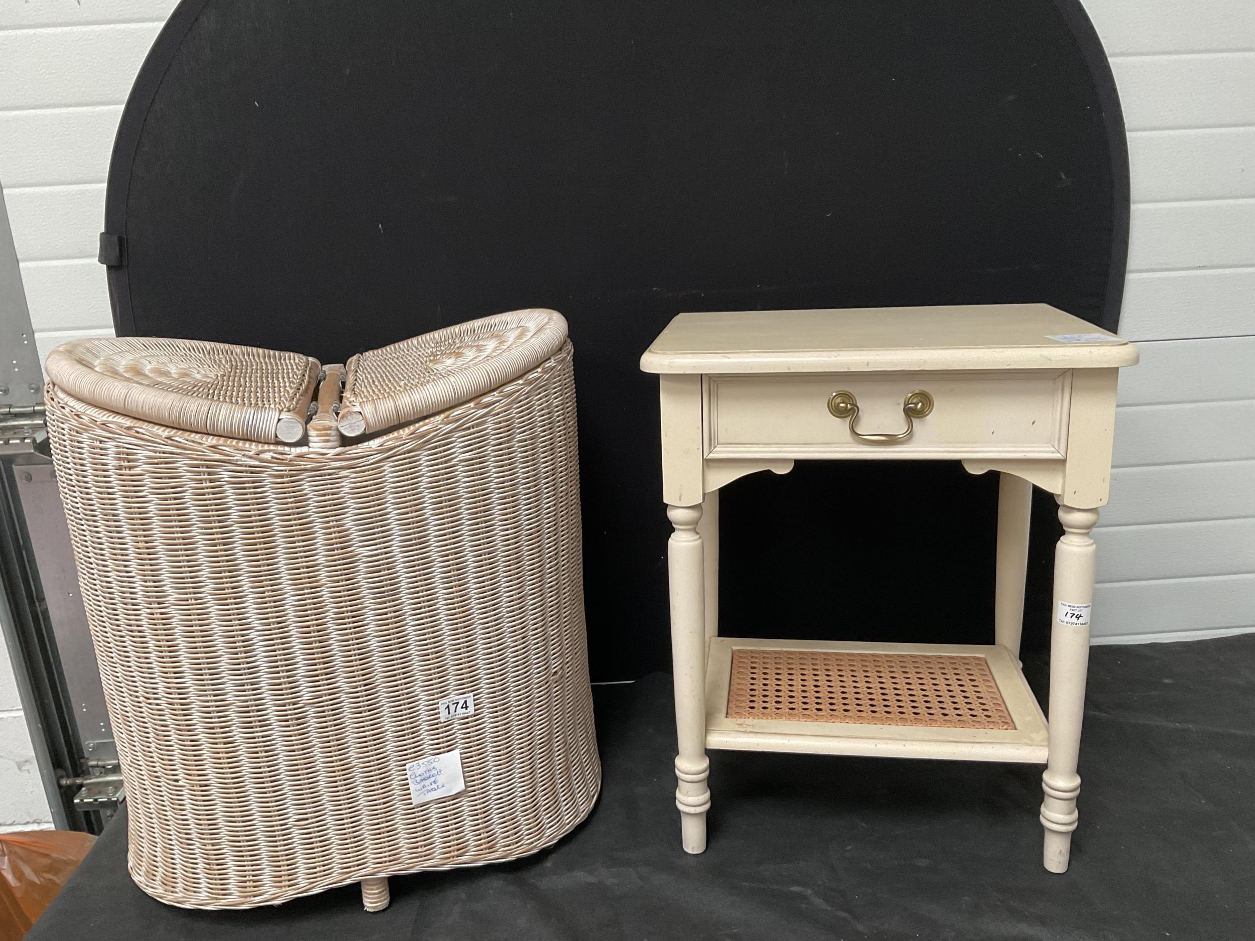 MODERN WOVEN DOUBLE SIDED LINEN BASKET, AND A BADGED LAURA ASHLEY LAMP TABLE WITH SINGLE DRAWER ON TURNED LEGS