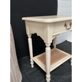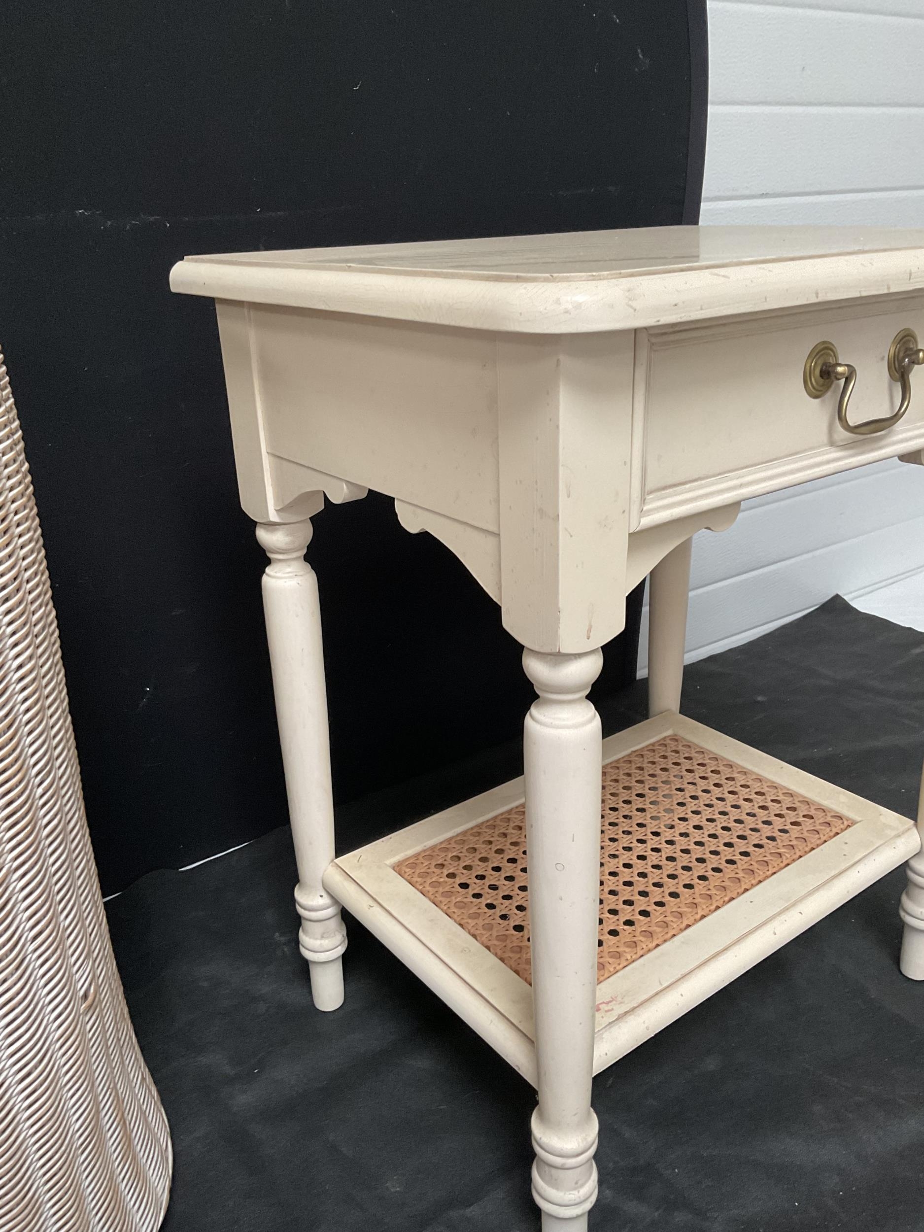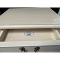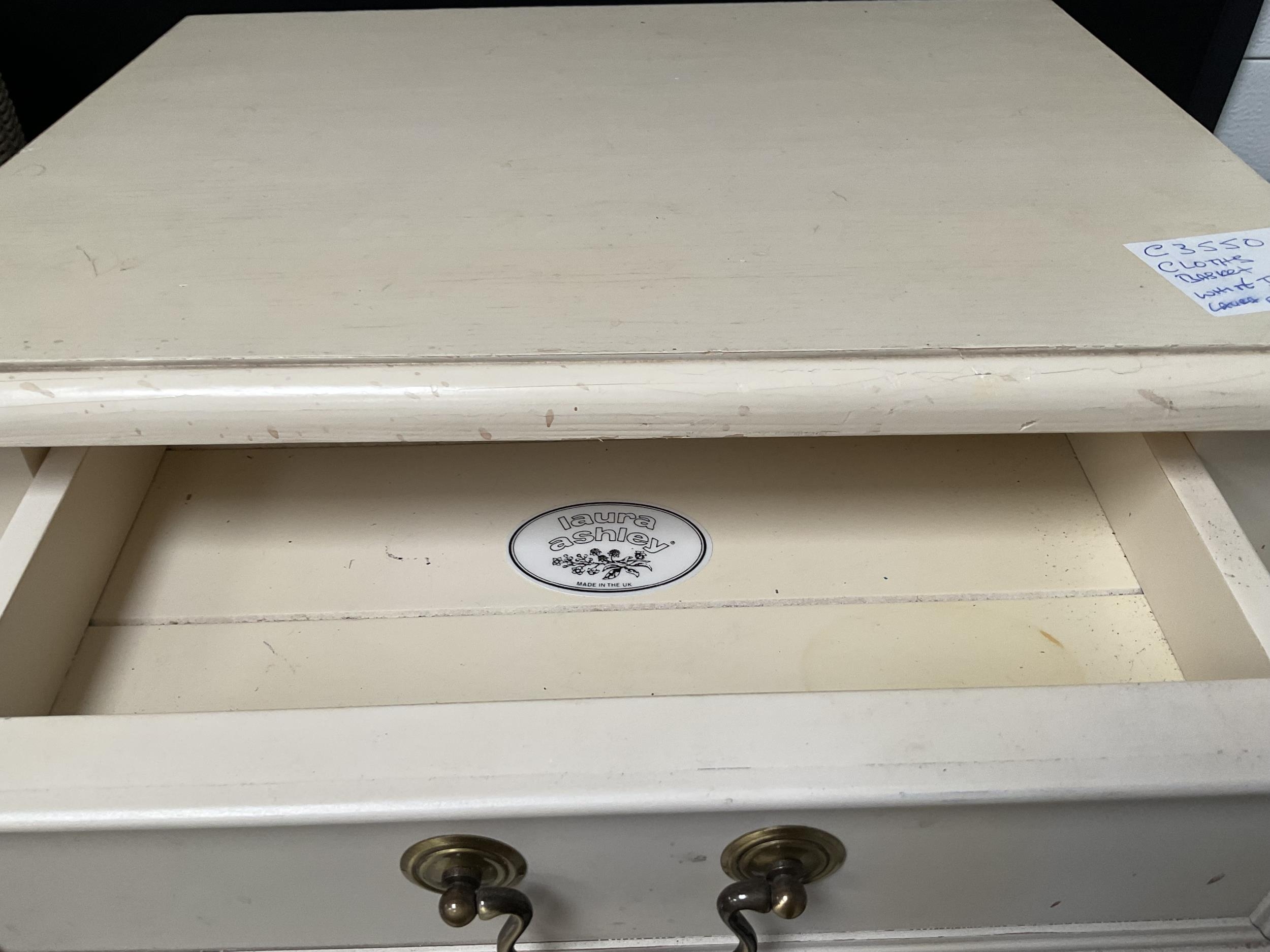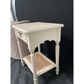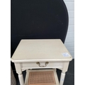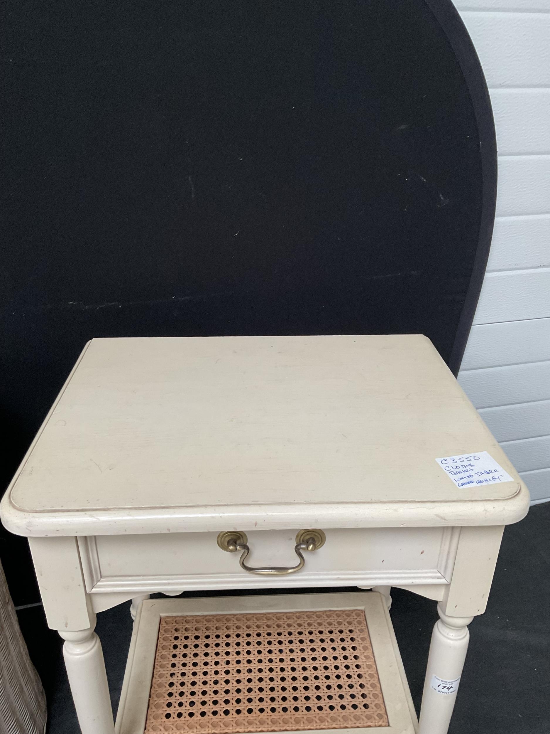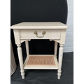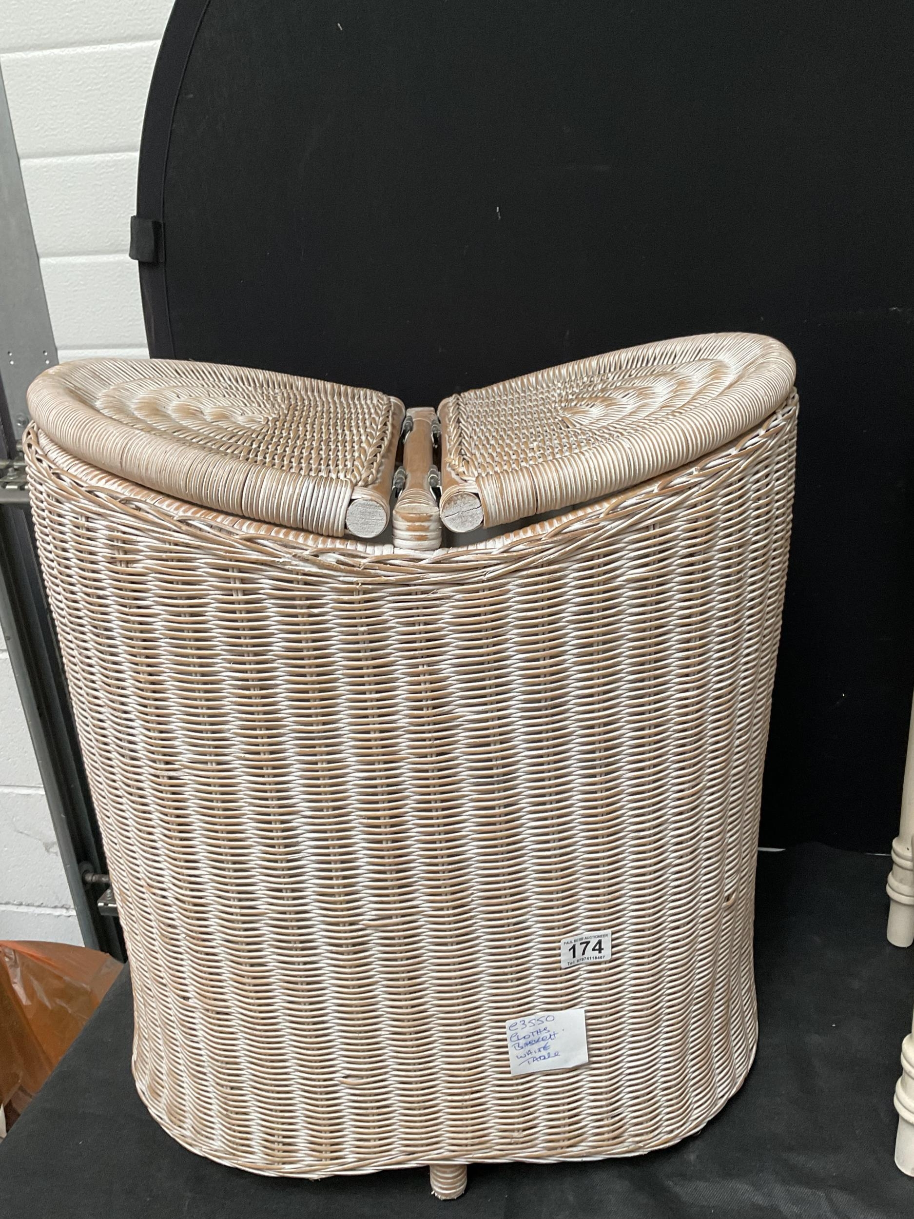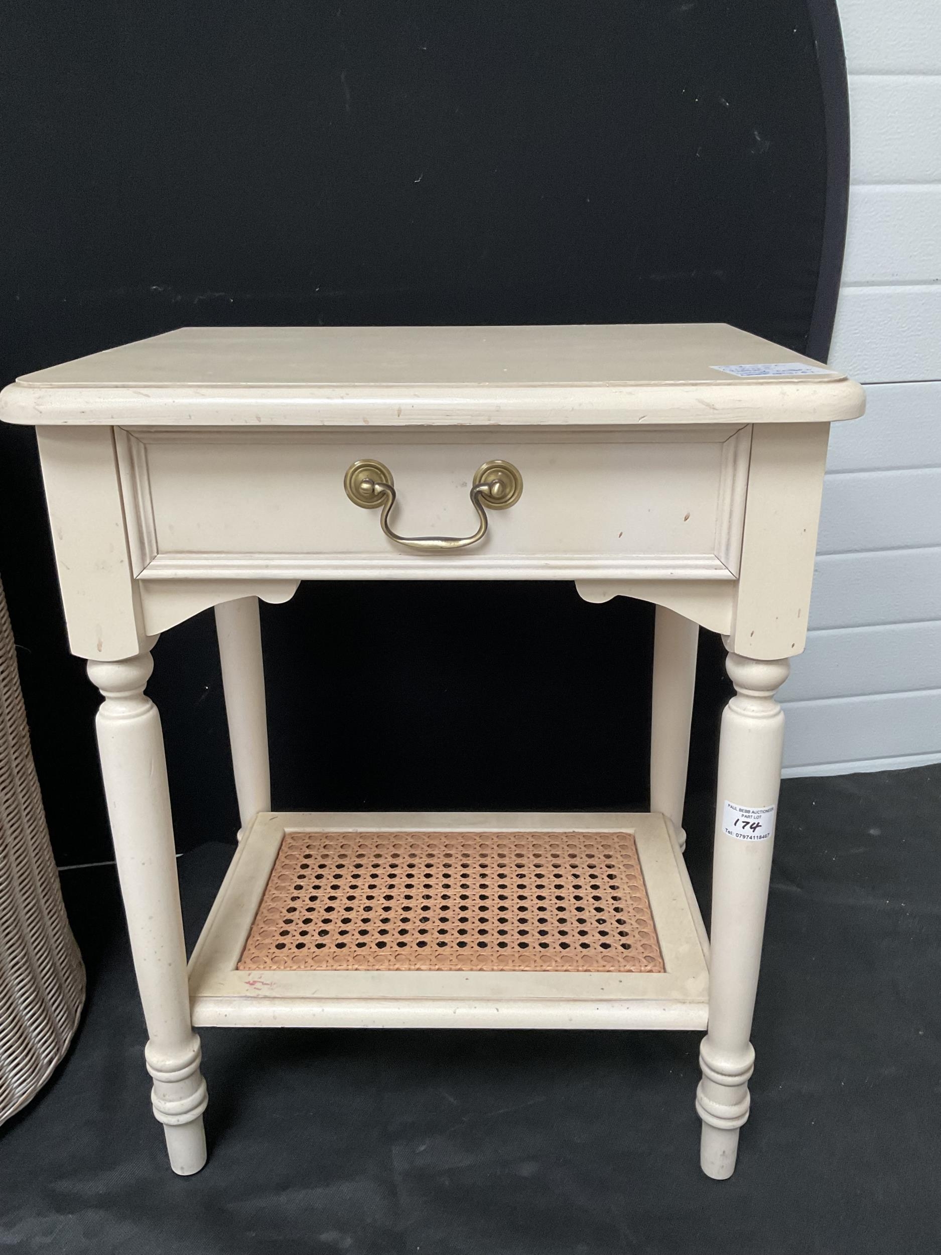 MODERN WOVEN DOUBLE SIDED LINEN BASKET, AND A BADGED LAURA ASHLEY LAMP TABLE WITH SINGLE DRAWER ON TURNED LEGS