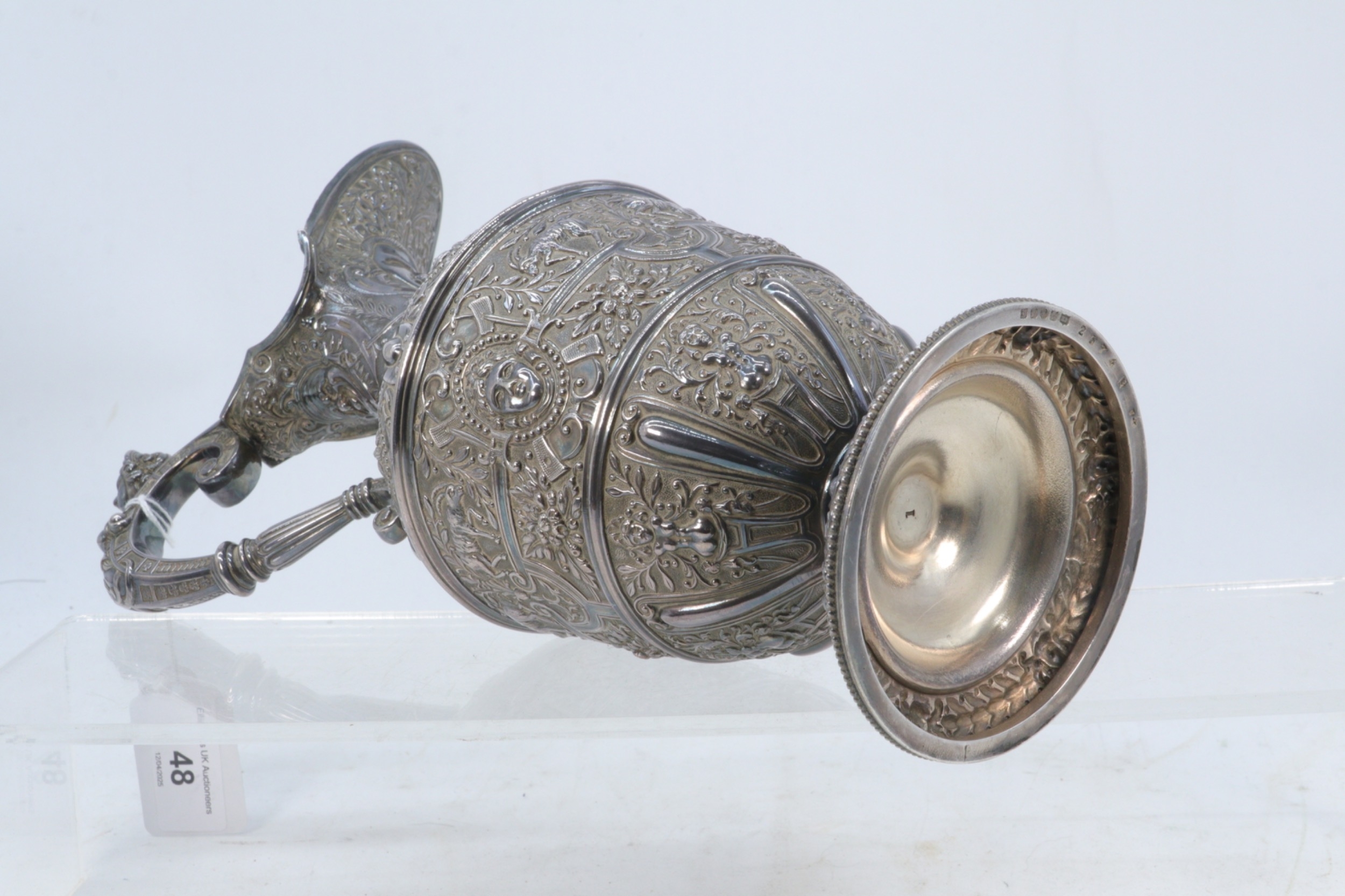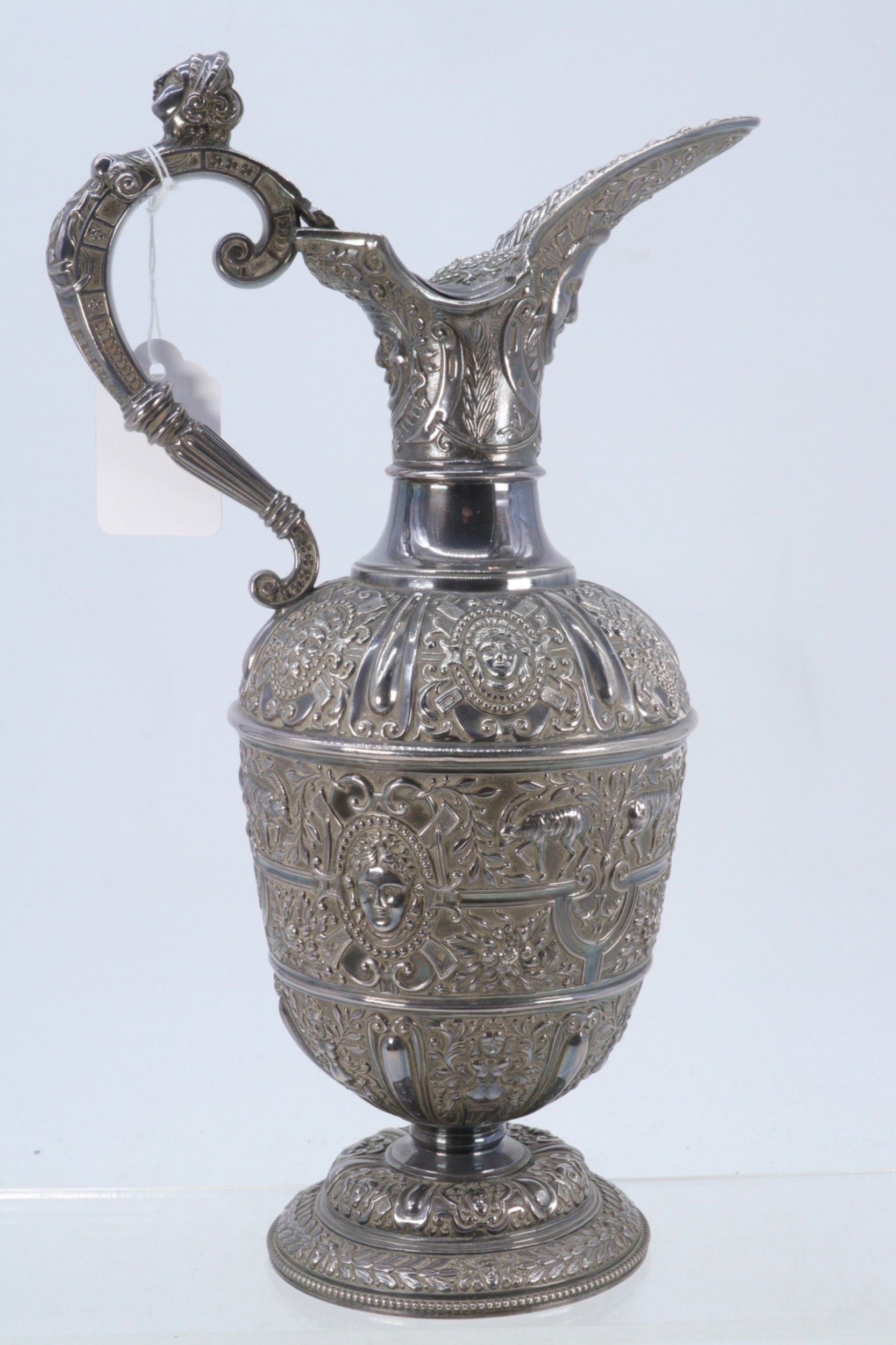 A silver plated Cellini style claret jug