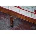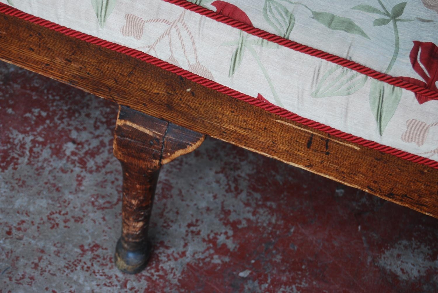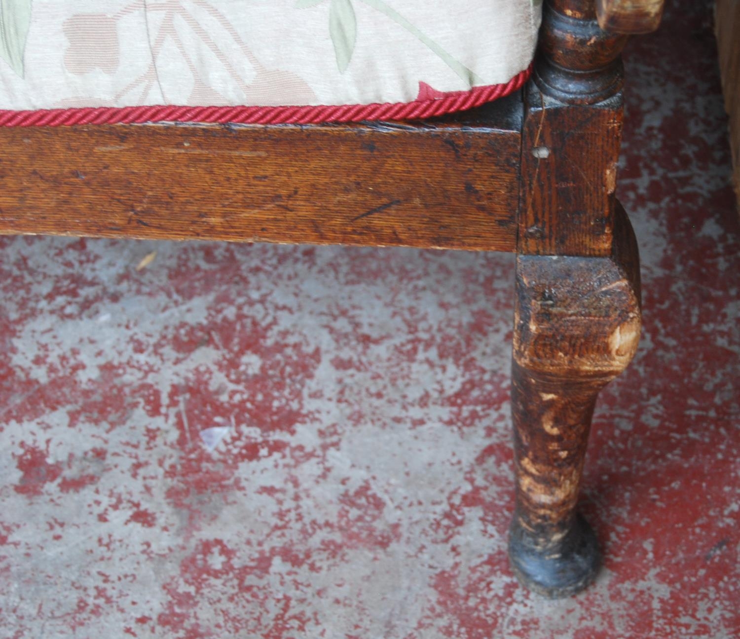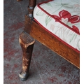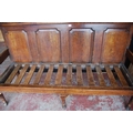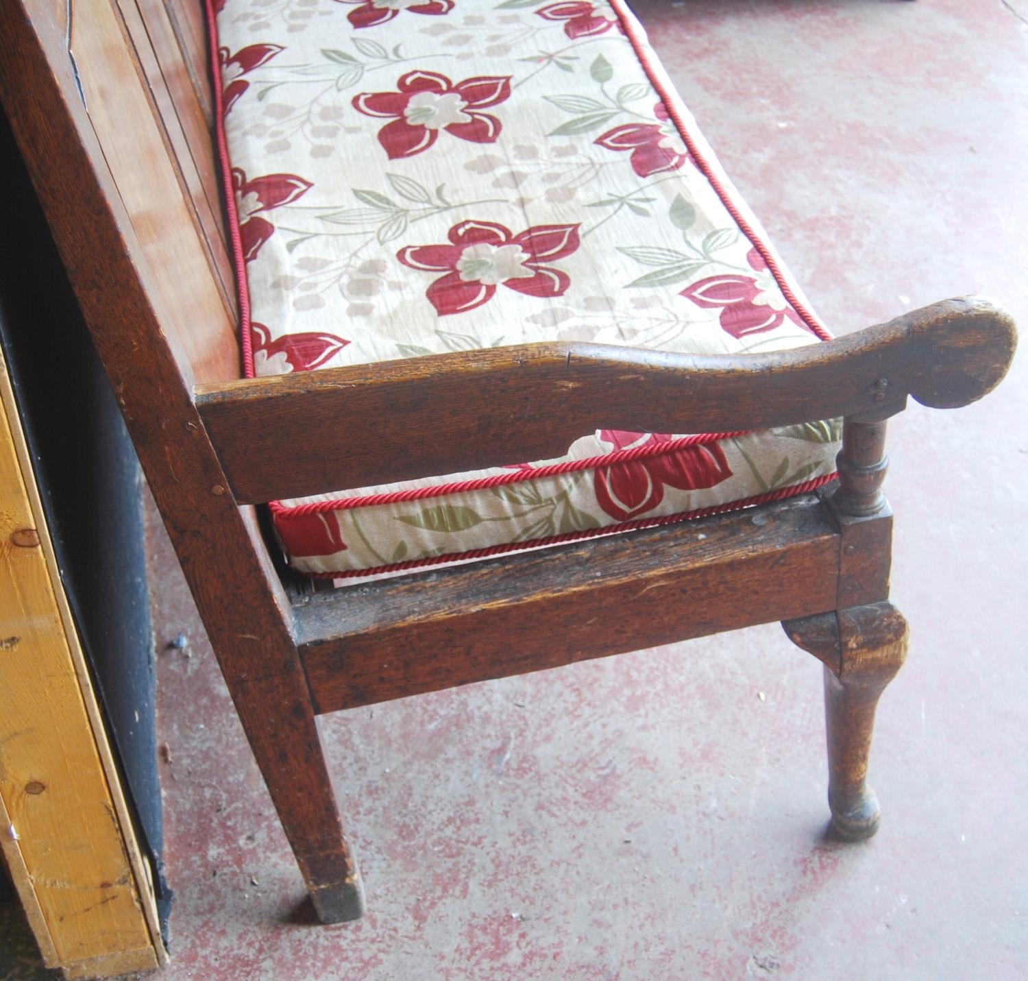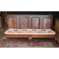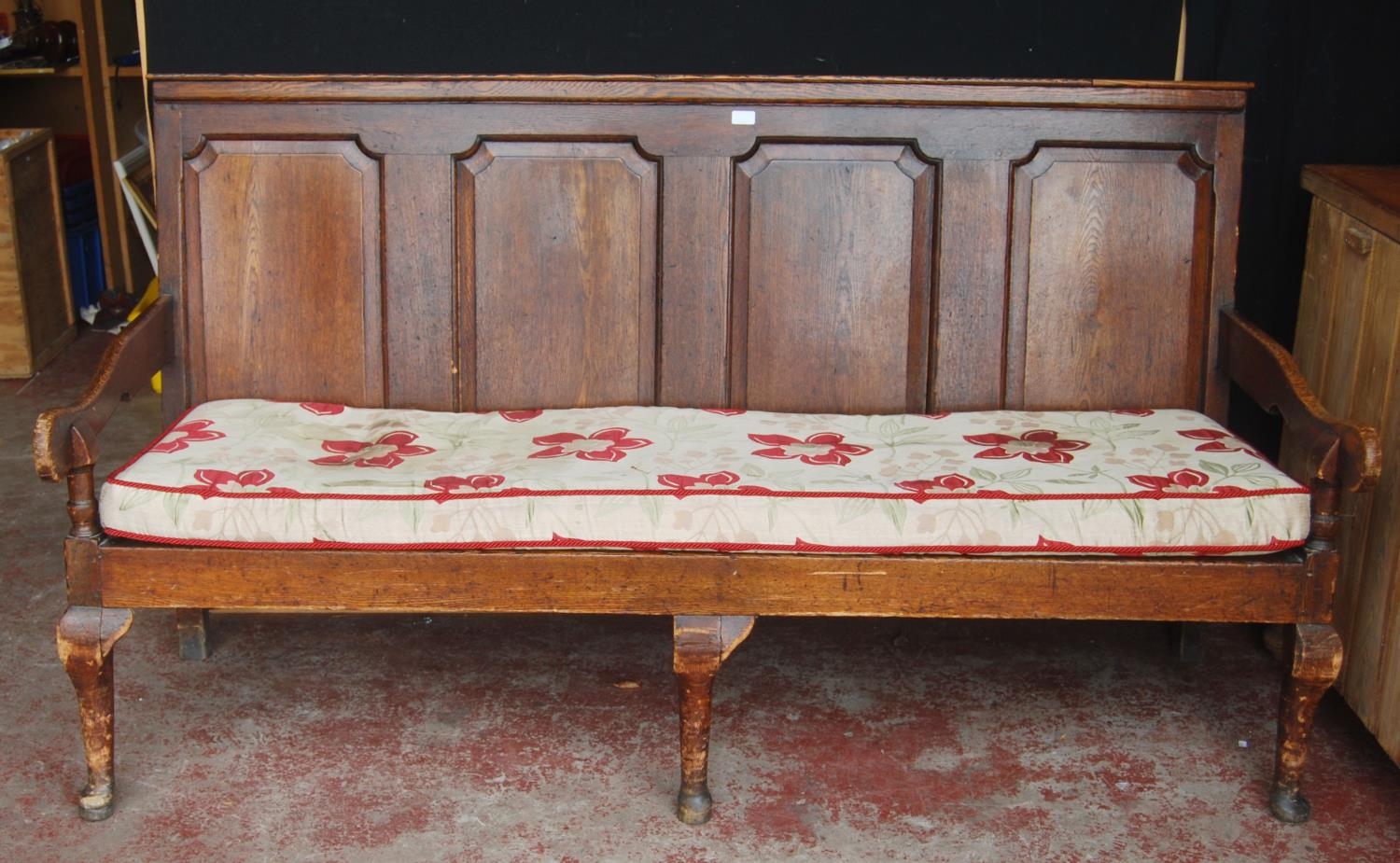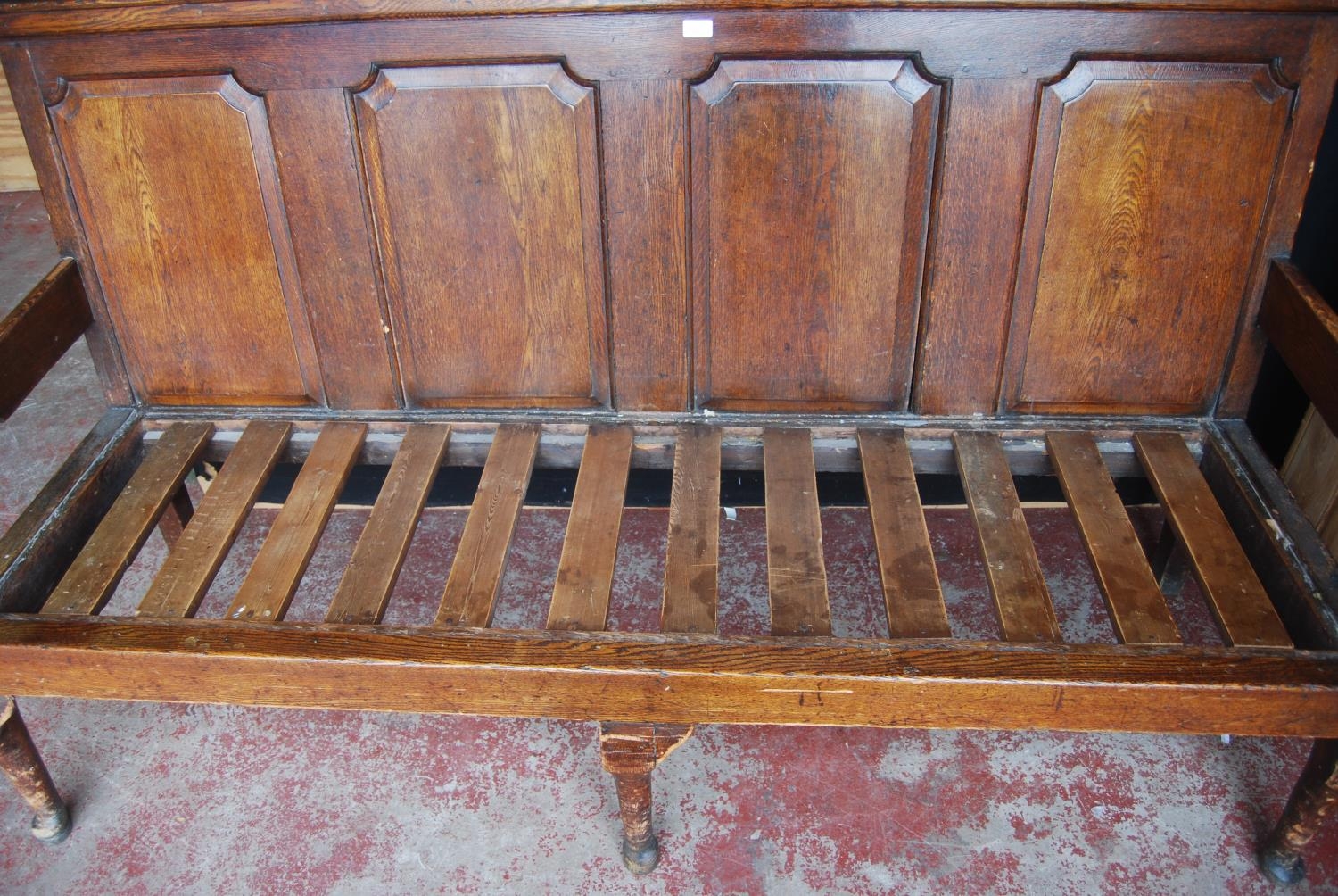 Early 19th century oak hall bench, with a four-section panelled back above a later slatted seat, with scroll arm rests, on pad feet, 102cm high, 186cm wide and 78cm deep.