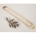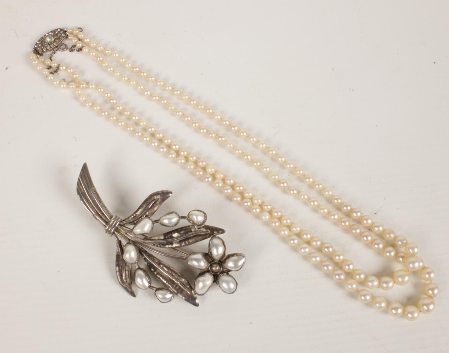 A row of 2 cultured pearl necklace along with a silver pearl brooch.