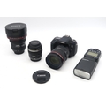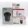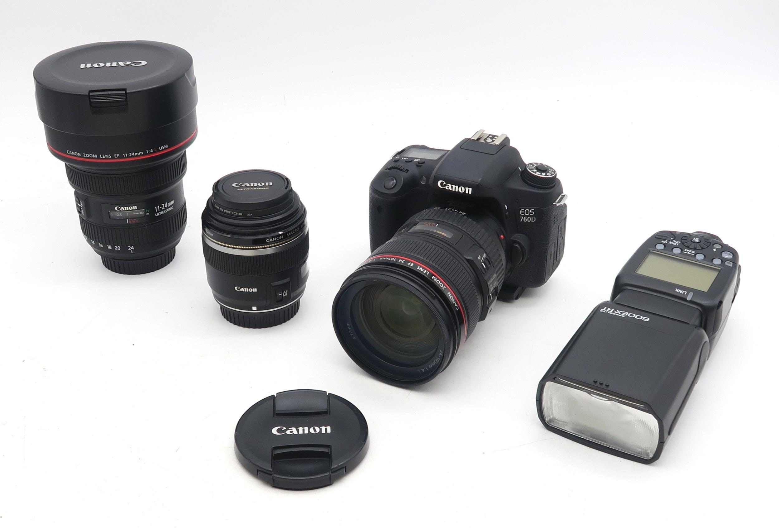 A Canon Eos 760D digital camera, fitted with a Canon EF 24-105mm 1:4 lens, together with a Canon Macro lens EFS 60mm 1:2.8, a Canon Ultrasonic Zoom lens EF 11-24mm 1:4 and a Canon 600EX-RT Speedlite flash, all contained in padded canvas cases and retaining original packaging