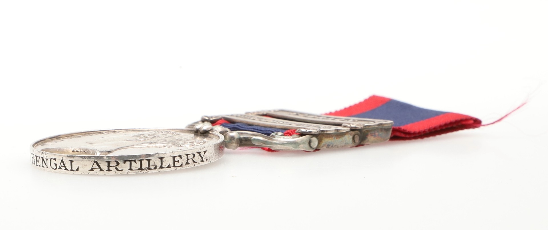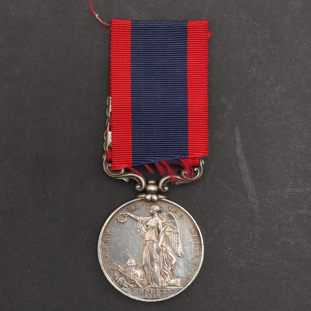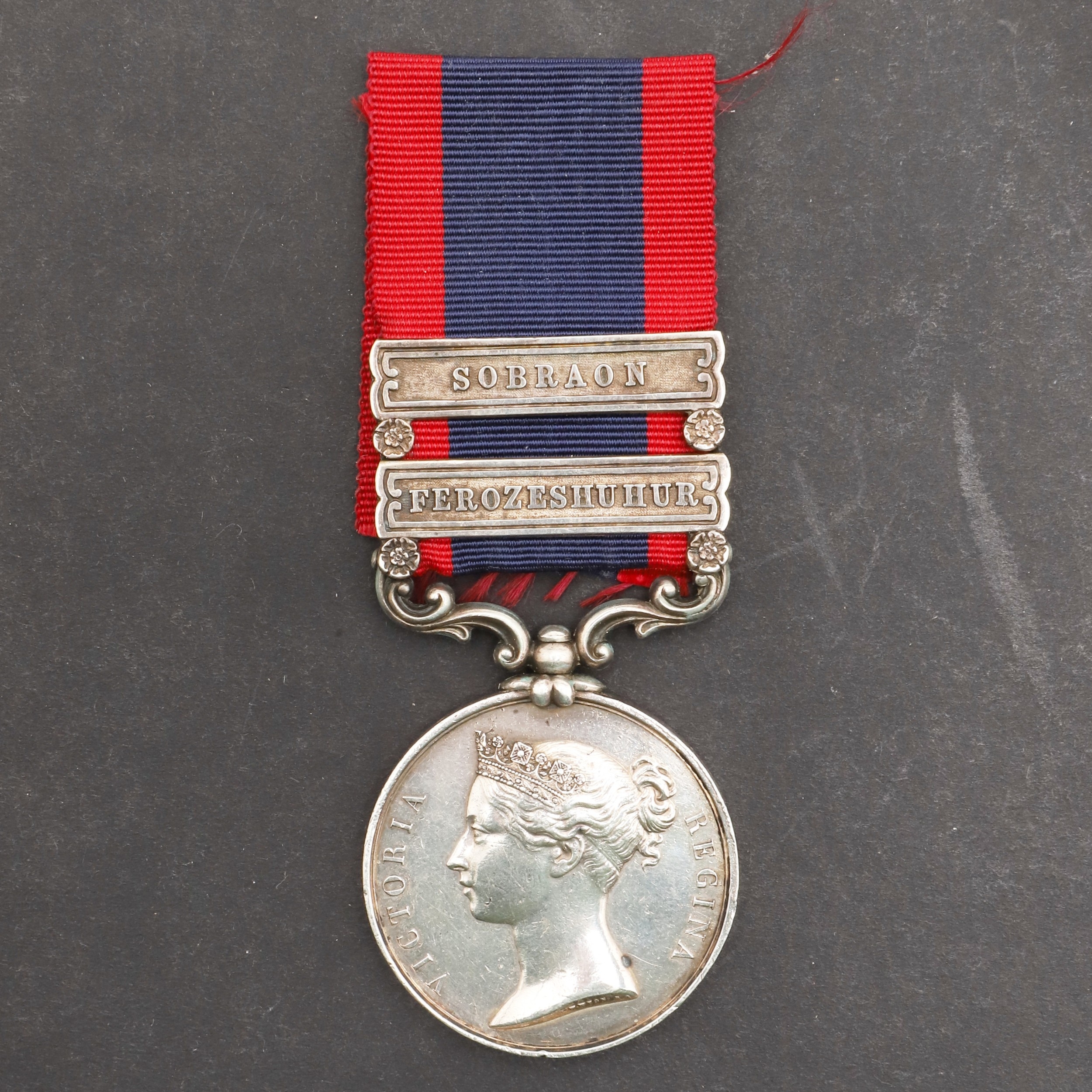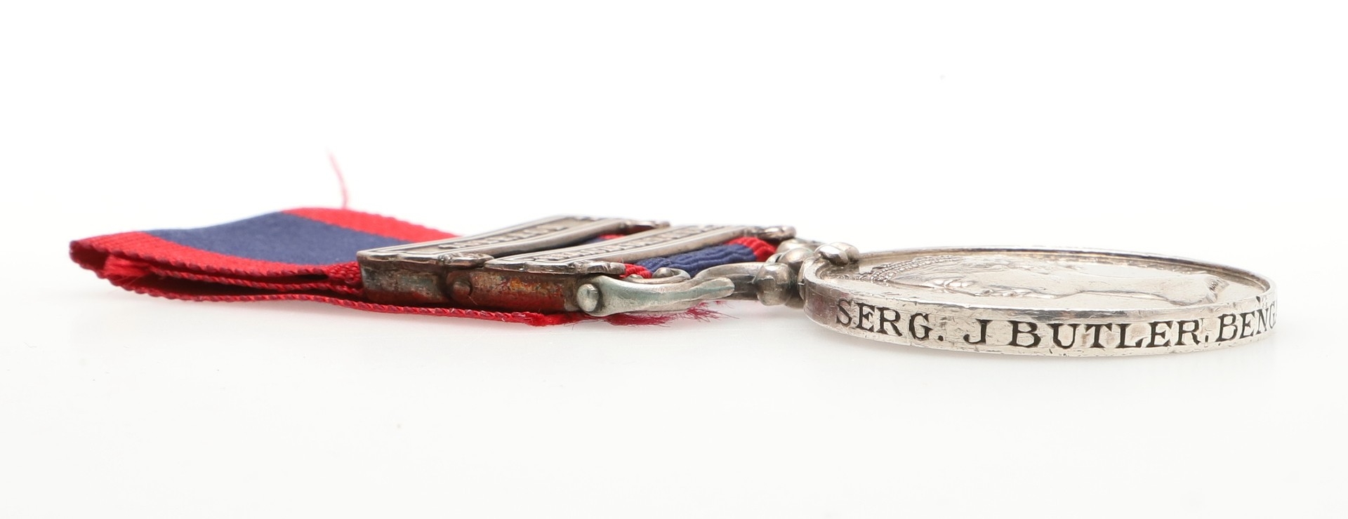 A SUTLEJ MEDAL 1845 -46 WITH MOODKEE 1845 REVERSE AND TWO CLASPS TO THE BENGAL ARTILLERY. A Sutlej medal with Moodkee 1845 reverse with Ferozeshuhur and Sobraon clasps, named to Serg J. Butler Bengal Artillery. Butler was born in Bethnal Green in 1814 and enlisted at Westminster on the 24th January 1832. Serving for 21 years in India, he was discharged in September 1853.