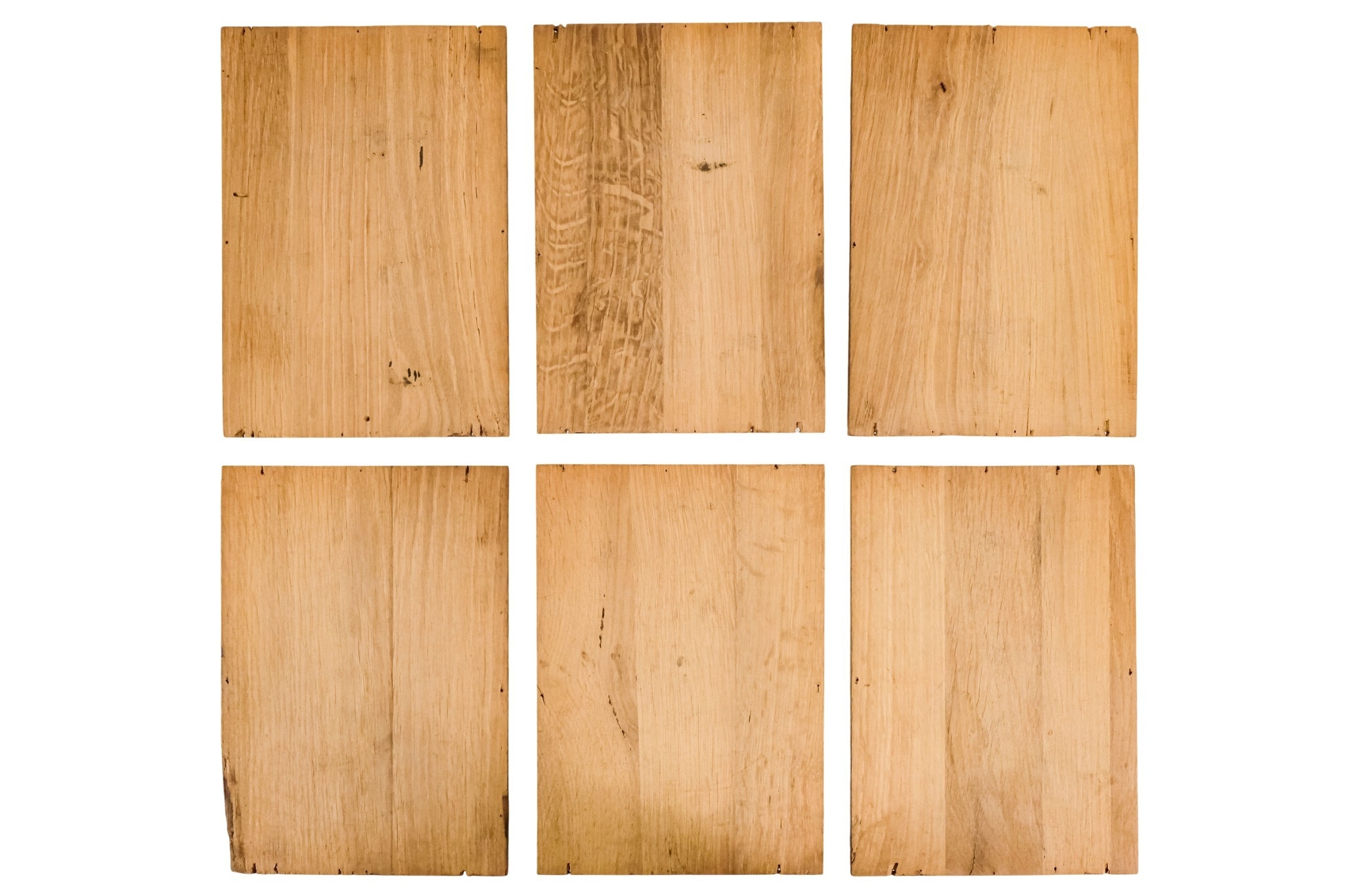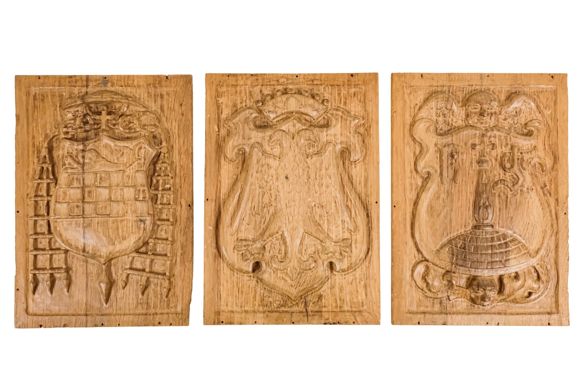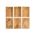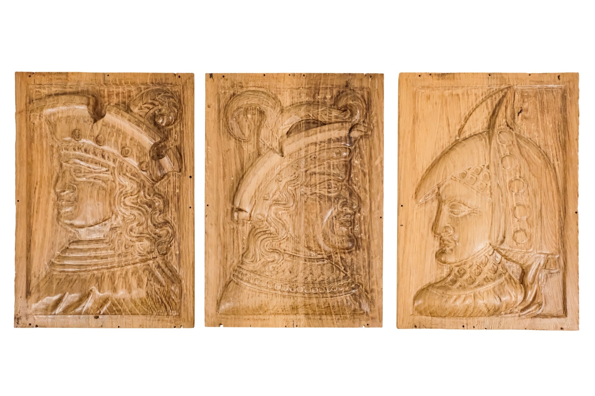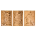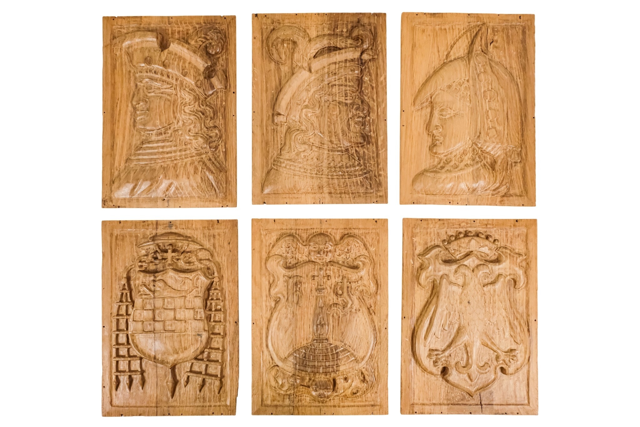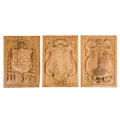 A group of six 15th century style carved oak panels - decorated with pseudo family coats of arms, 19 x 27cm.