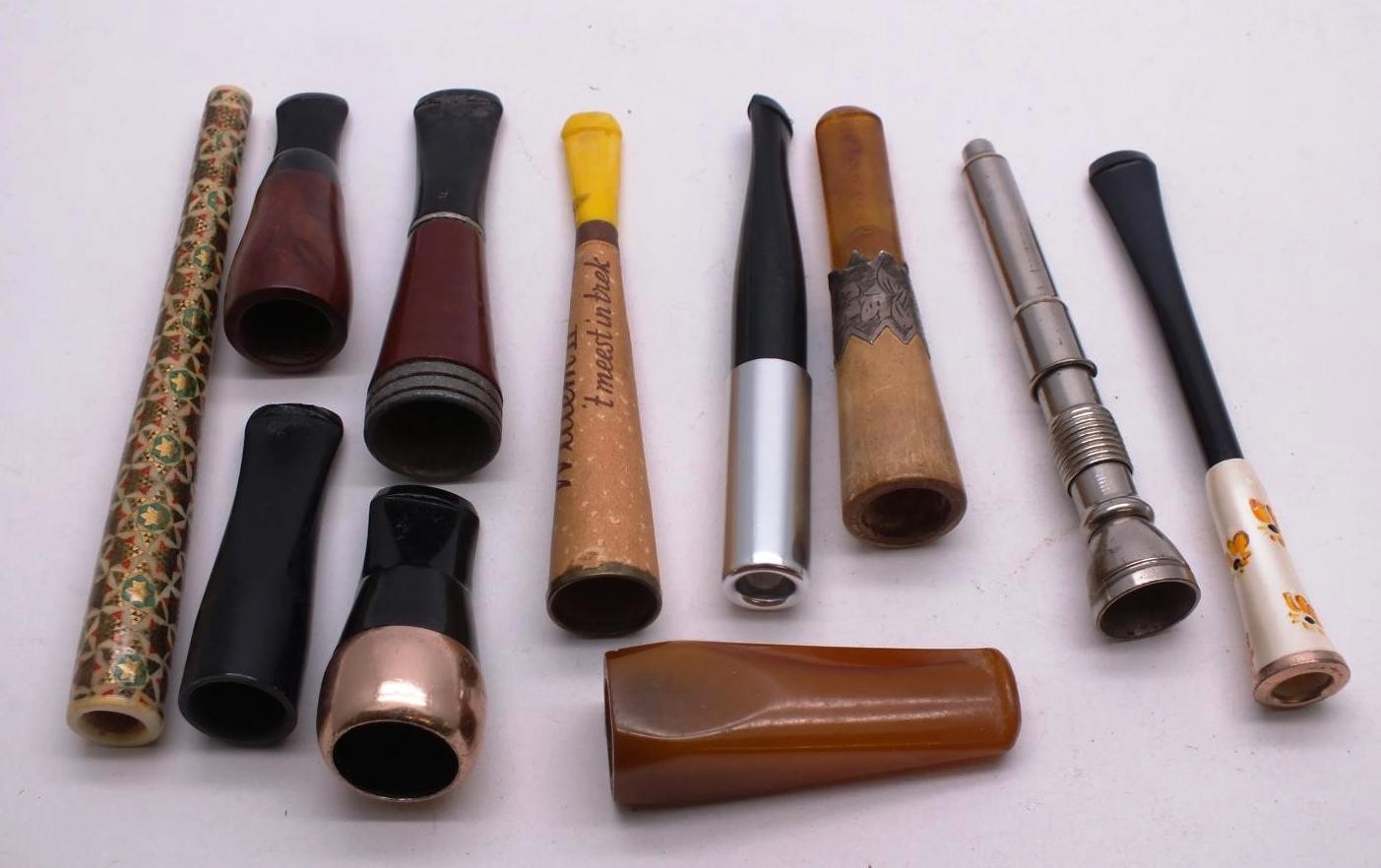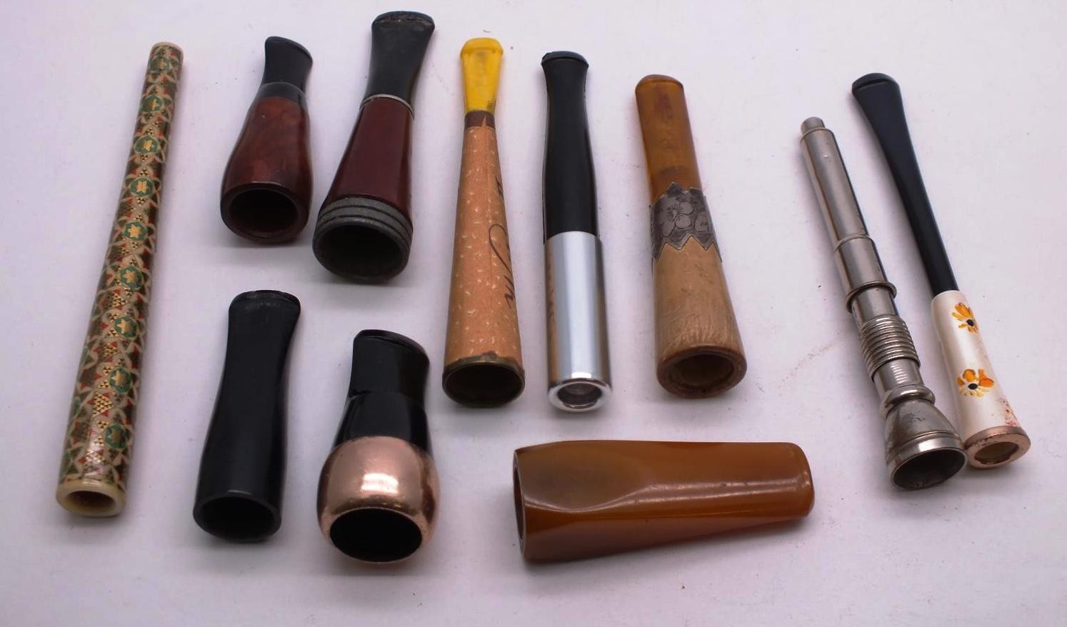 TEN VINTAGE CHEROOTS INCLUDES SILVER BANDED, ROLLED GOLD AND AMBER