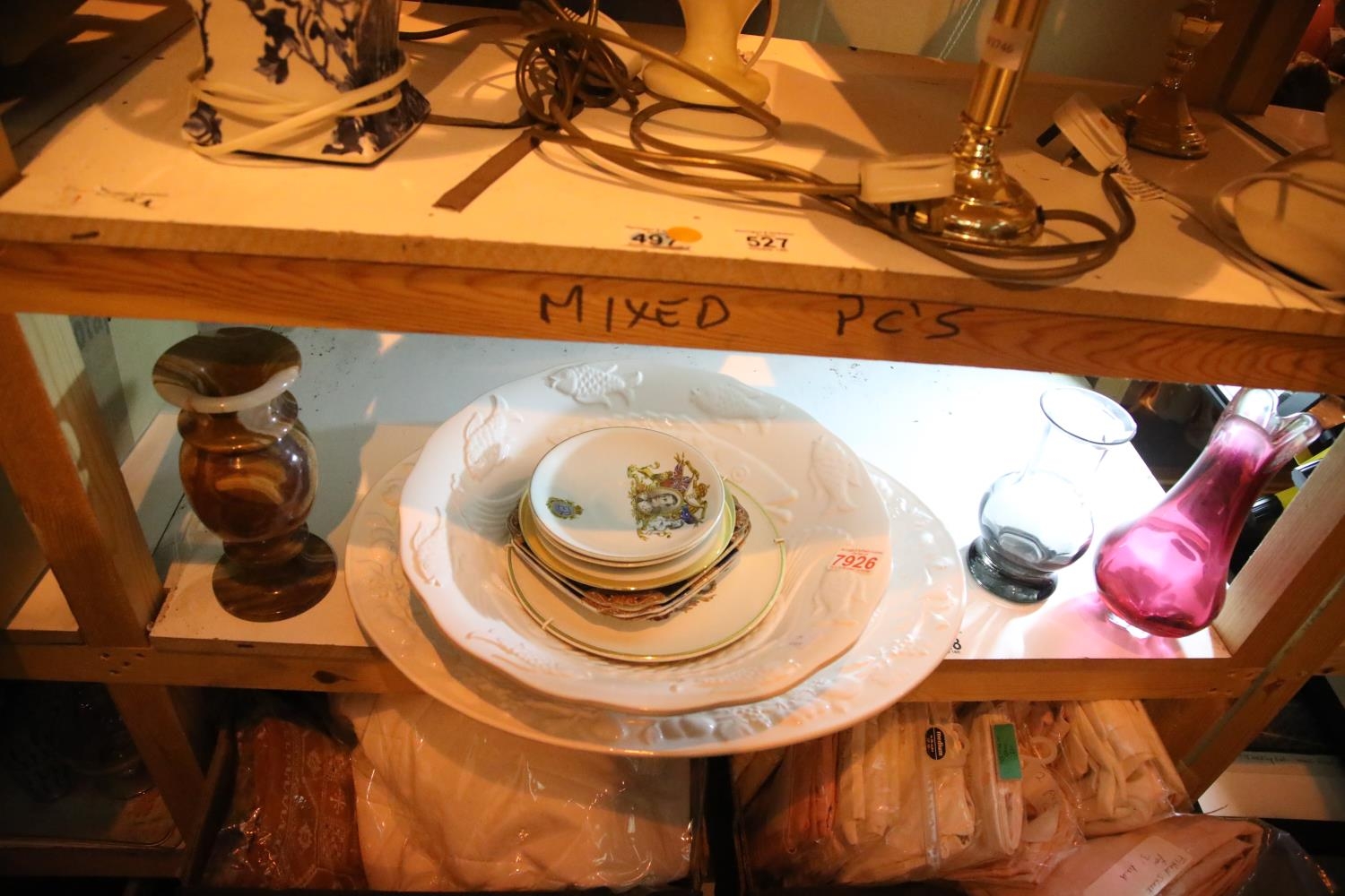 Mixed ceramics, glass and an onyx vase. Not available for in-house P&P.