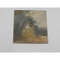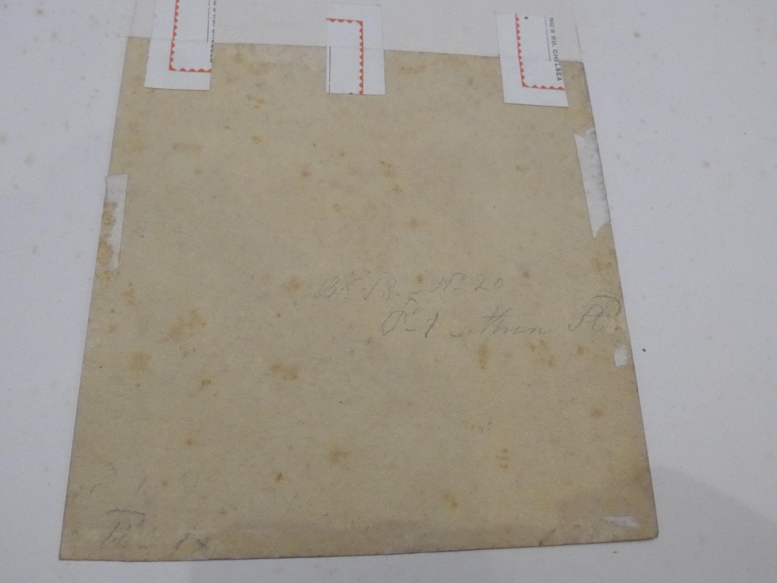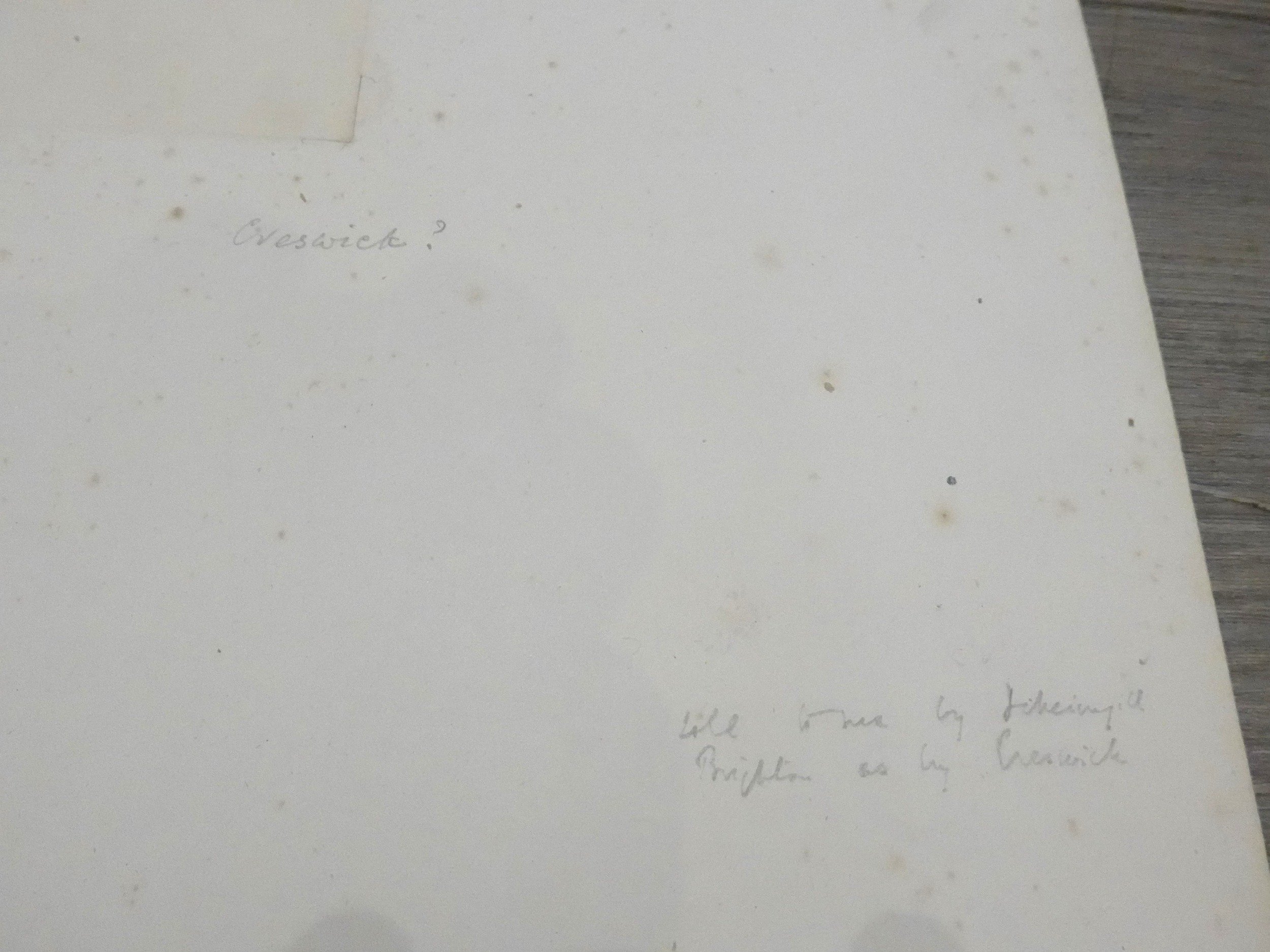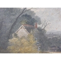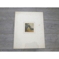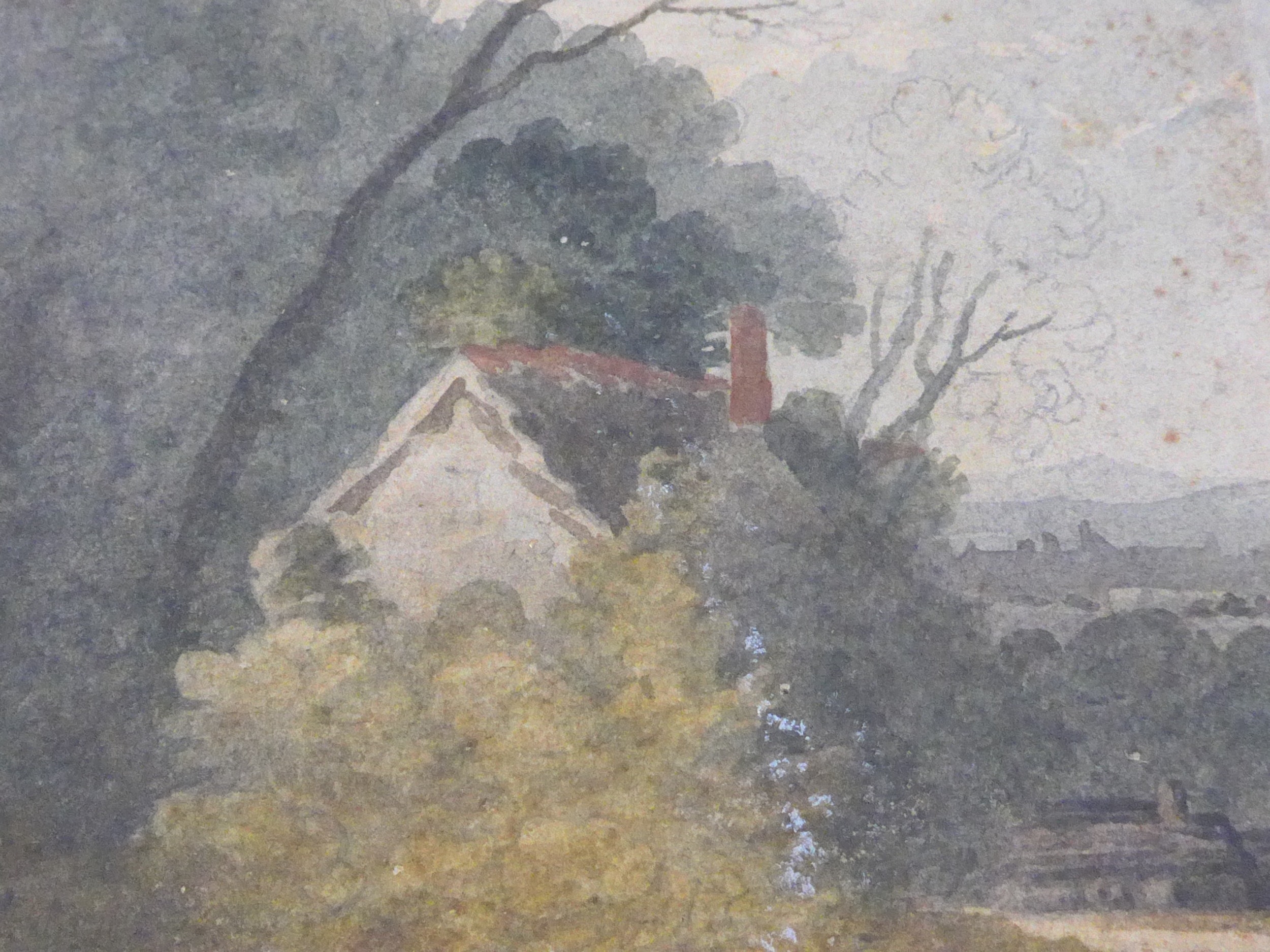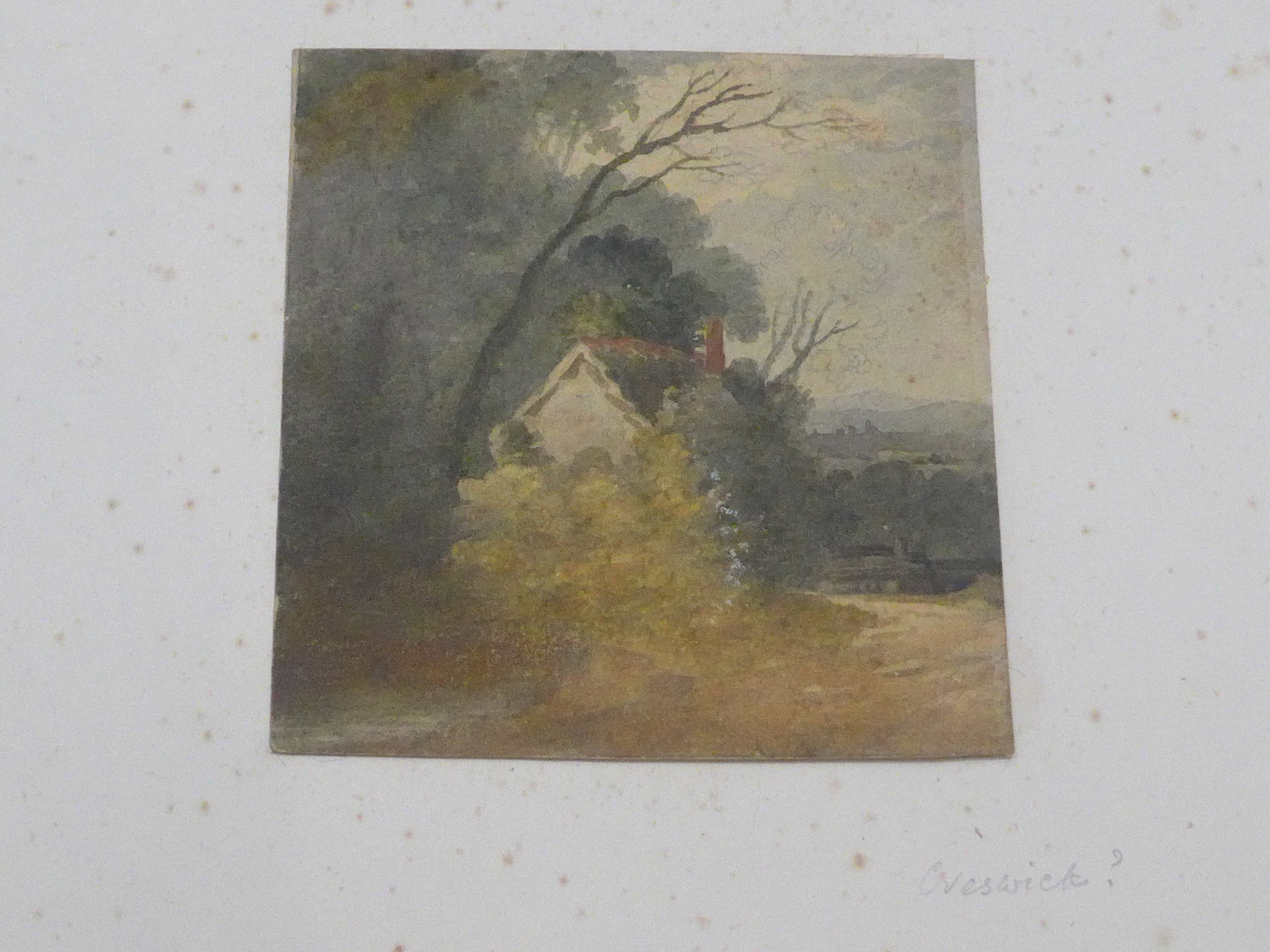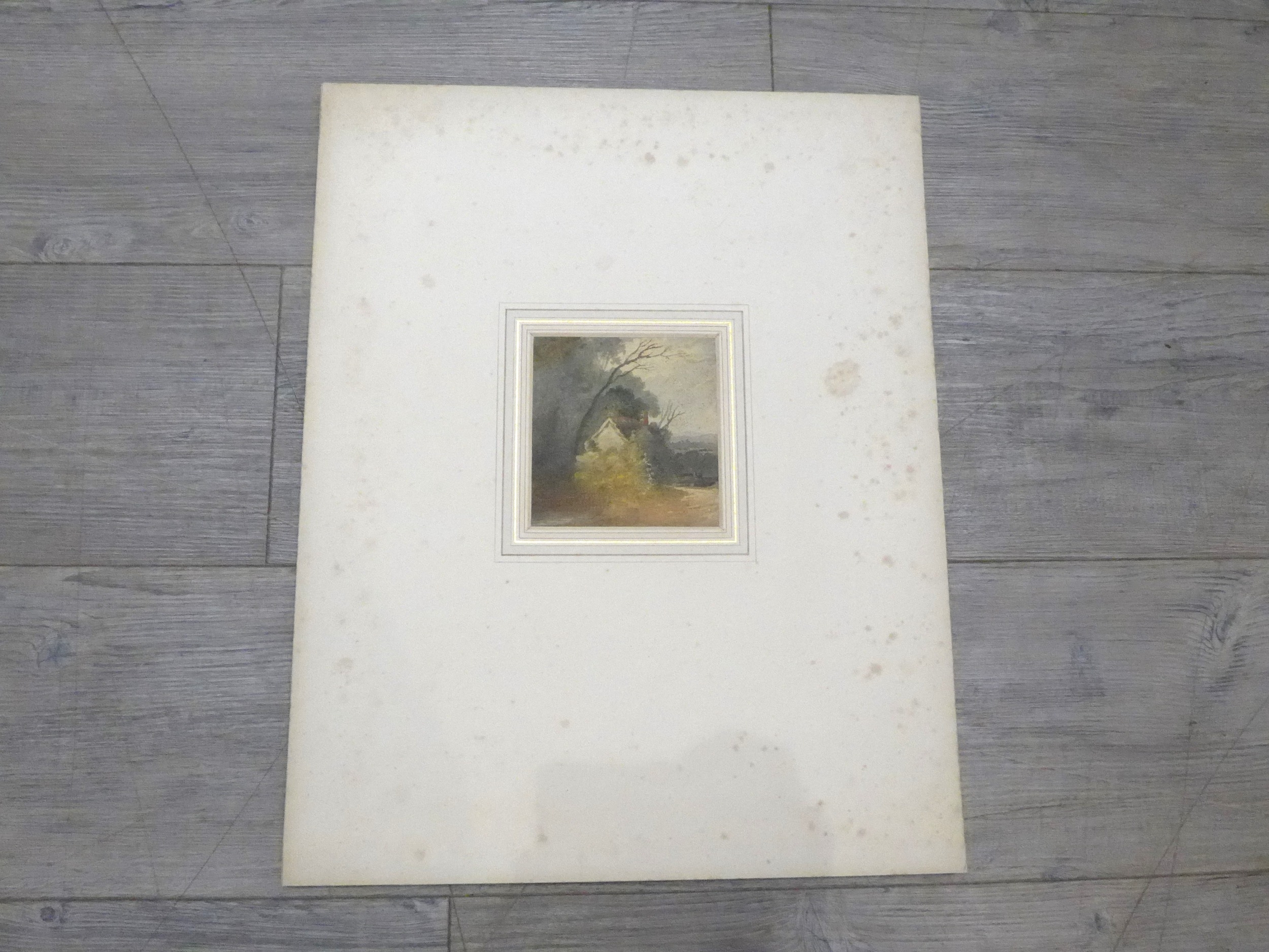A small 19th Century watercolour in the manner of Thomas Creswick, cottage in landscape. Unsigned. Mounted with notes by Henry Potter Stevens (1875-1965) Image size 12.2cm x 12cm, overall size 50.5cm x 40.5cm. Provenance - From the collection of Henry Potter Stevens (1875-1965)