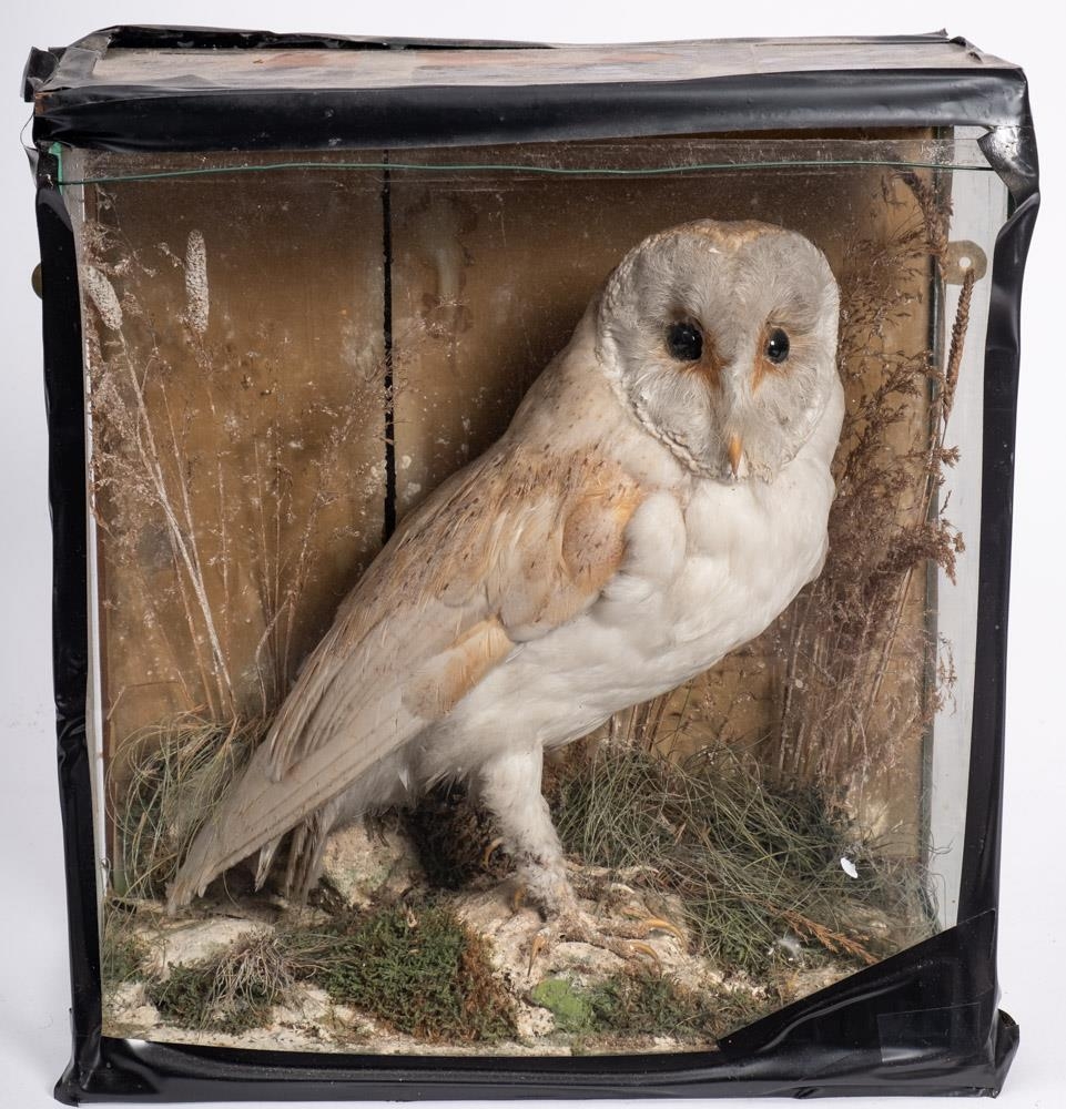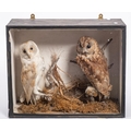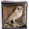 An early 20th century taxidermy case of a pair of owls: unsigned, naturally set in a glazed case, 42 x 53 x18cm, together with a single cased Barn Owl, 33 x 30 x 16cm (2)
