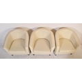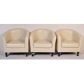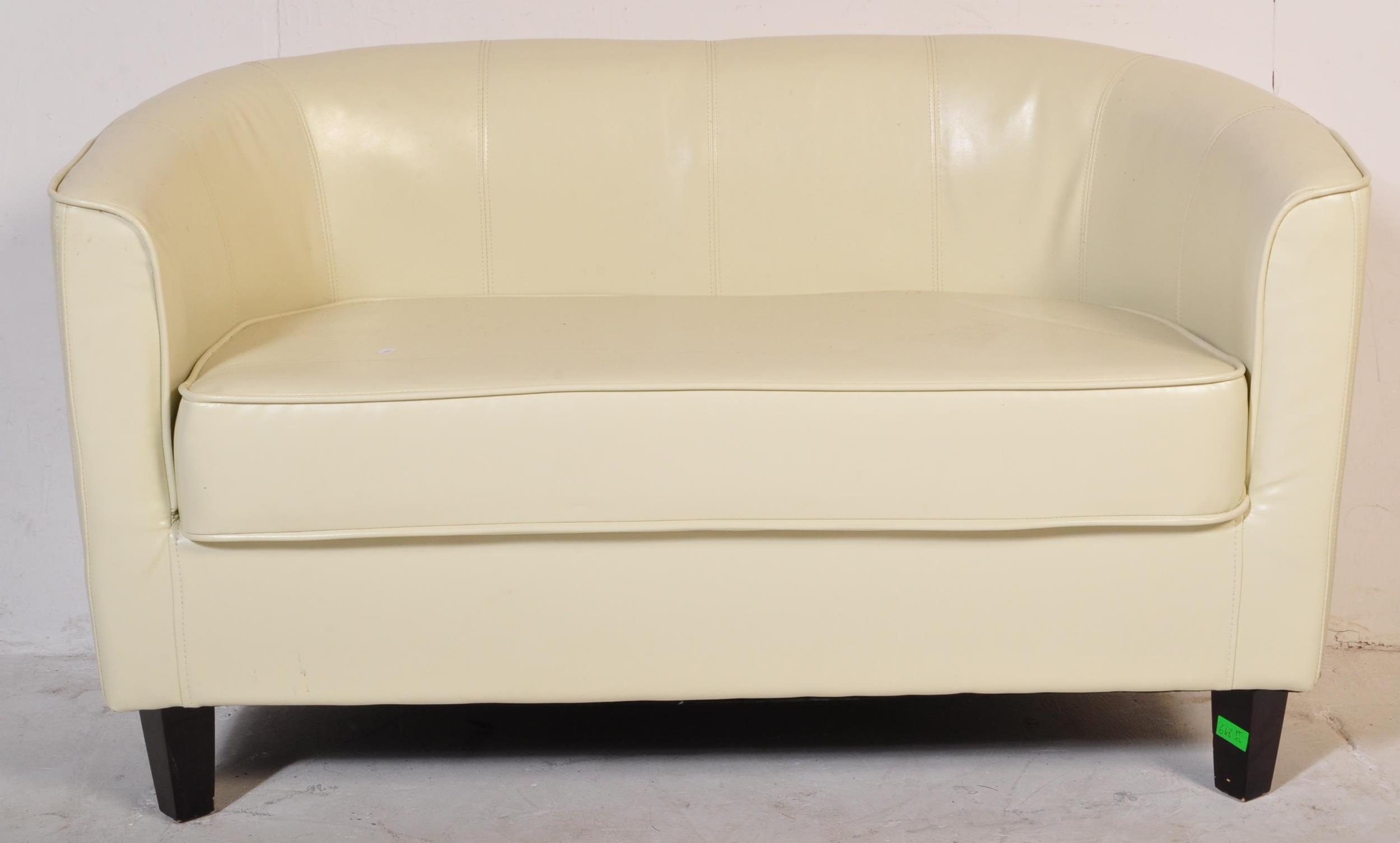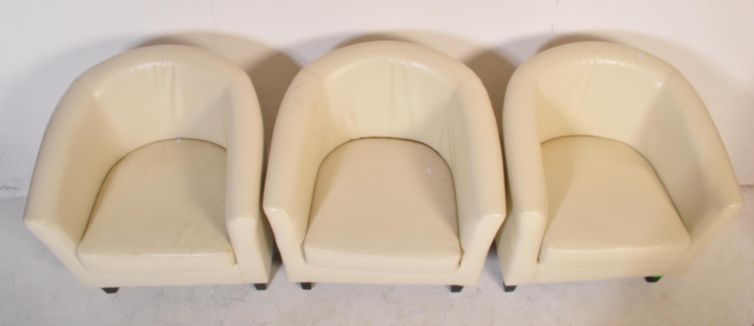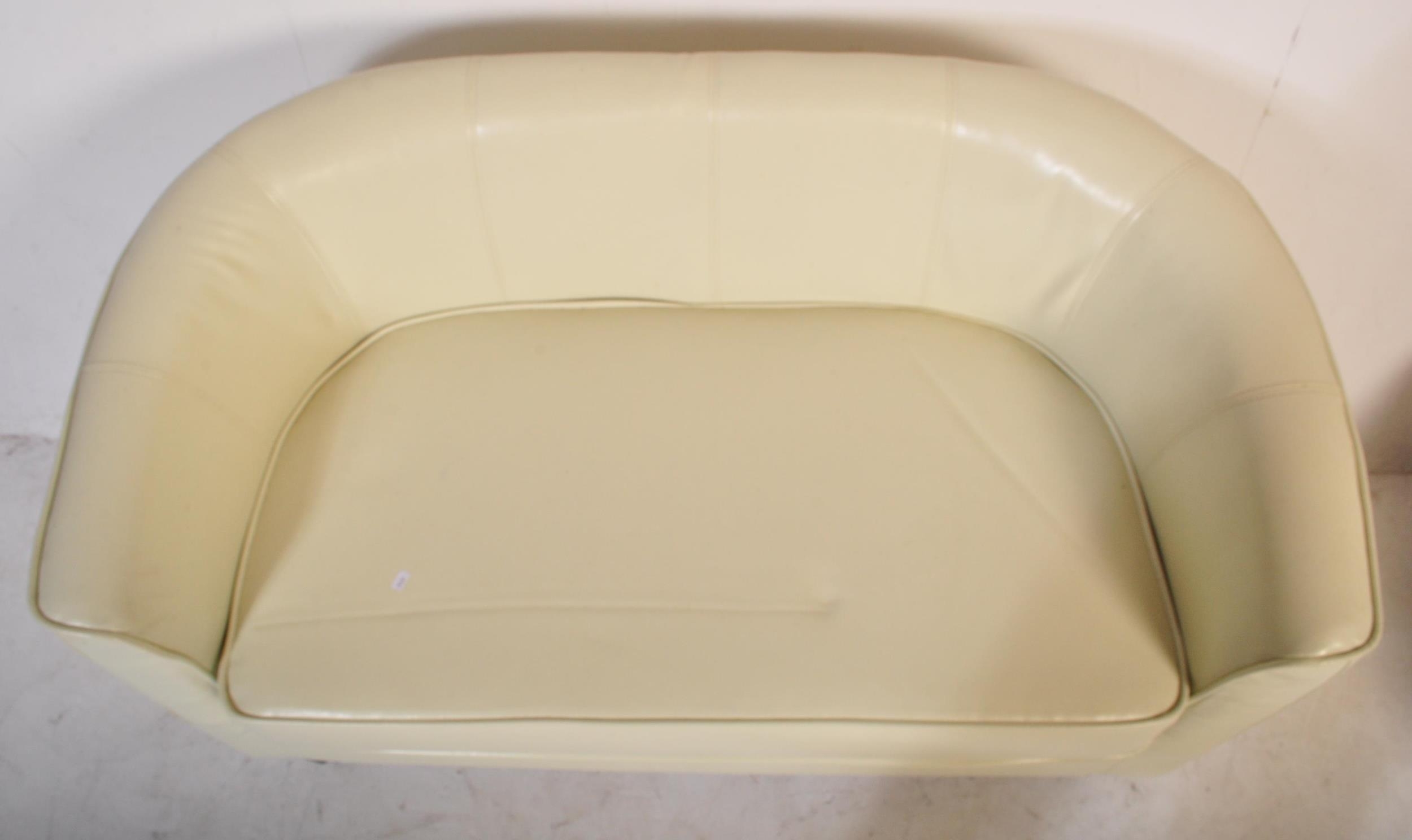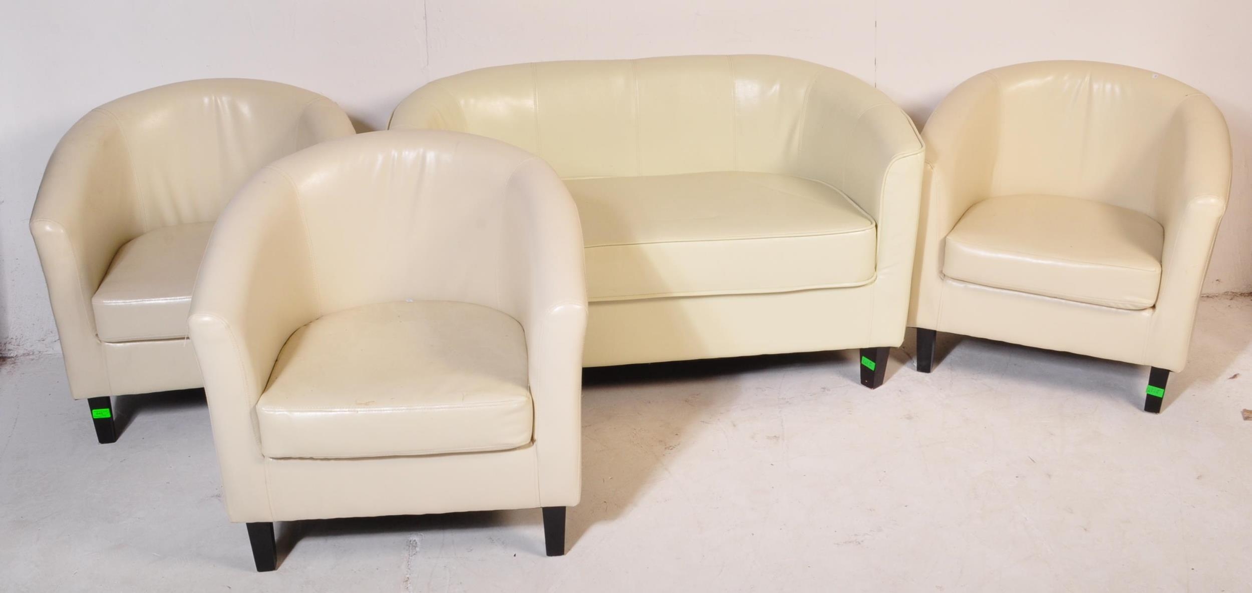 A retro vintage 20th Century white faux leather stitched club / fireside lounge suite comprising of a two seater sofa, together with three armchairs in the Aviation style.