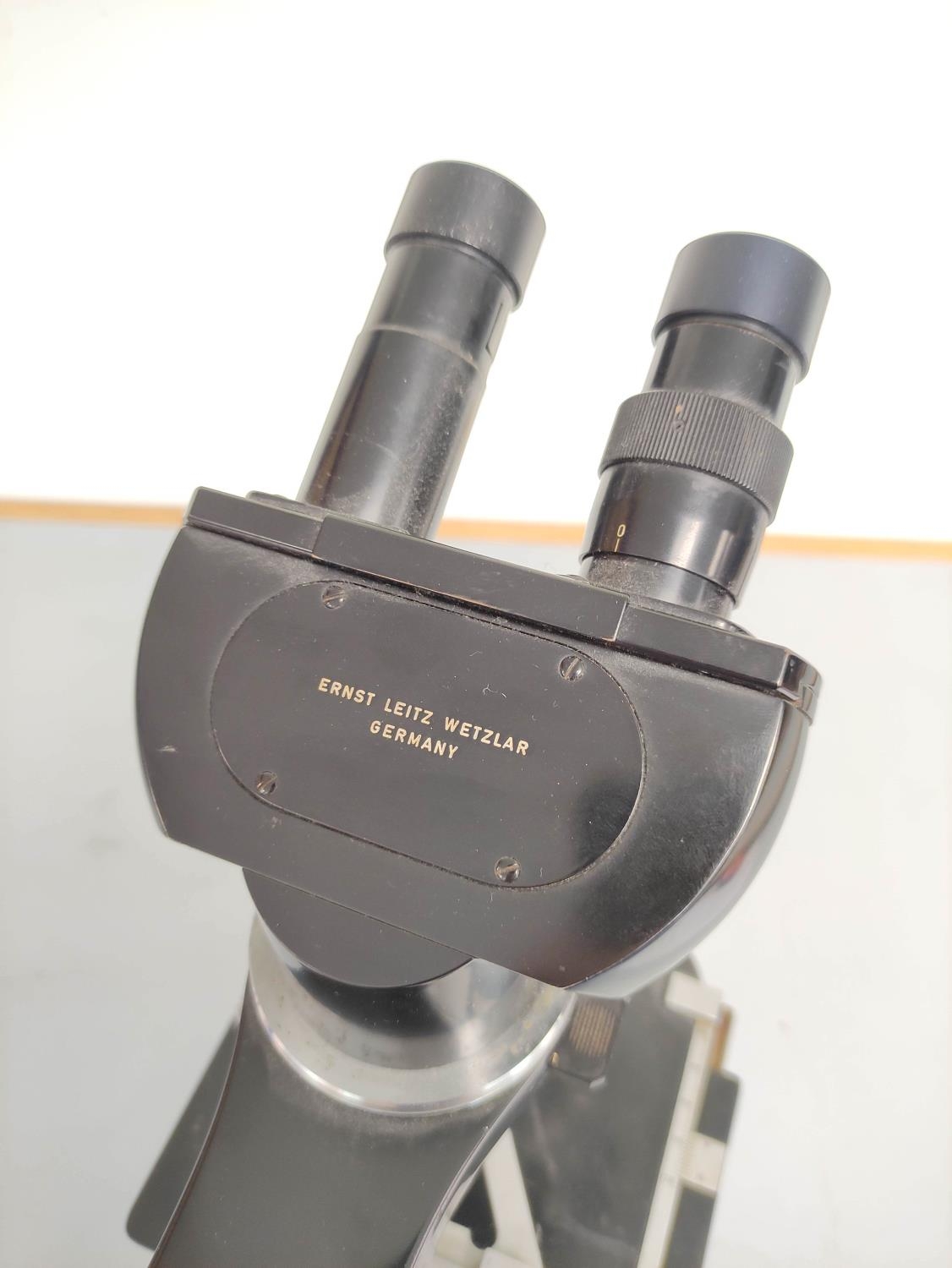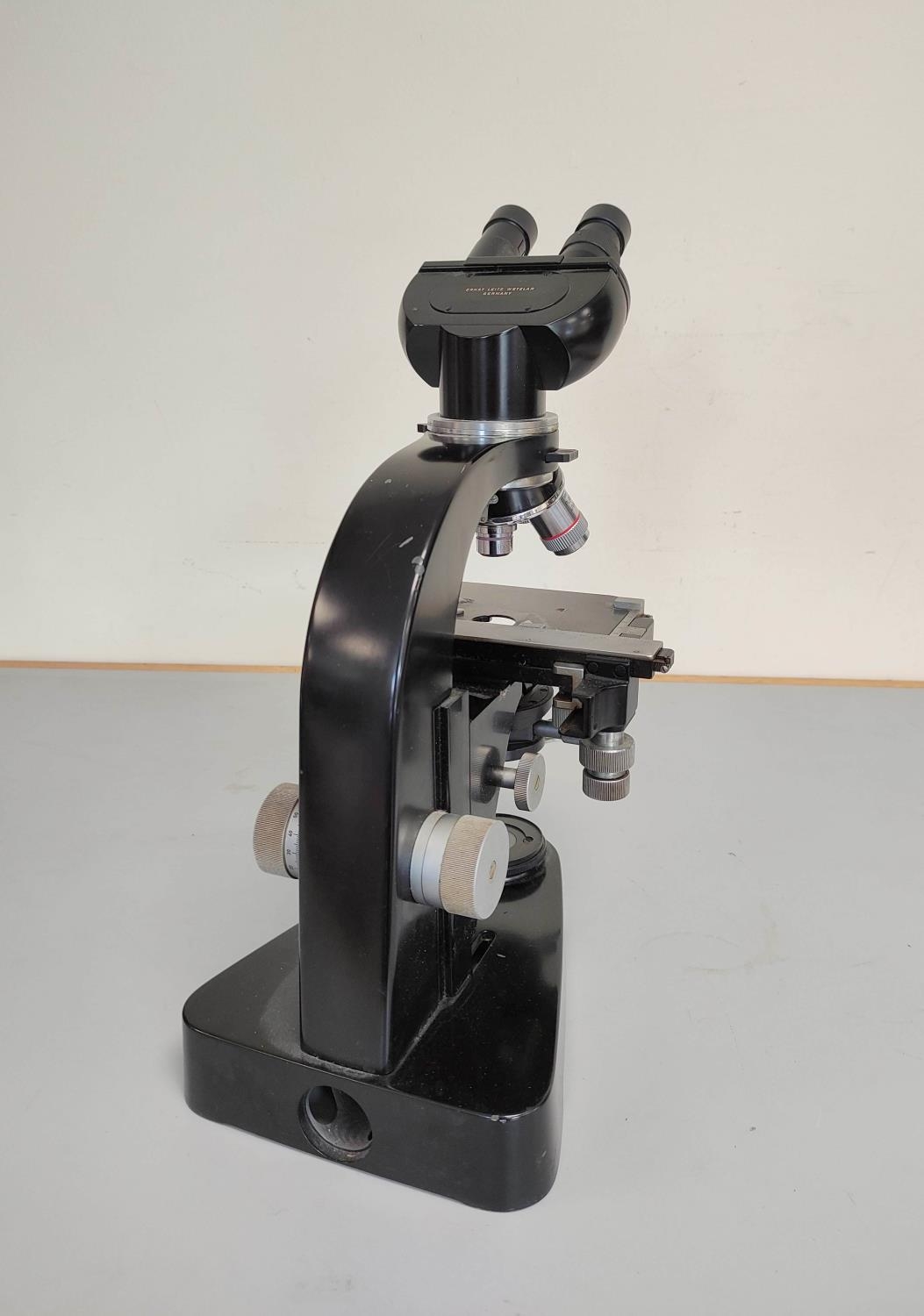 Vintage Ernst Leitz Wetzlar binocular microscope with four rotating lenses. Lacking power supply and reflecting mirror. H38cm