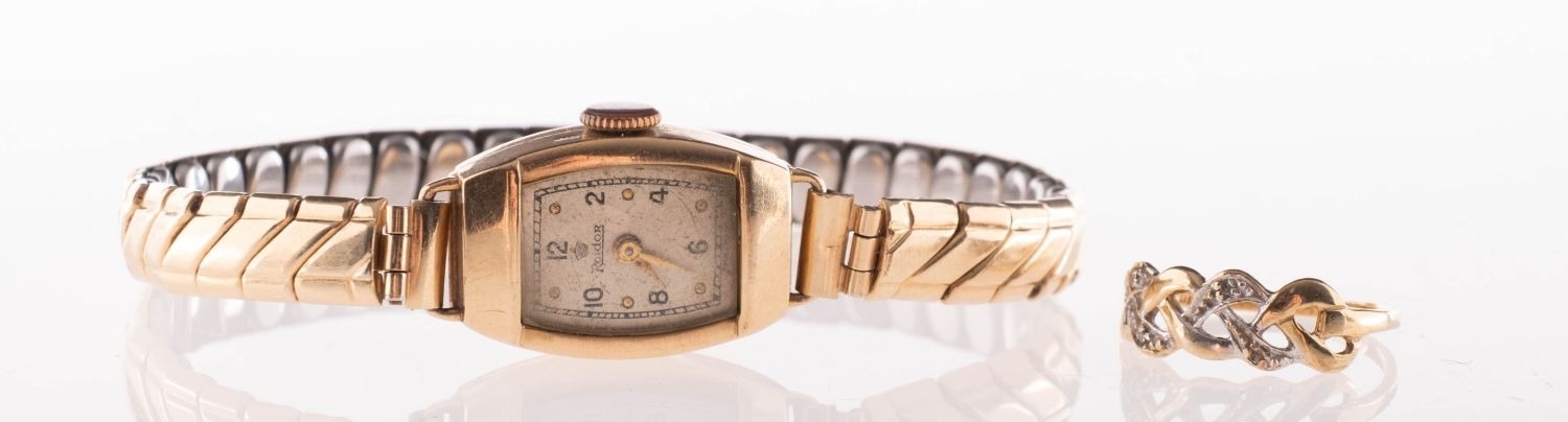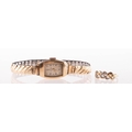 Roldor, a 9K gold lady's wristwatch the silvered cushion dial having Arabic numerals, gold hands and signed Roldor, the marked .375 to the side and hallmarked for 9K gold, Edinburgh 1945 along with the casemaker's initials B.W.C., for British Watch Cases Ltd of Pentonville Road, London N1, the movement stamped Swiss Made, 17 Jewels, with a rolled-gold expandable bracelet, diameter 15mm, gross weight c.17.96gs. With a ring marked Dia.