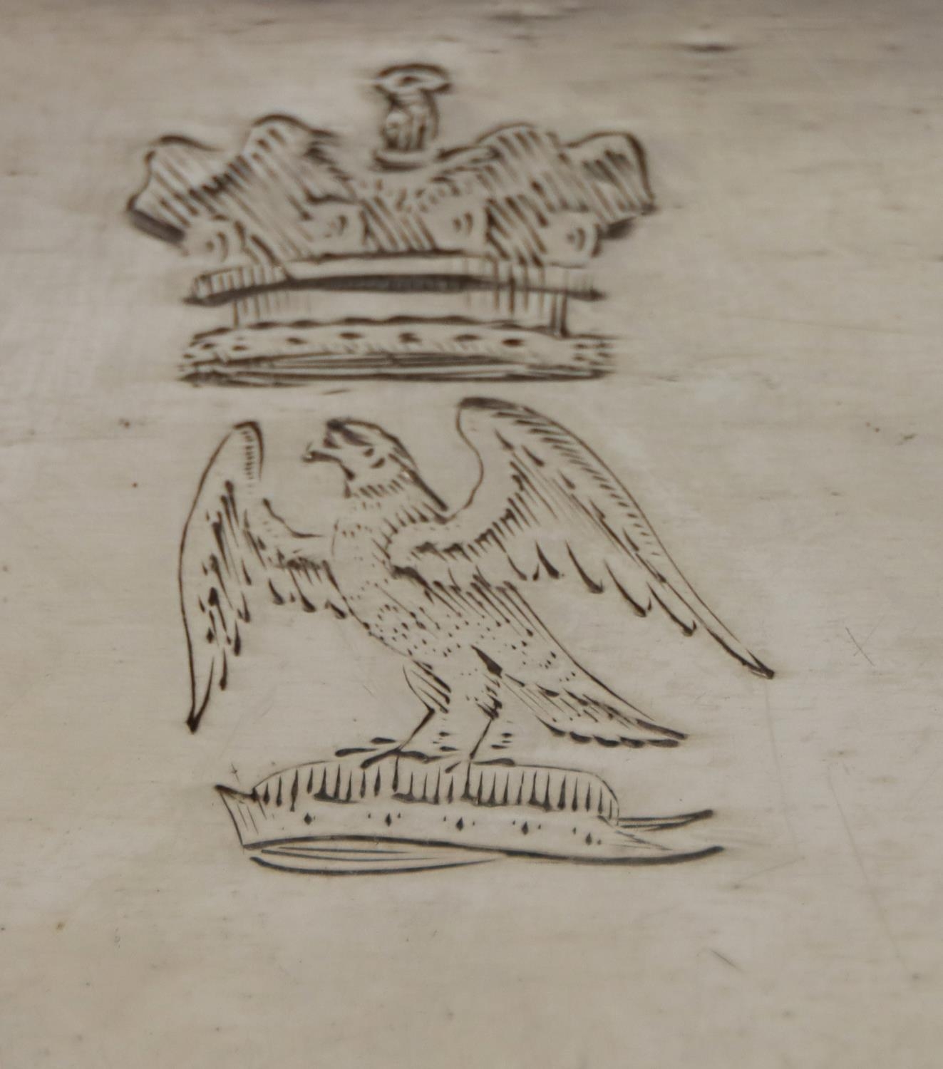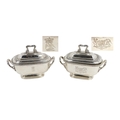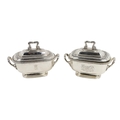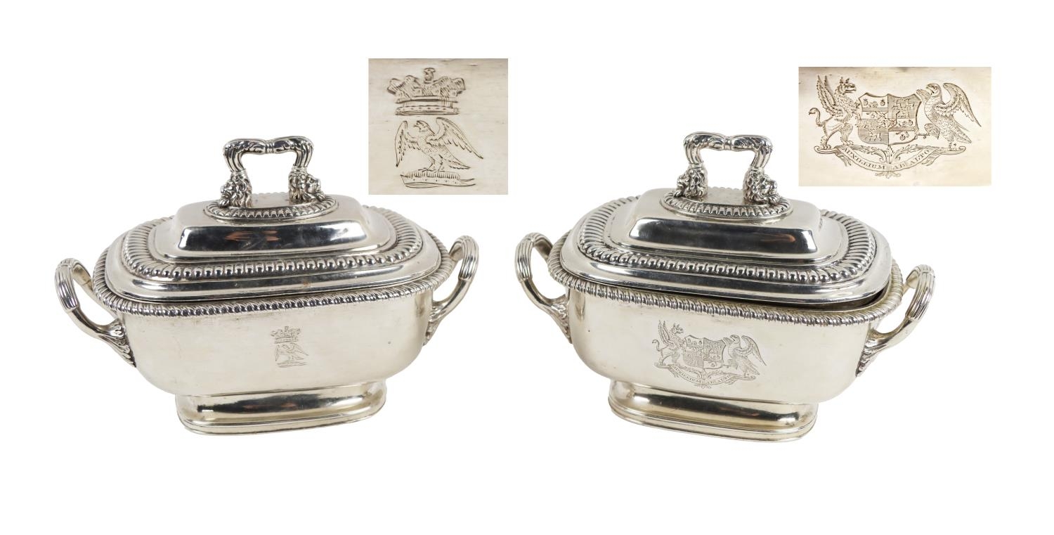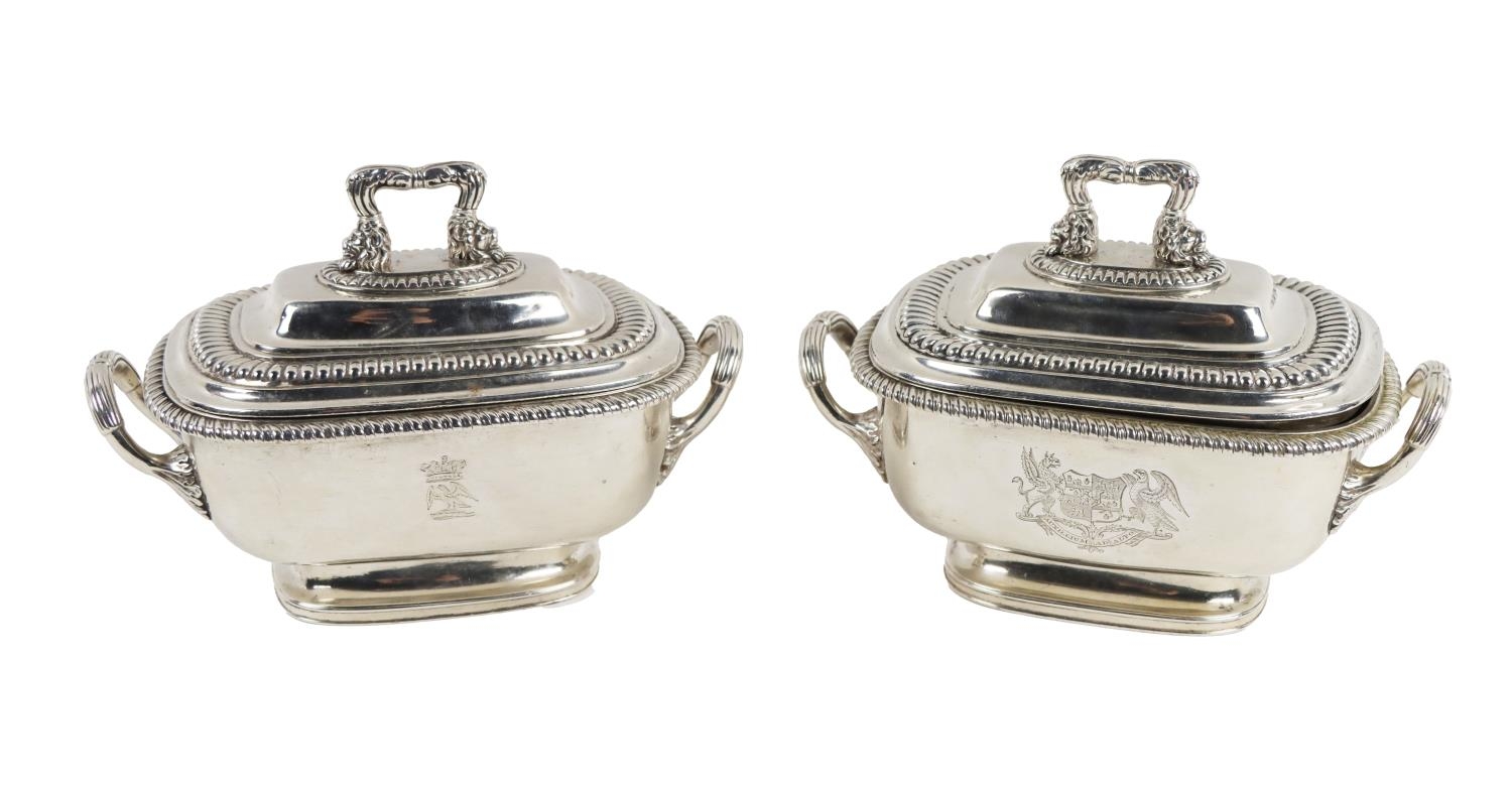 A pair of fine quality Georgian period English silver crested Vegetable Tureens and Covers, with ornate lift handles, gadroon edge, engraved crest for the arms of Robert 3rd Lord Clonbrock, on shaped bases, hallmarked London, Thomas Robins, 1810, each approx. 21cms (8 1/4") long, each 27.5 ounces. (2)