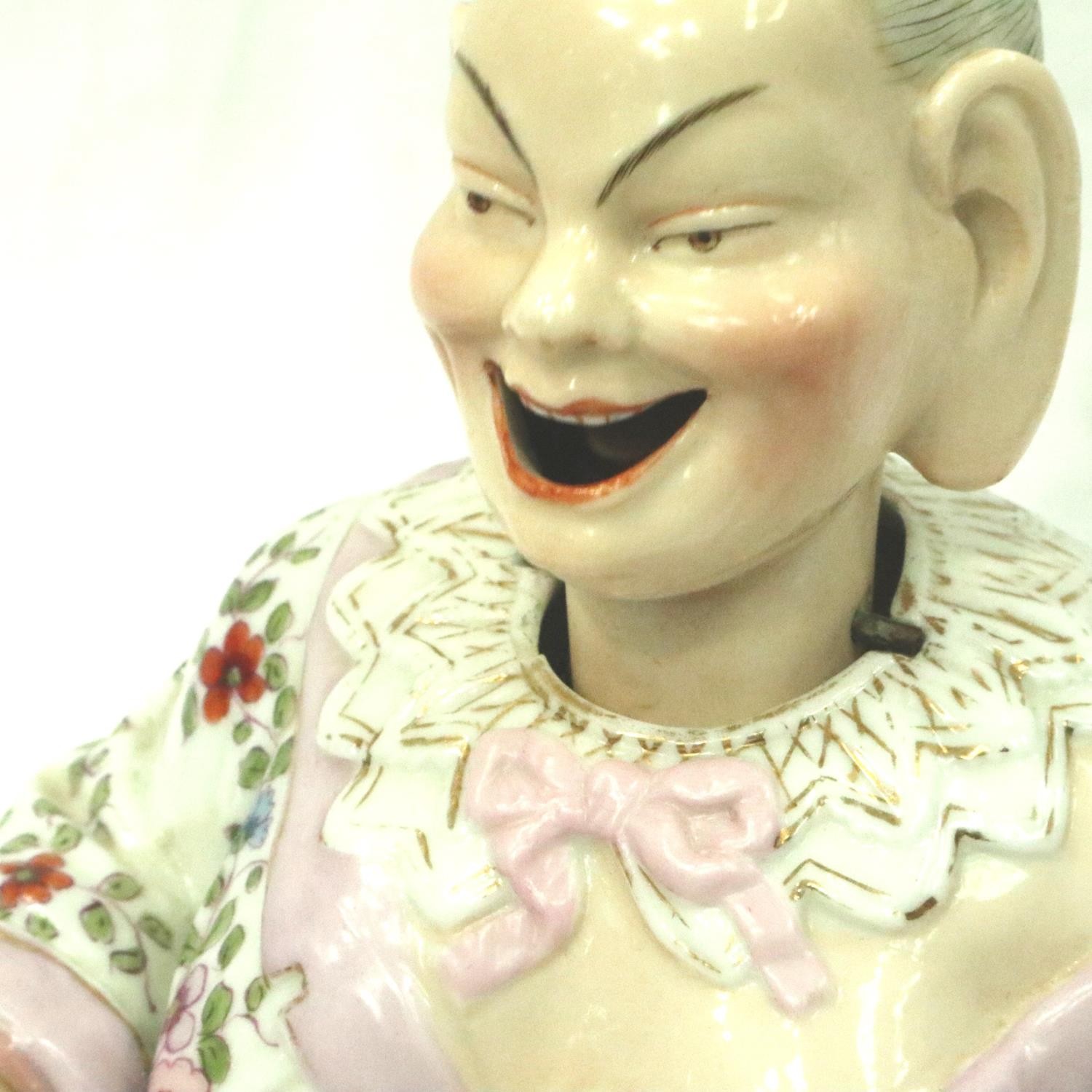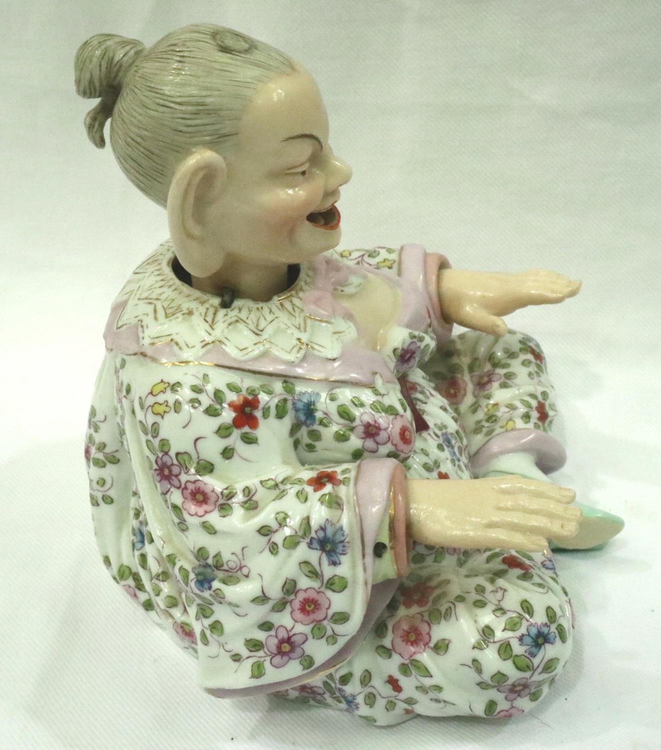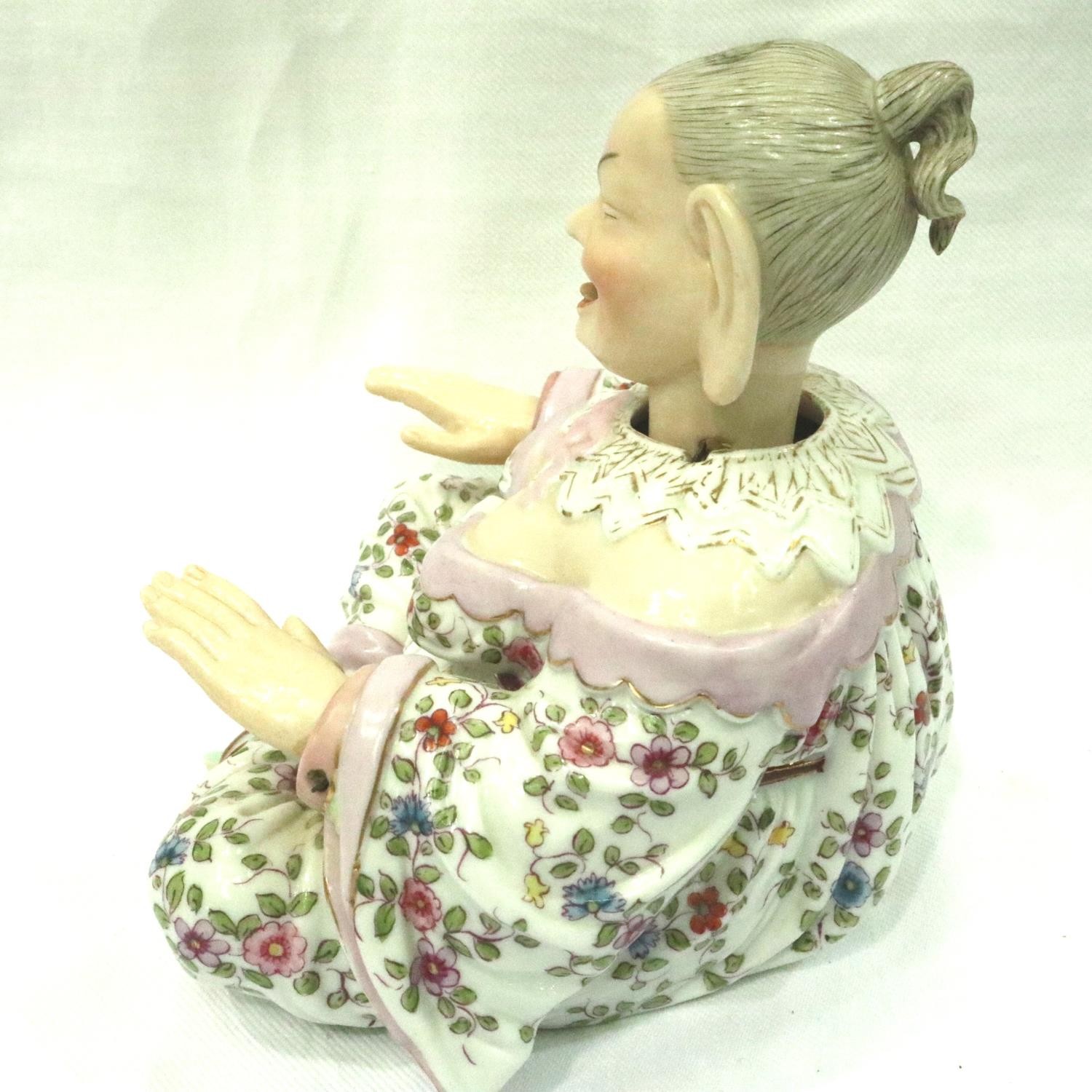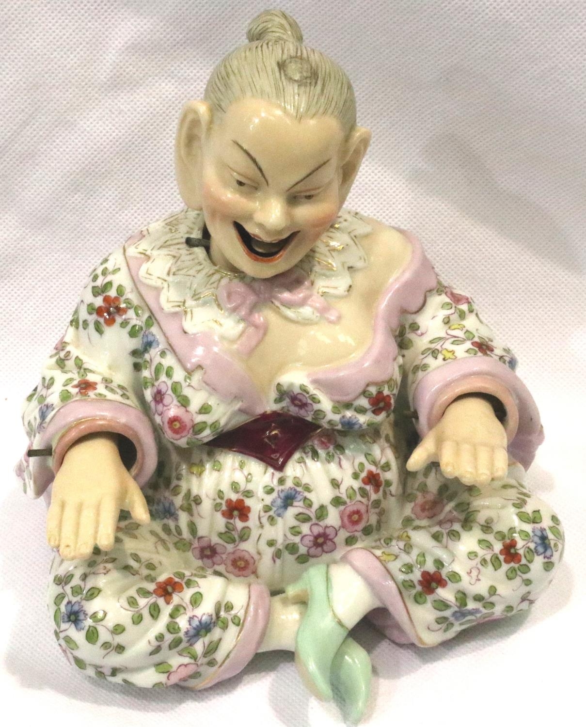 A late 19th Century German Ernst Bohne & Sohne porcelain nodding pagoda figure, with weighted nodding head with protruding tongue and waving hands, polychrome decorated with flowers with gilt highlights, H: 15 cm. Condition report: No damage with moving tongue hands and arms, the potter Bowie and Sons opened from 1850 so we would say around 1880. P&P Group 3 (£25+VAT for the first lot and £5+VAT for subsequent lots)