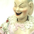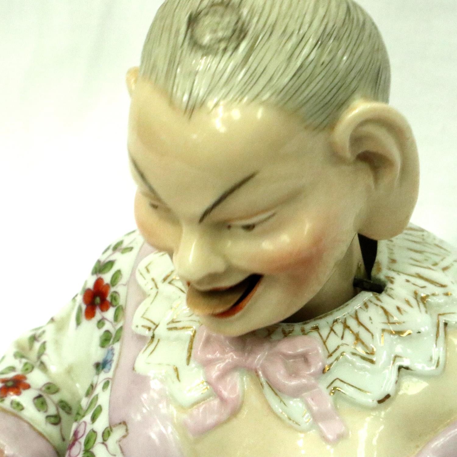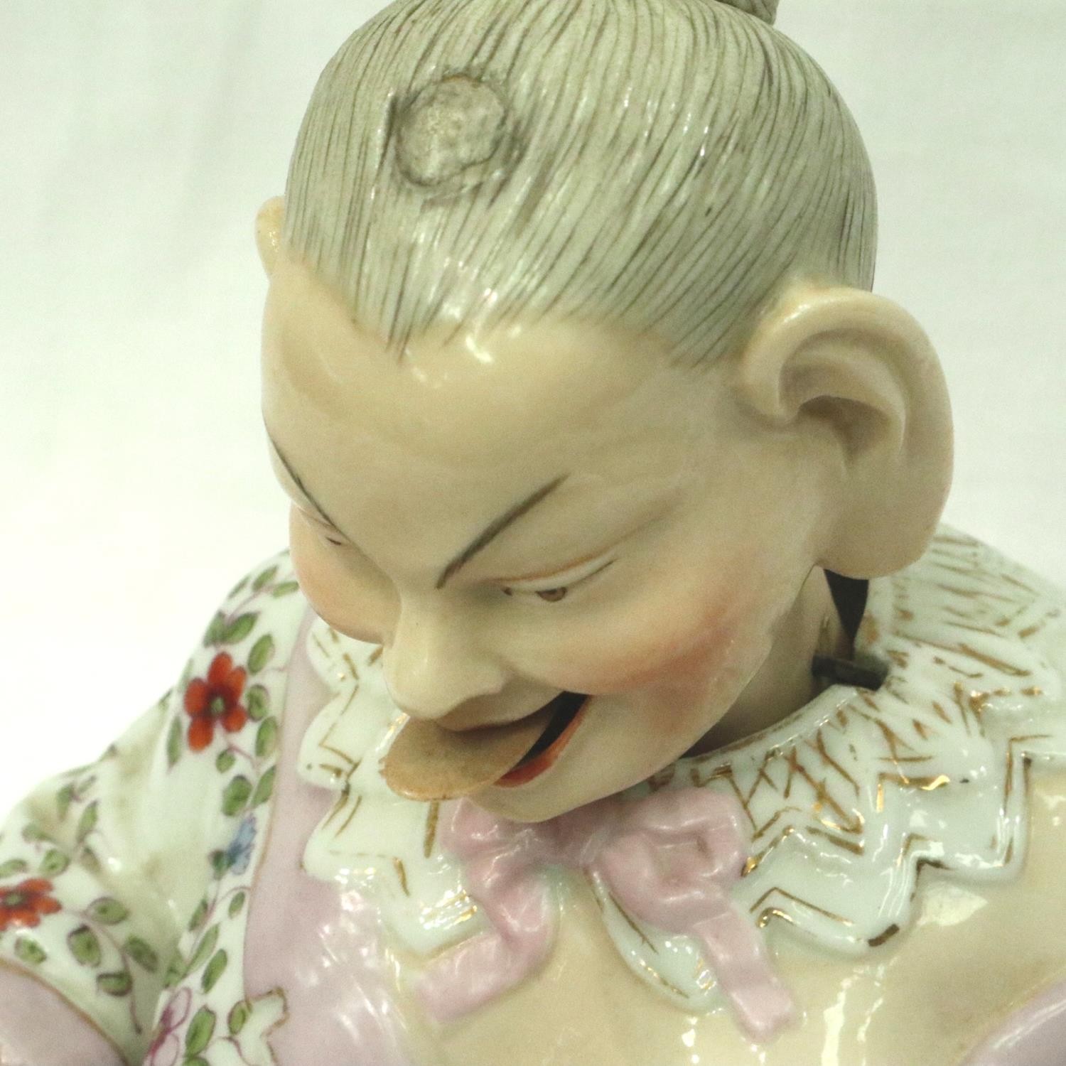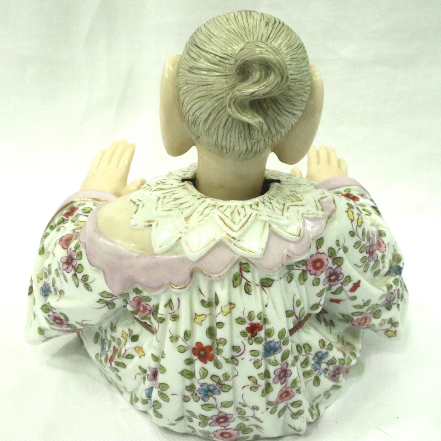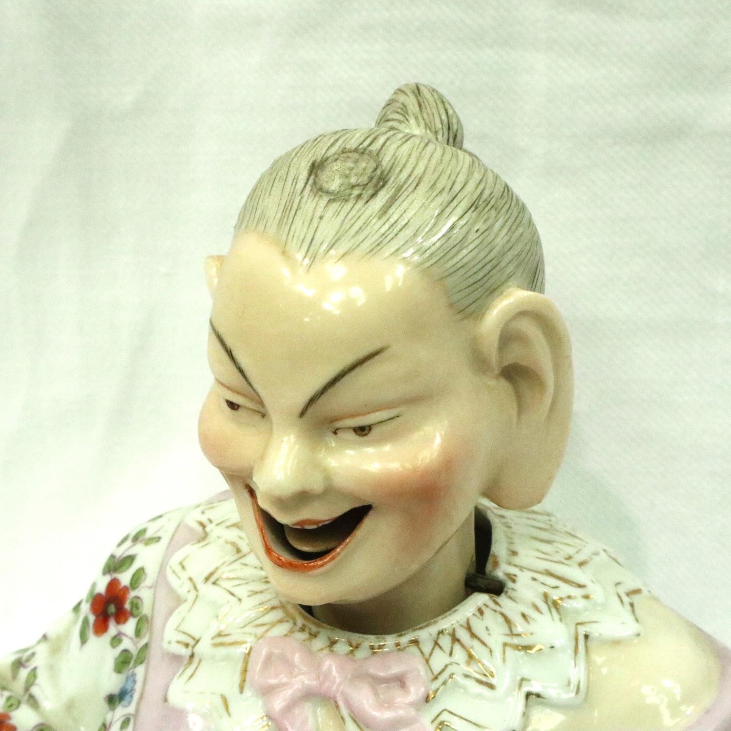 A late 19th Century German Ernst Bohne & Sohne porcelain nodding pagoda figure, with weighted nodding head with protruding tongue and waving hands, polychrome decorated with flowers with gilt highlights, H: 15 cm. Condition report: No damage with moving tongue hands and arms, the potter Bowie and Sons opened from 1850 so we would say around 1880. P&P Group 3 (£25+VAT for the first lot and £5+VAT for subsequent lots)