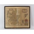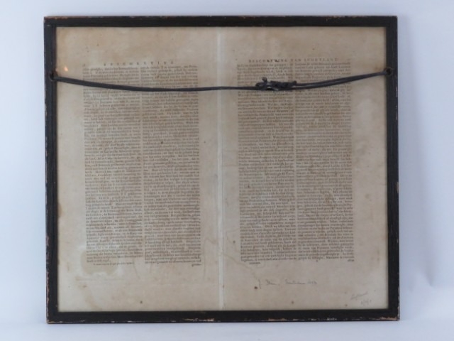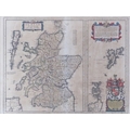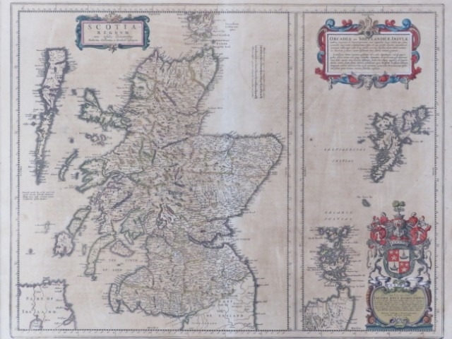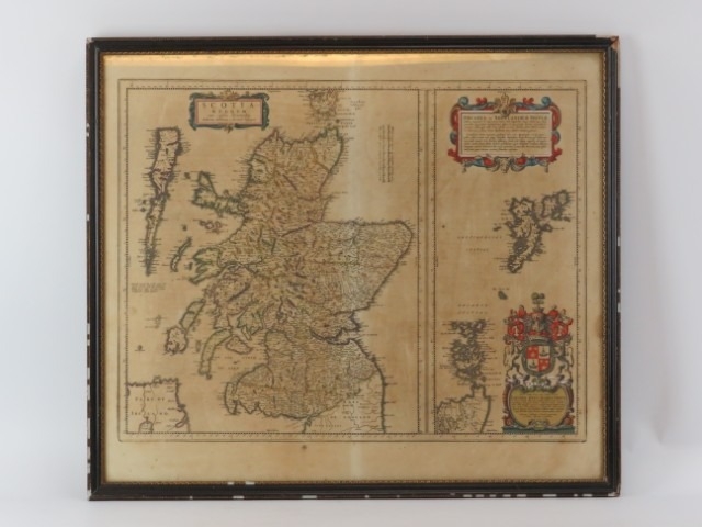 A hand coloured map of Scotland (Scotia Regnum) by Johannes Blaeu, mid 17th century. Entitled ‘Scotia Regnum cum insulis adjacentibus Robertus Gordonius a Straloch descripsit’. Framed and glazed to front and reverse. 49.5 cm x 57.5 cm.