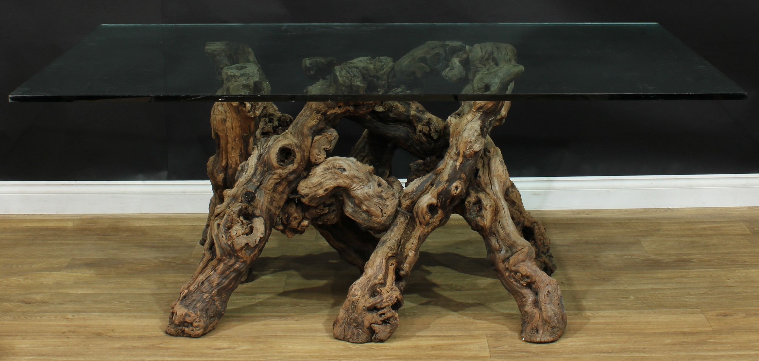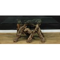 A rootwood table base, glass top, 74.5cm high, 180.5cm long, 107cm wide