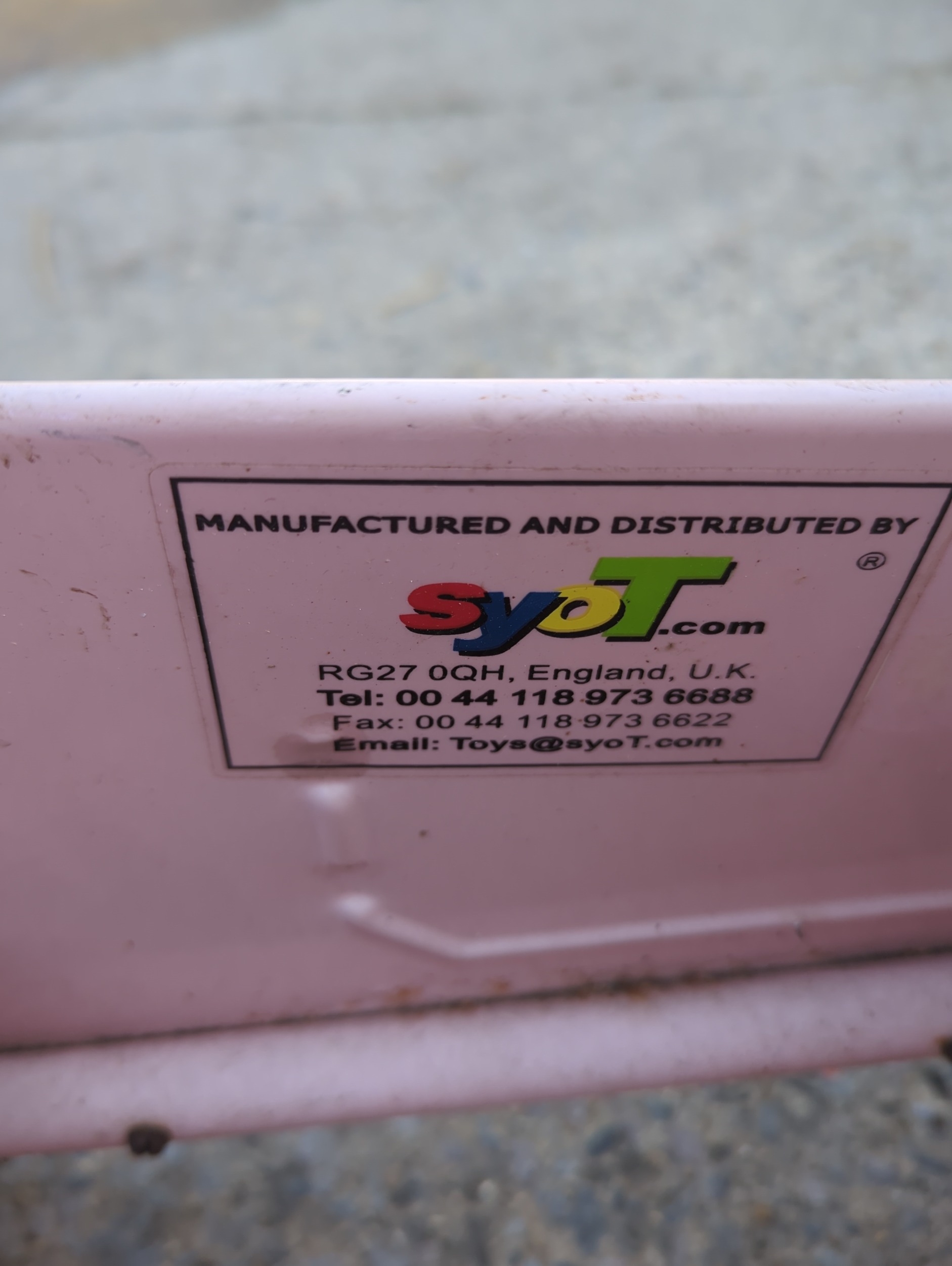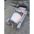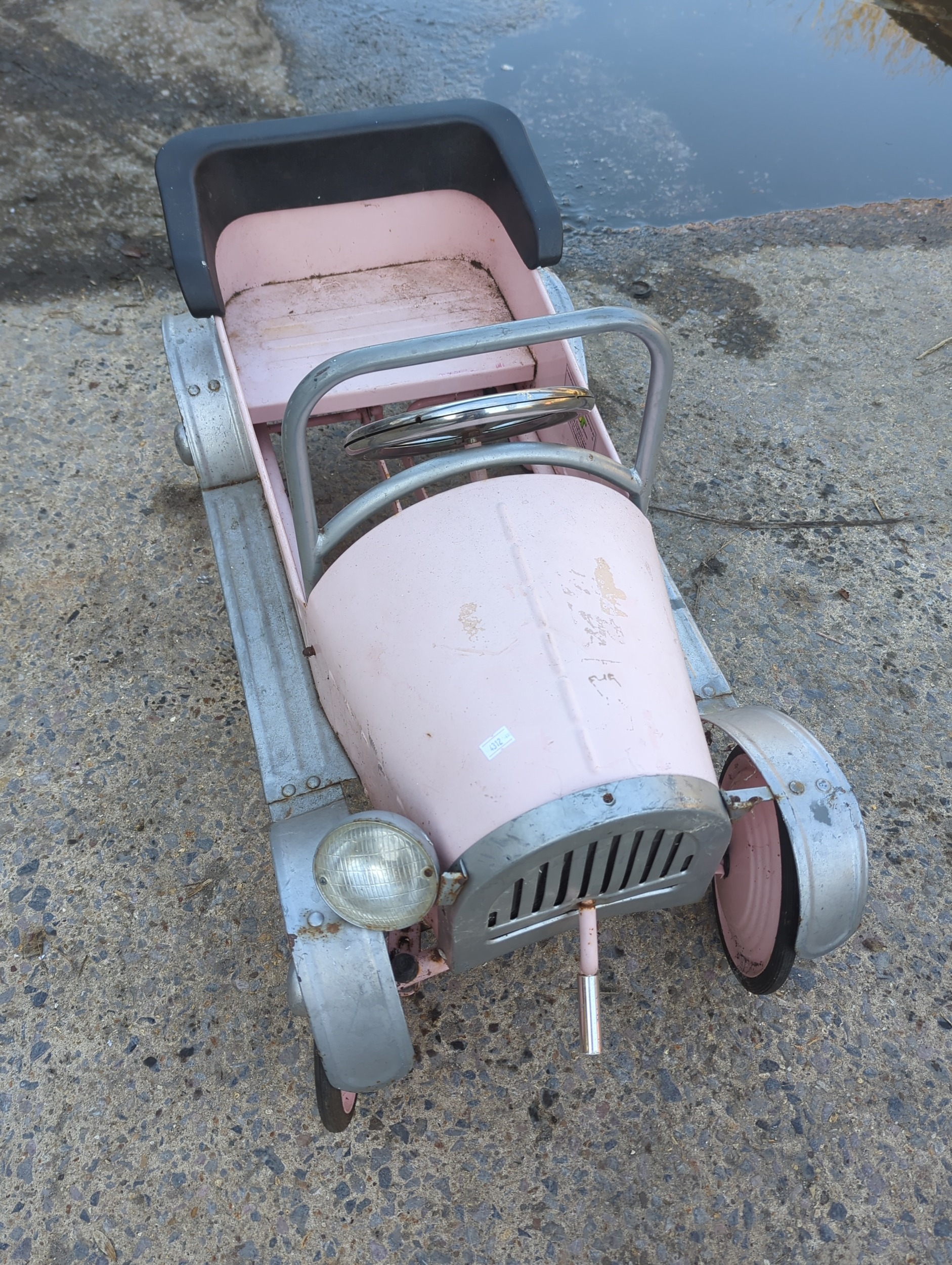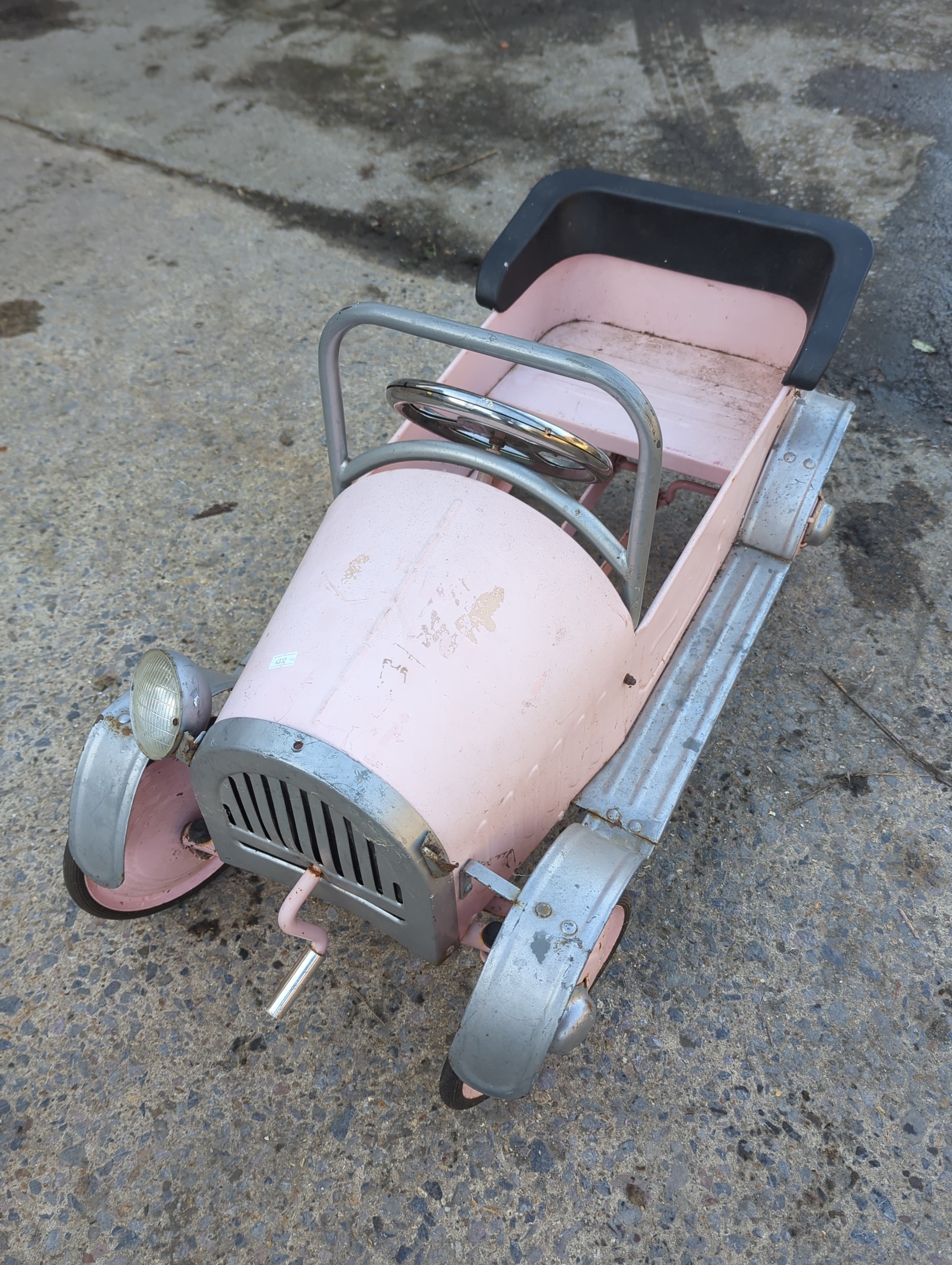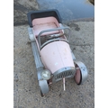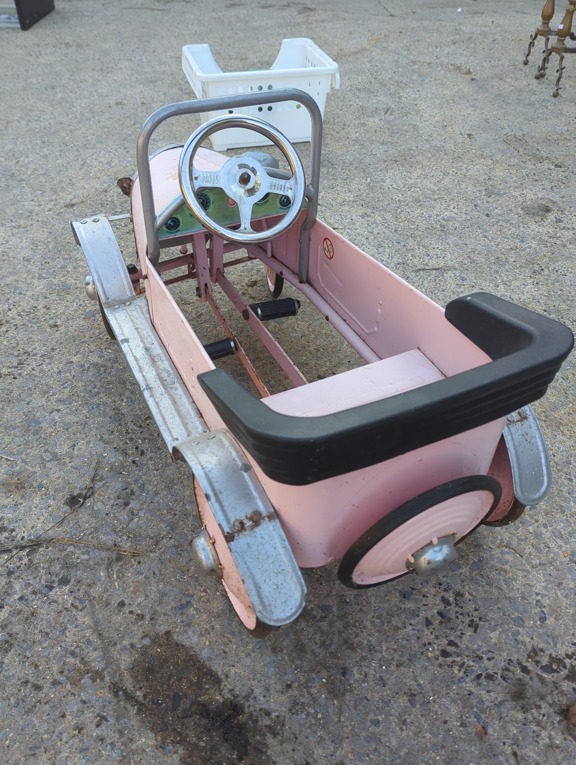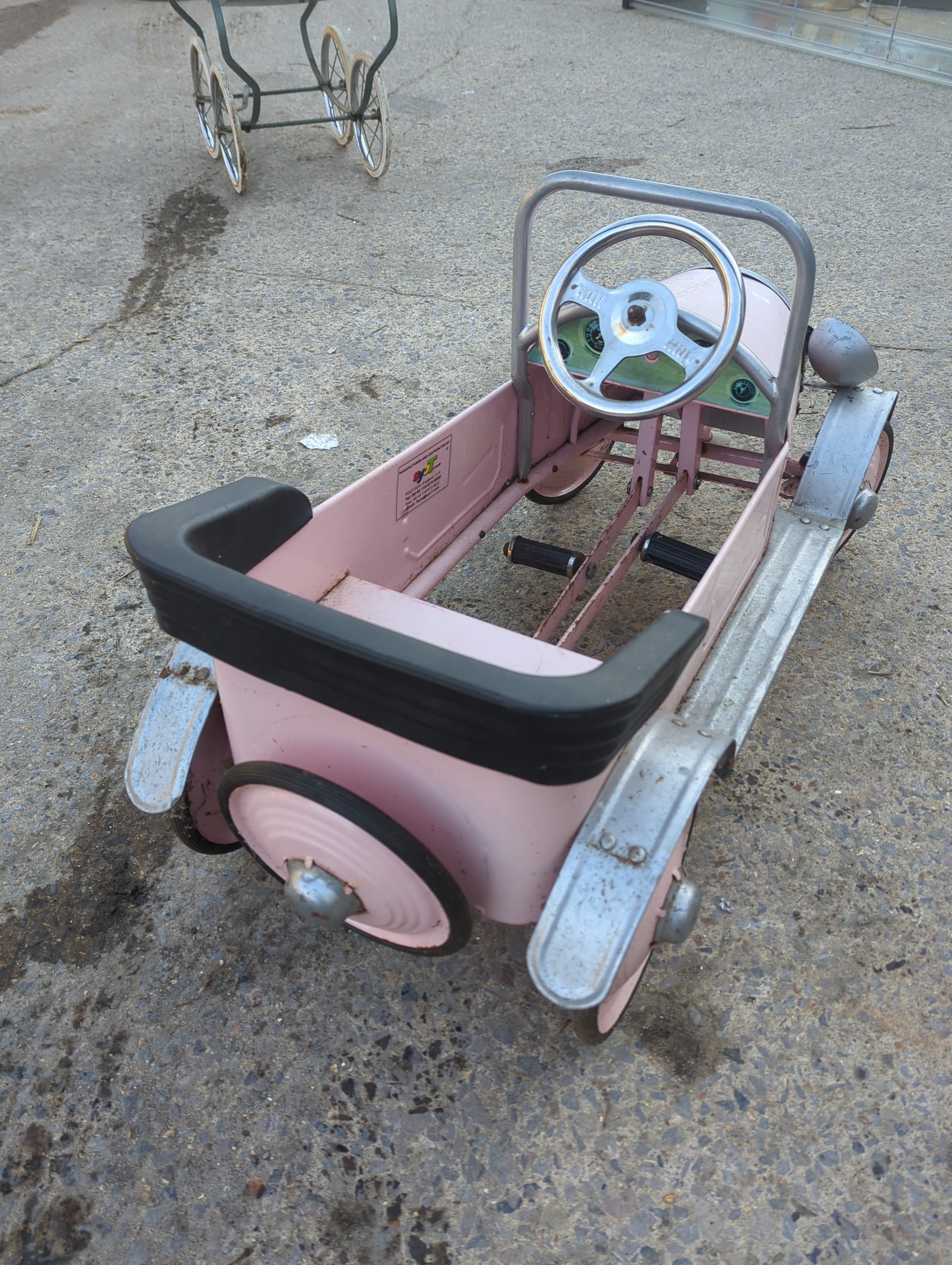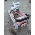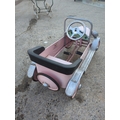 The item is a Syot pedal car, featuring a nostalgic design with a pink and silver finish. It includes metal accents and a classic pedal mechanism, ideal for outdoor play. The car's charming look is complemented by a front grille and headlight details. This piece combines playful aesthetics with functionality.