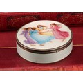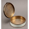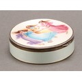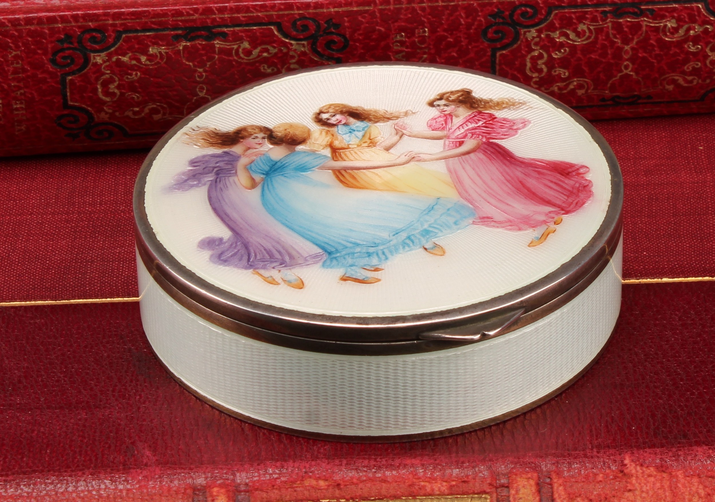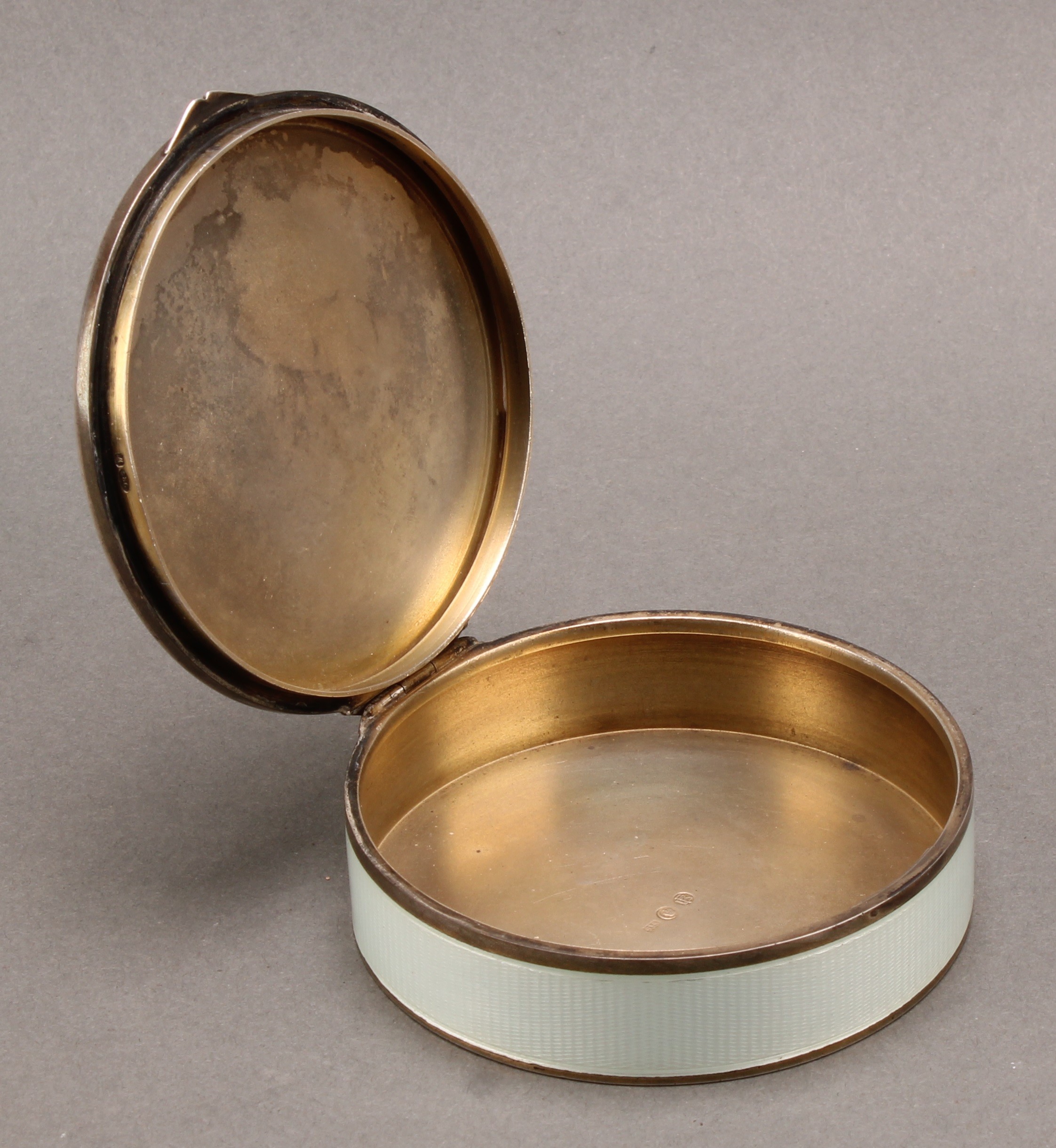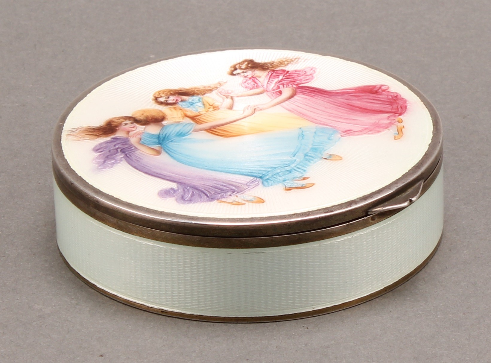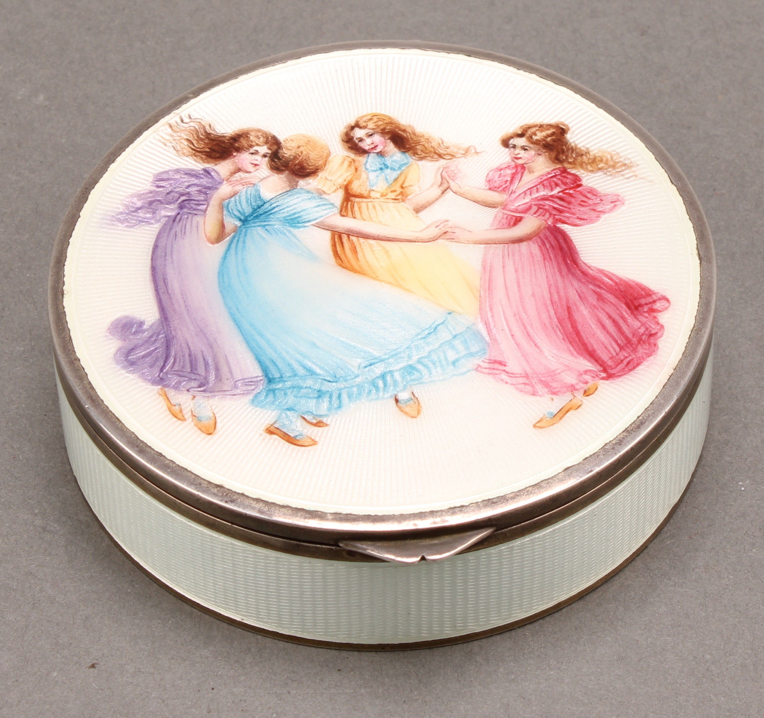 An early 20th century Continental silver and enamel circular table snuff box, hinged cover decorated in polychrome with young ladies dancing, on a cream guilloche ground, gilt interior, 8cm diam, import mark for Chester 1922
