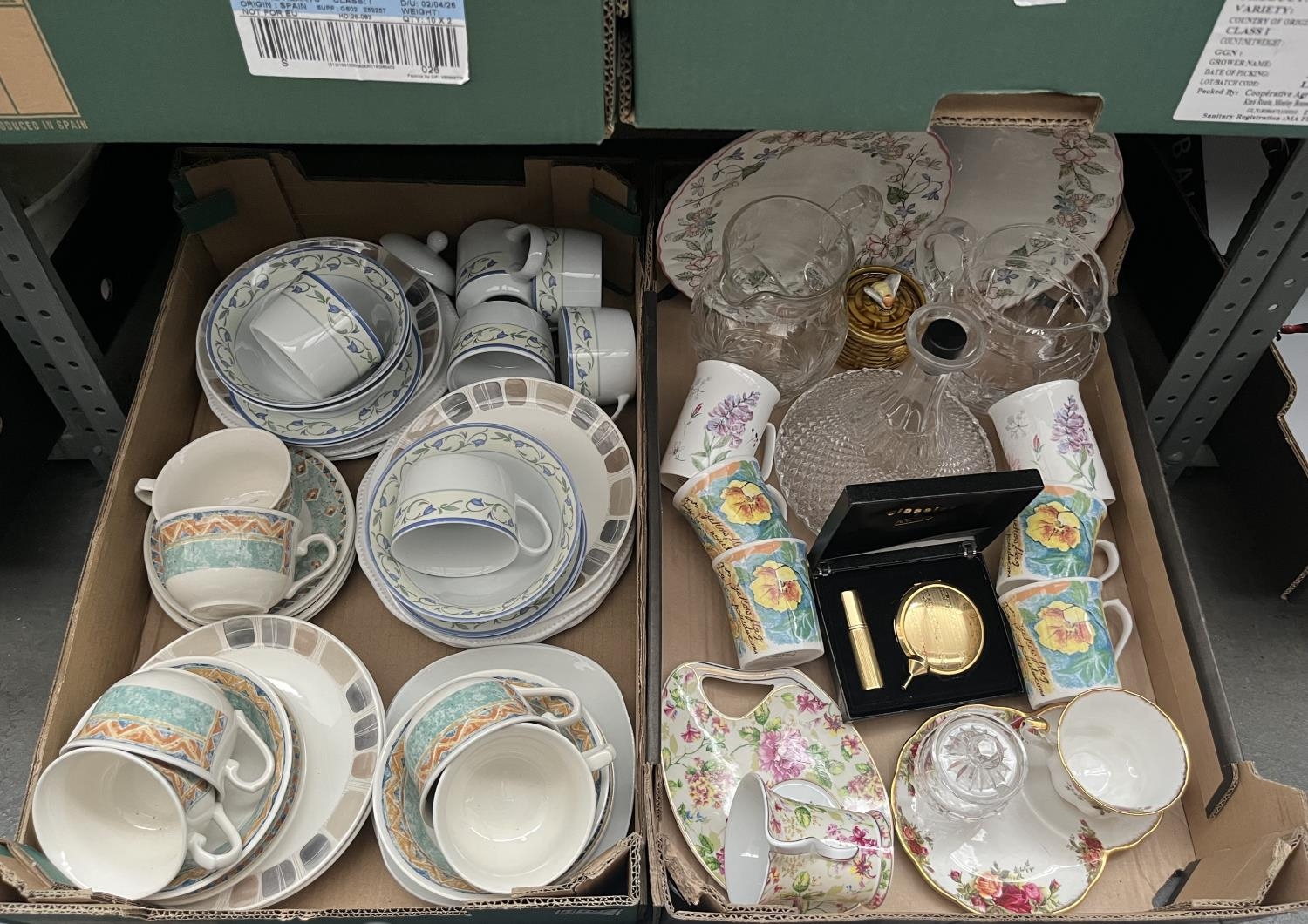 2 Boxes containing Johnson Bros China, decanters and a Royal Albert Old Country Roses tea cup and plate etc