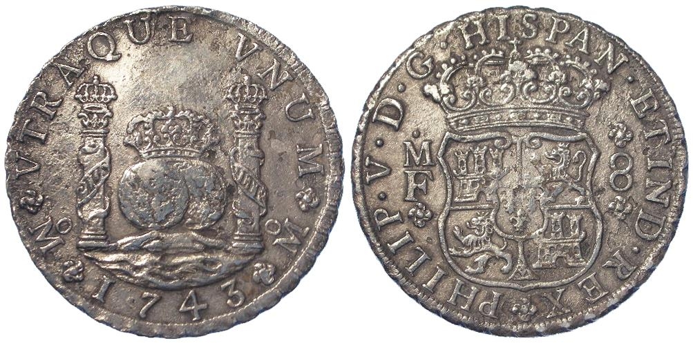 Spanish Mexico silver 8 Reales 1743 Mo MF, VF light water damage (a shipwreck piece, no provenance but too late for the Roosvijk)