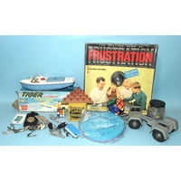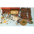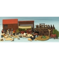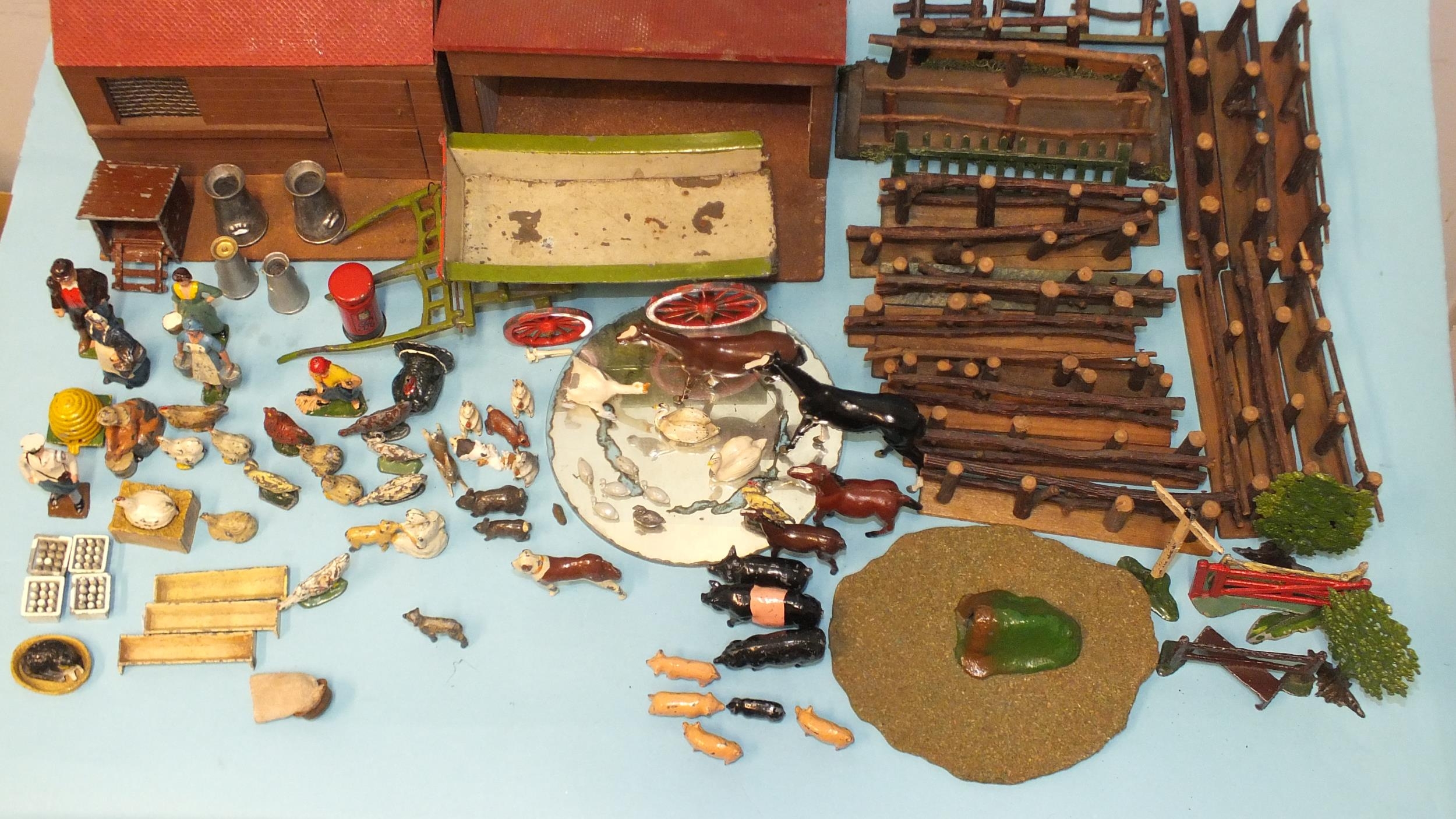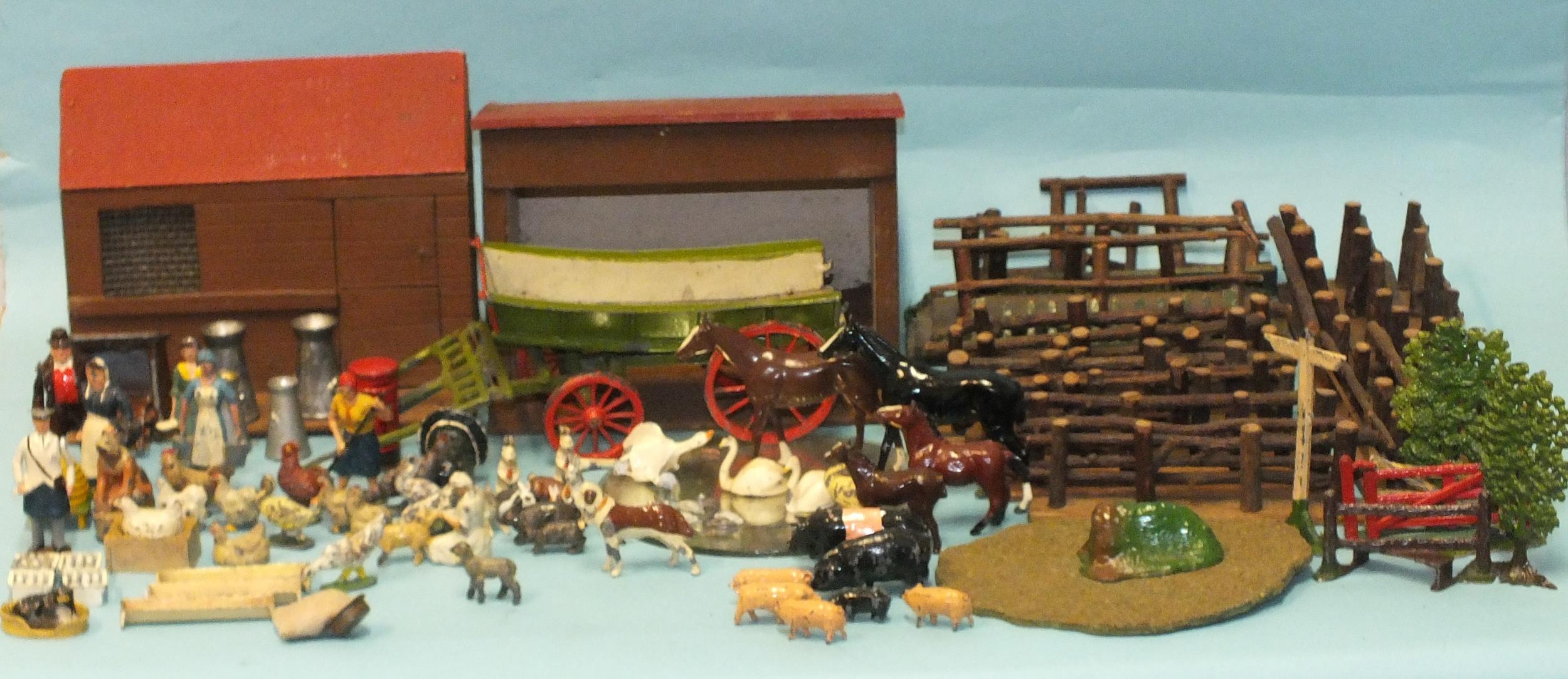 A quantity of Britains and other farm figures and animals, including farmer & wife, milkmaid, milkman and milk crates, poultry, horses, pigs, cat in a basket, trees and fences, also two wooden buildings and fences and a lead farm cart.