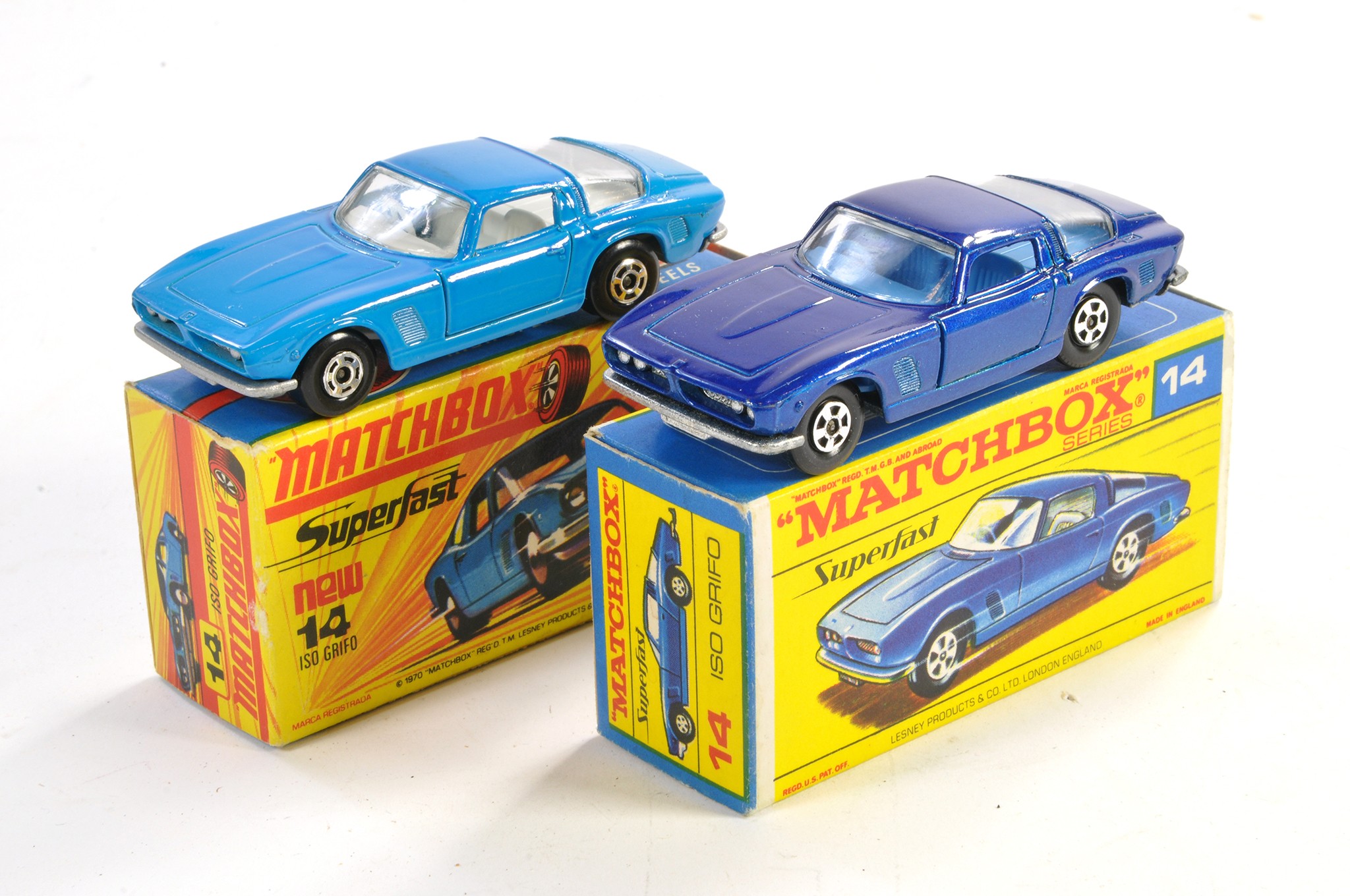 Matchbox Superfast No. 14A Iso Grifo x 2. Varitions in dark and lighter blue with box variations. Both excellent in excellent boxes.