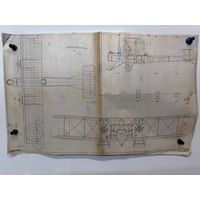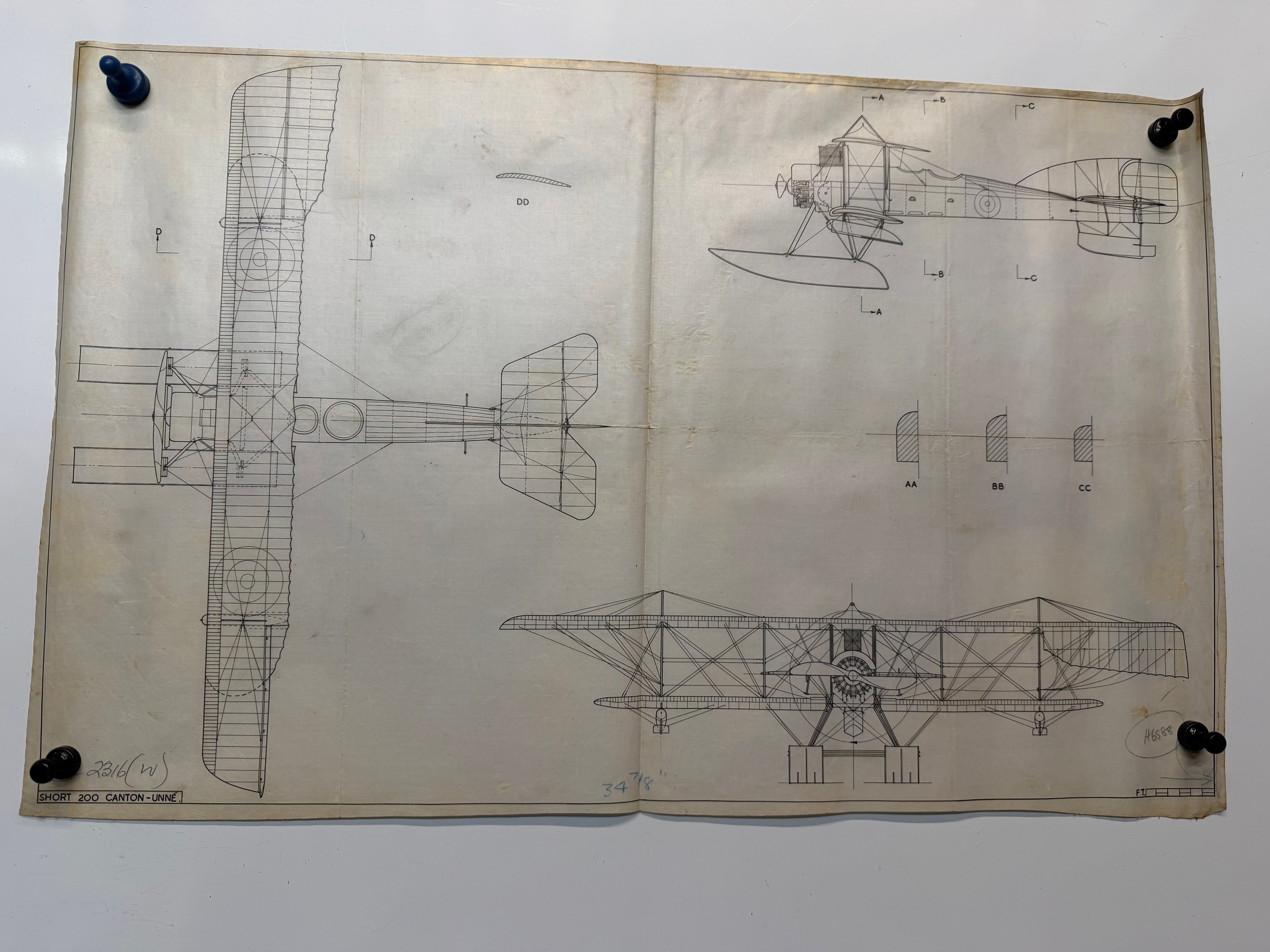 British aviation WWI & WWII planes, Vintage aircraft plans on linen of a Short 200 Canton-Unne, 60cm x 38 cm.