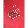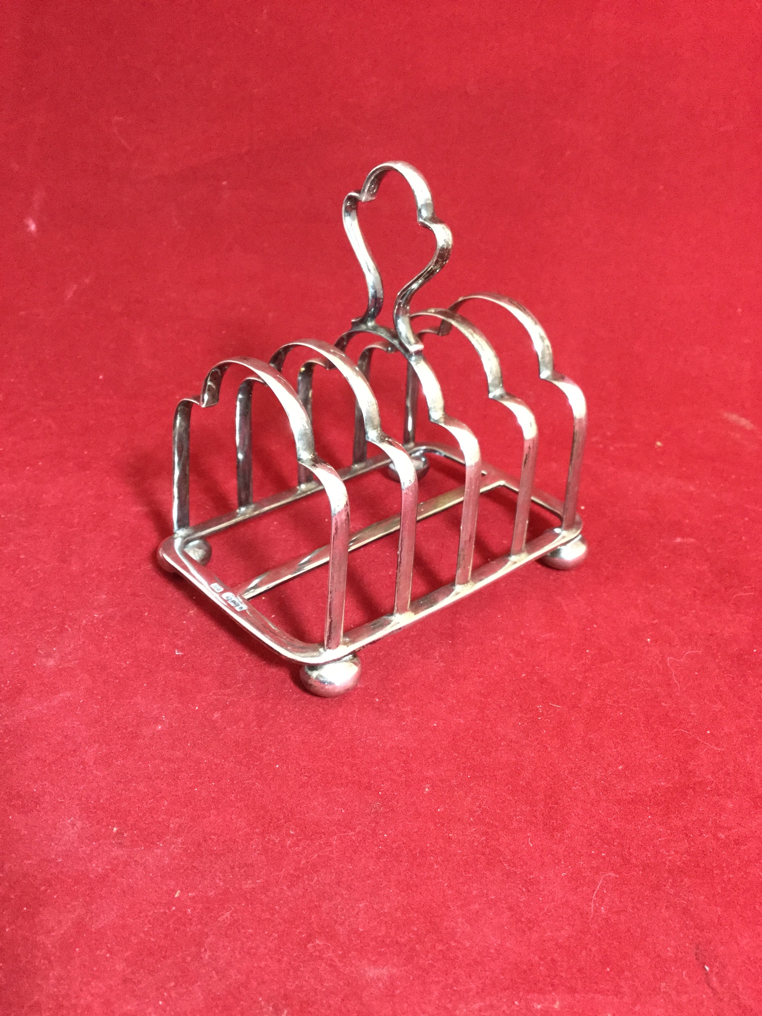 A silver toast rack, Sheffield 1917, raised on ball feet -