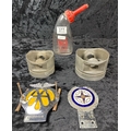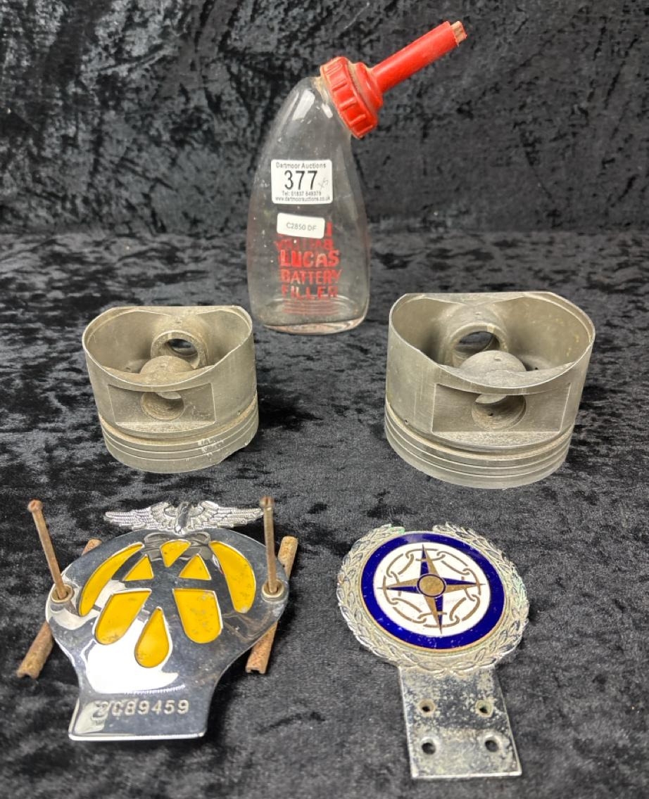 Lucas battery filler, AA car badge, a car club car badge and two forged pistons.