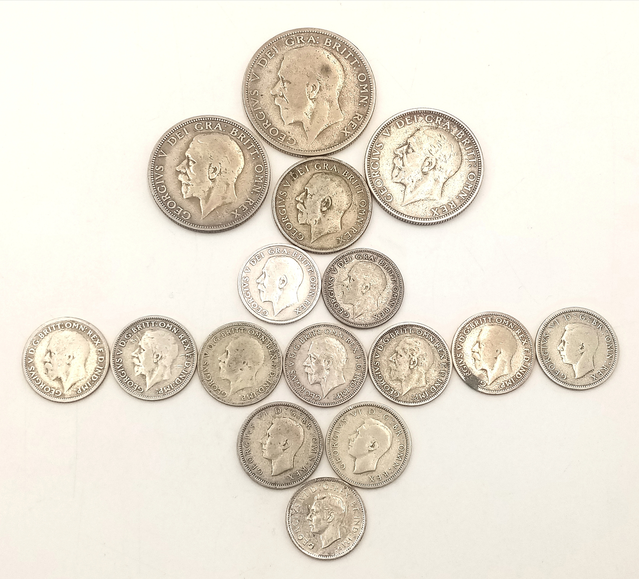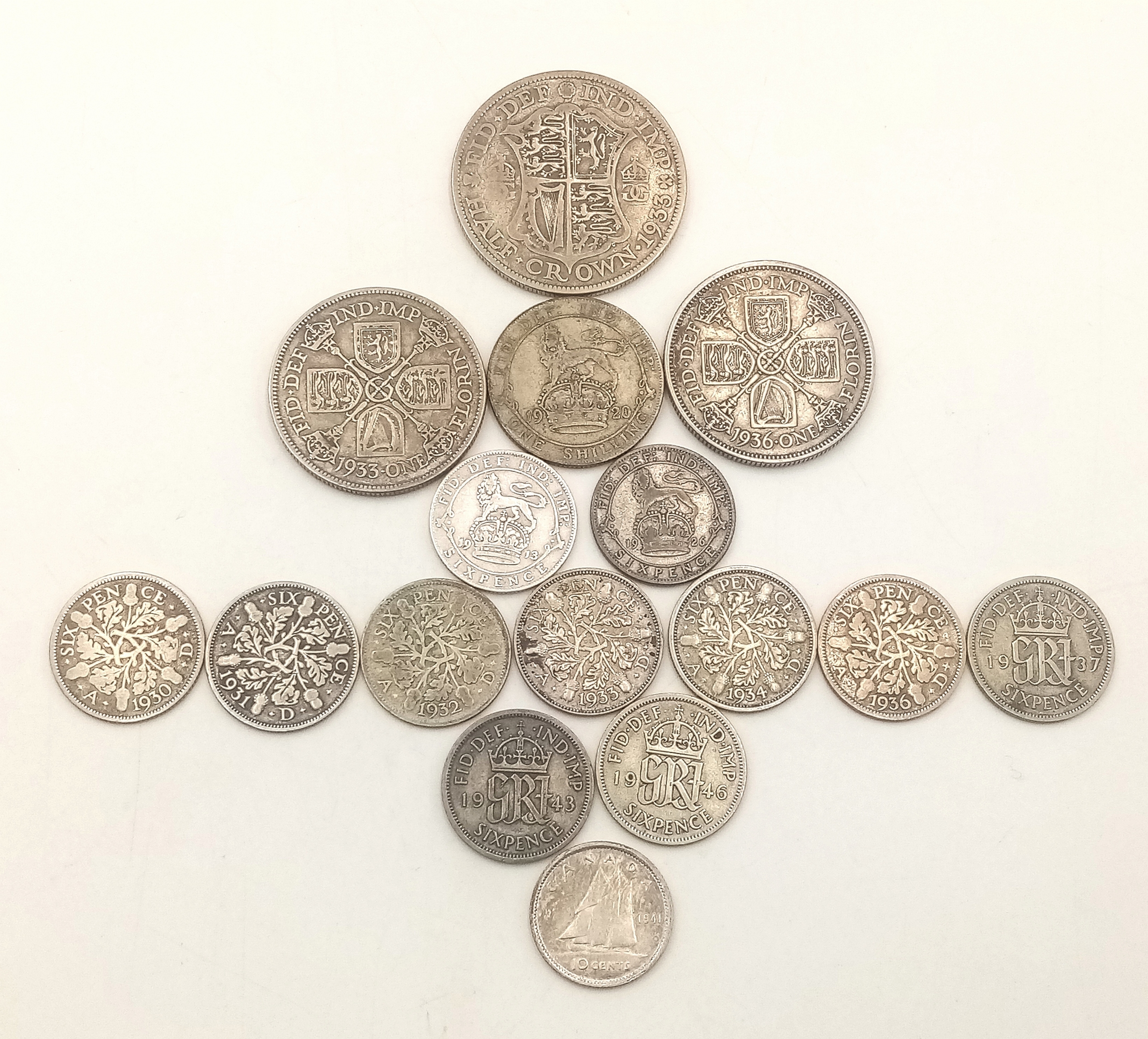 A Parcel of Sixteen Pre-1947 Silver Coins Comprising: 1) 1933 George V Half Crown, 2) Two George V Florins 1936 (Year of the Three Kings) & 1933, 3) 1920 Silver Shilling, Eleven Sixpences including 1936 and WW2 Dates, Ranging from 1926 to 1946 & WW2 Era 1941 Canadian 10 Cents. Gross Weight 74.09 Grams.