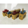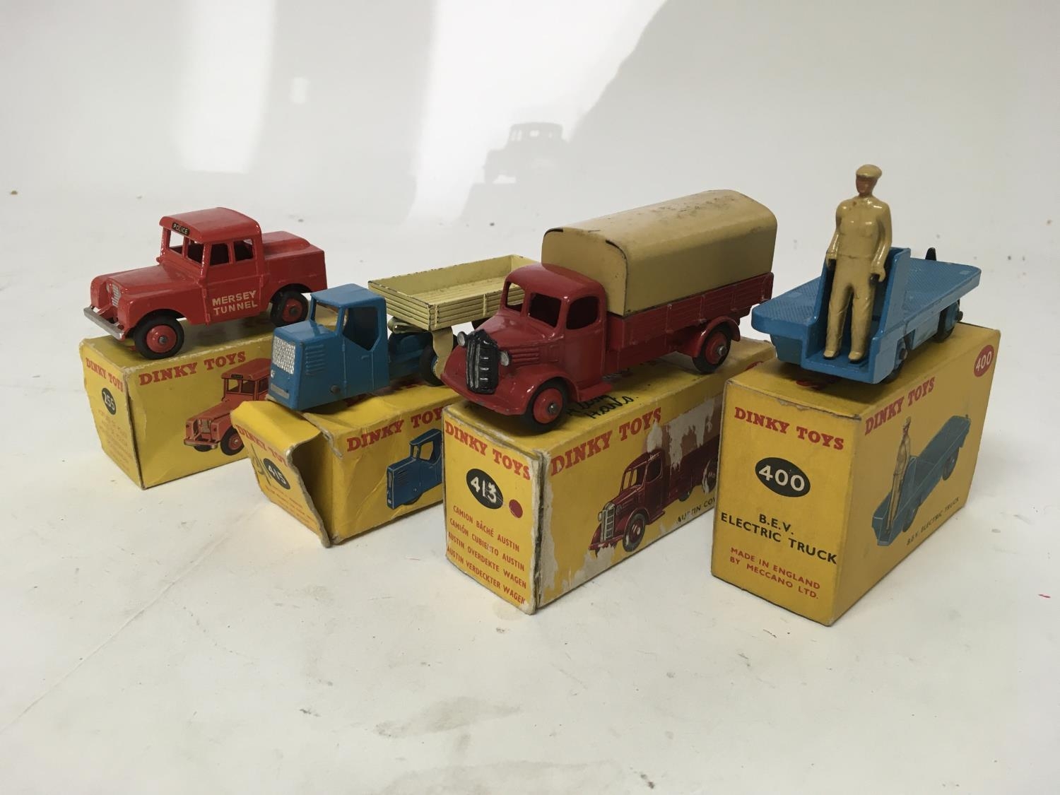 Dinky toys, #255 Mersey tunnel police van, #415 Mechanical horse and open wagon, #413 Austin covered wagon and #400 BEV electric truck, boxed