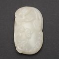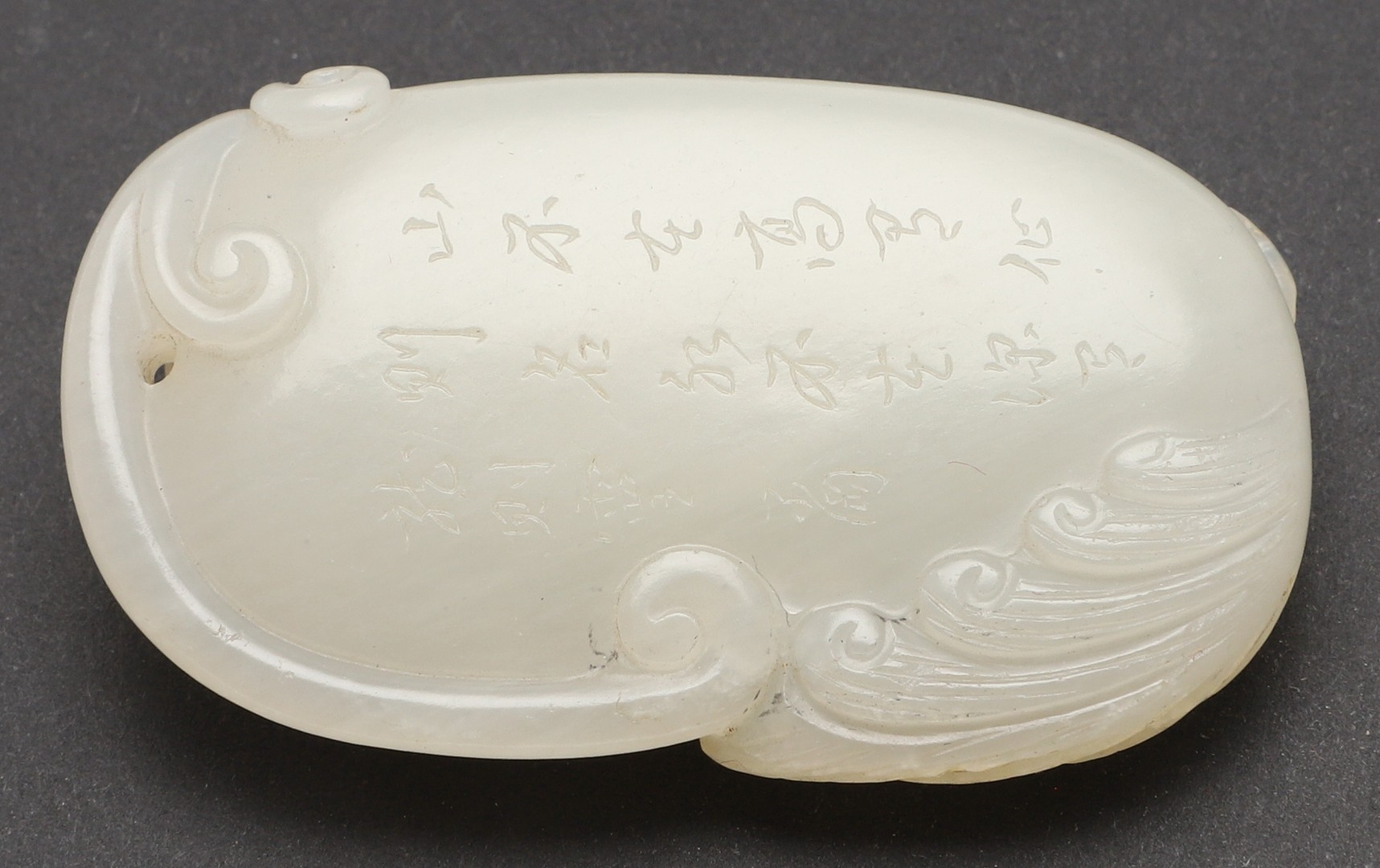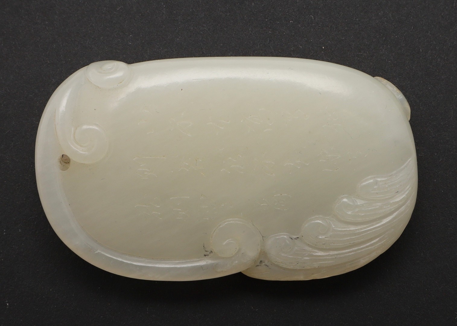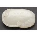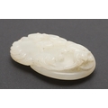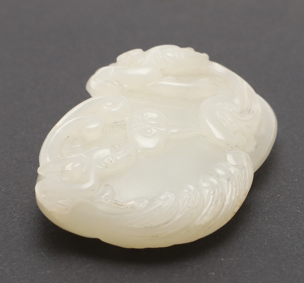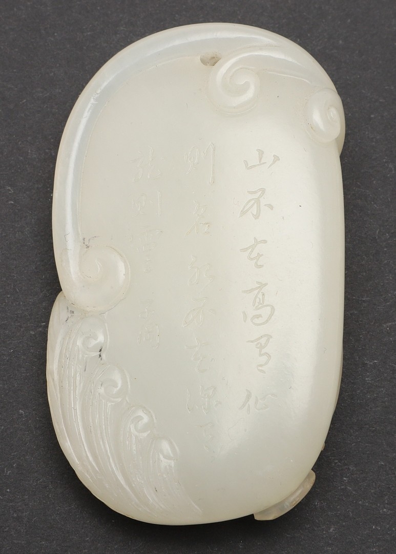 CHINESE CARVED JADE PLAQUE/PENDANT - INSCRIBED. Late Qing/Republican period, the small pale celadon jade plaque or pendant carved in the form of two chilong and linghi fungus. With an inscription to the reverse which features a poem by Tang poet Liu Yuxi titled "Loushi Ming", describing how the value of things lie not in their external form but in their inner essence. With a small pierced hole at one end. With a later stand, plaque 5.5cms across.