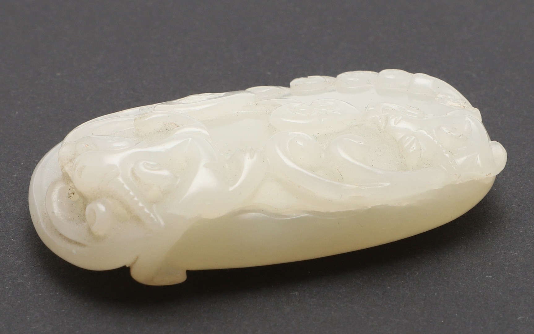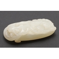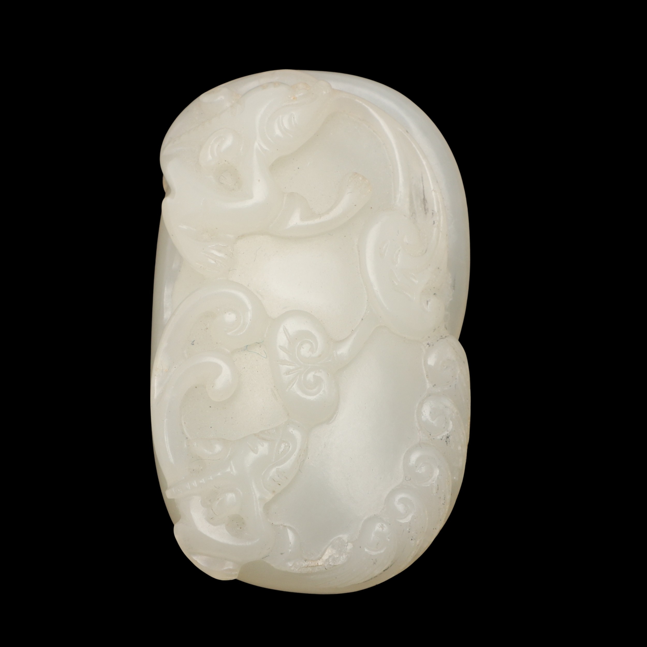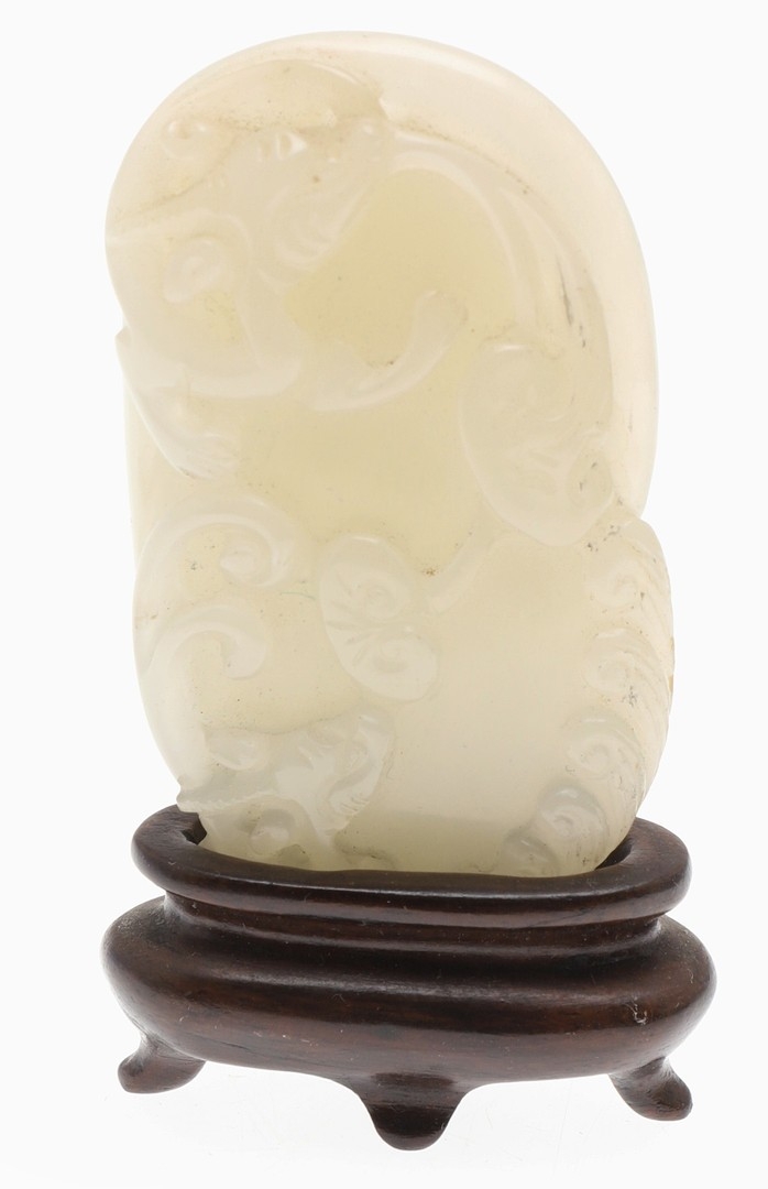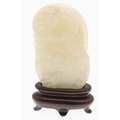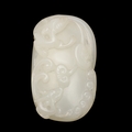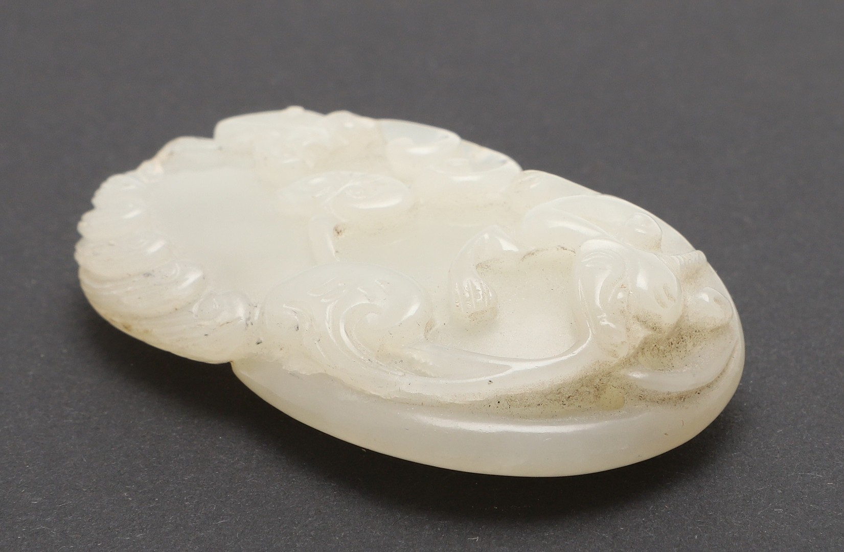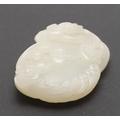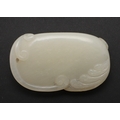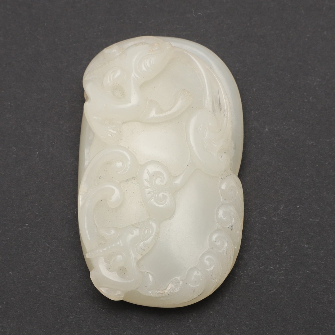 CHINESE CARVED JADE PLAQUE/PENDANT - INSCRIBED. Late Qing/Republican period, the small pale celadon jade plaque or pendant carved in the form of two chilong and linghi fungus. With an inscription to the reverse which features a poem by Tang poet Liu Yuxi titled "Loushi Ming", describing how the value of things lie not in their external form but in their inner essence. With a small pierced hole at one end. With a later stand, plaque 5.5cms across.