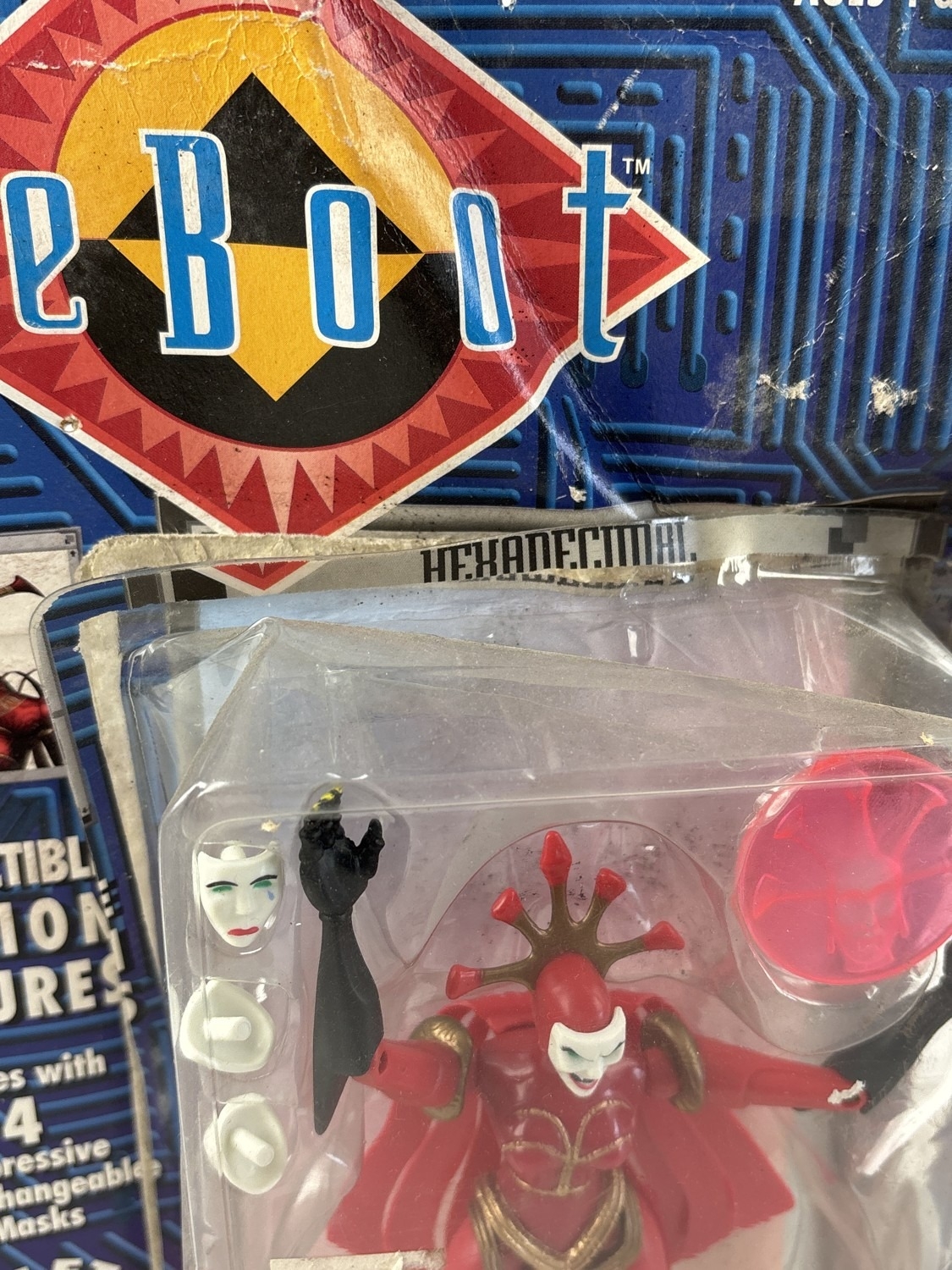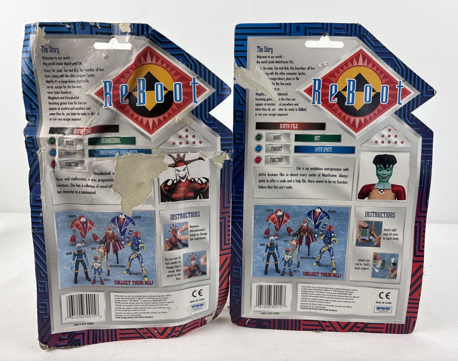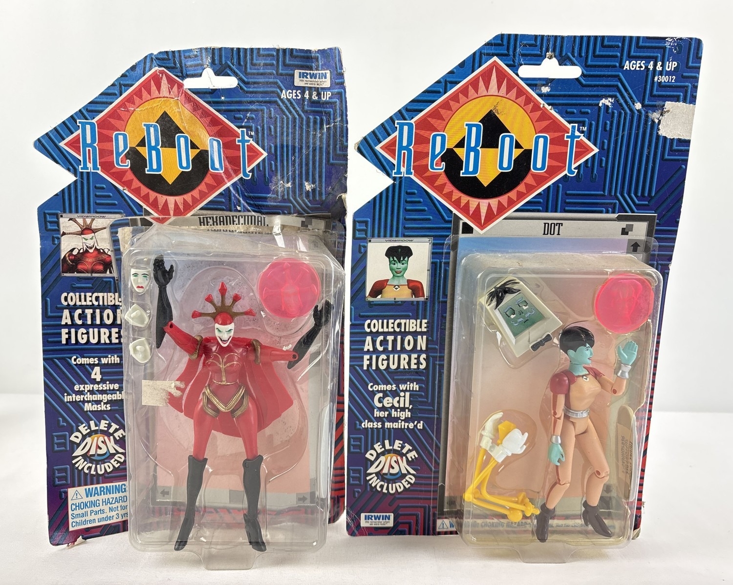 2 Reboot animated TV series collectable action figures & accessories from Irwin Toys, 1995. Dot (carded & sealed) together with Hexadecimal (carded but damaged and so plastic has started pulling away from card).