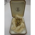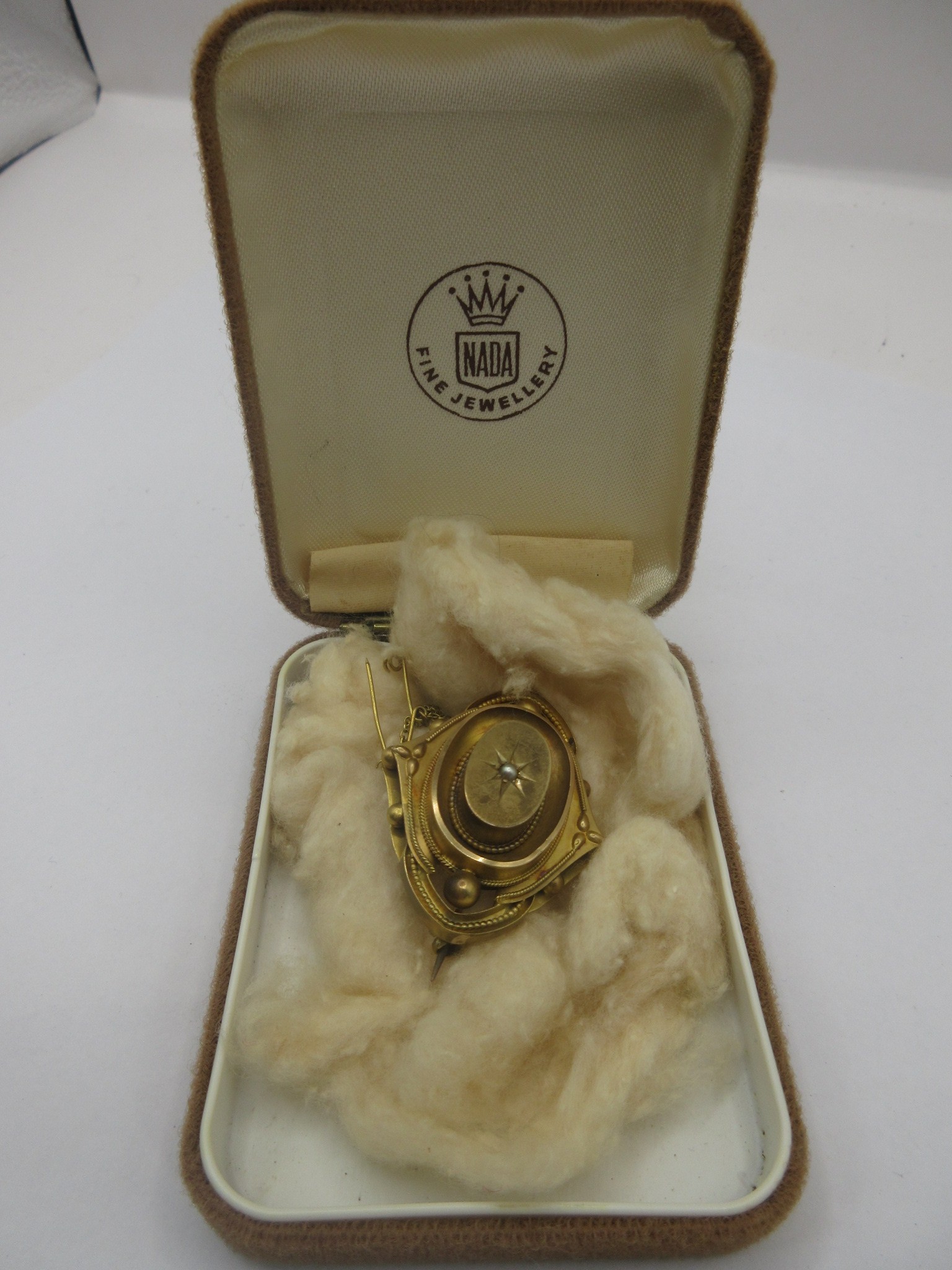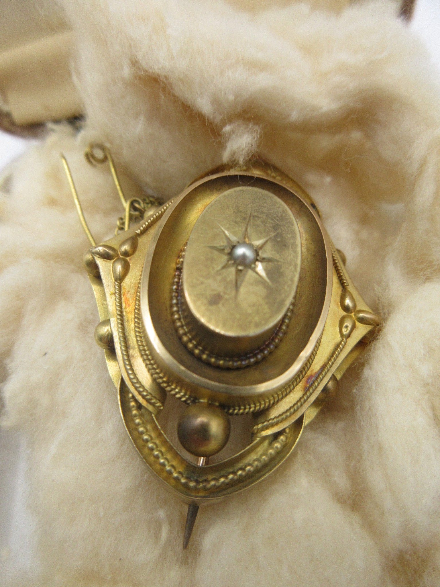 An Edwardian gold memorial brooch, tests positive for 12 carat gold, of lobed oval shape with glazed locket to the reverse. Gross weight 7.2g which includes the pin, safety chain and base metal backing of the pearl setting, but excludes the glazed oval mount. The glazed oval mount is base metal. Overall the brooch measures approx. 39mm x 31mm. With a modern jewellery box for safekeeping