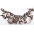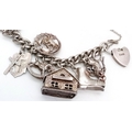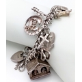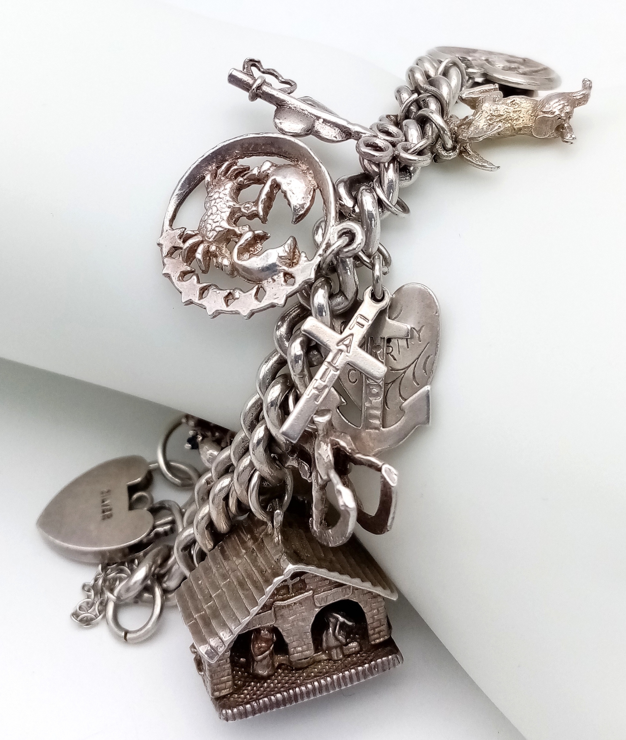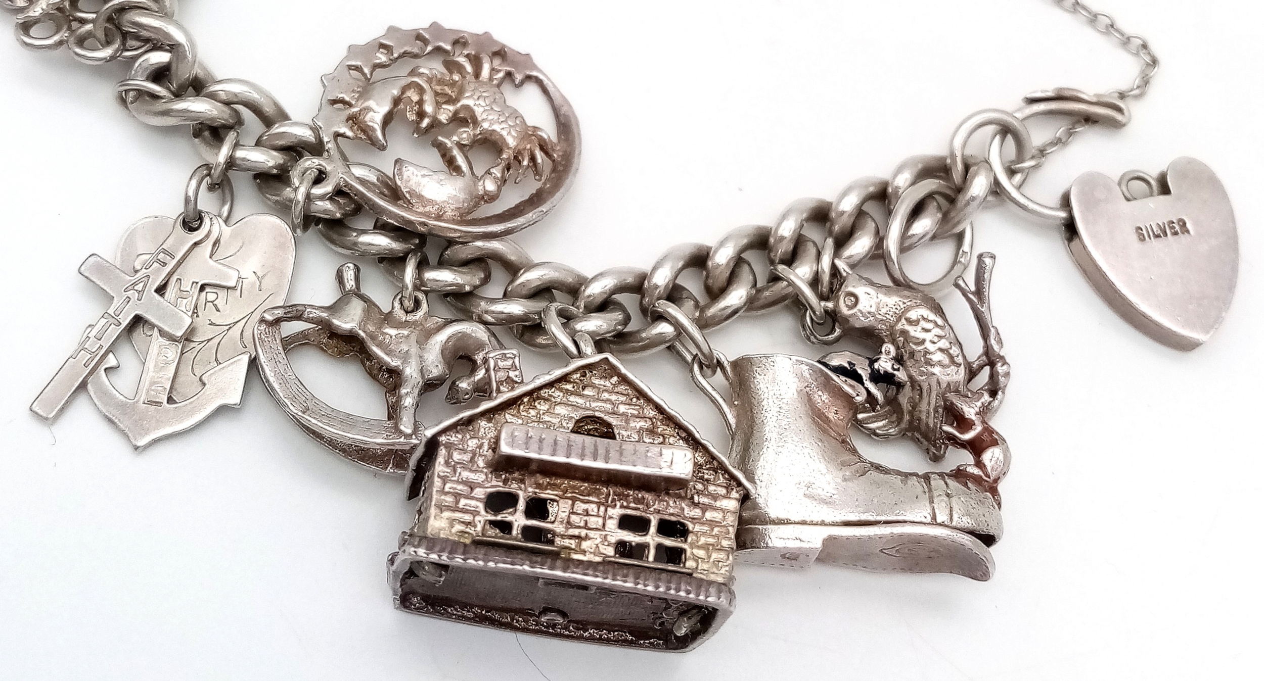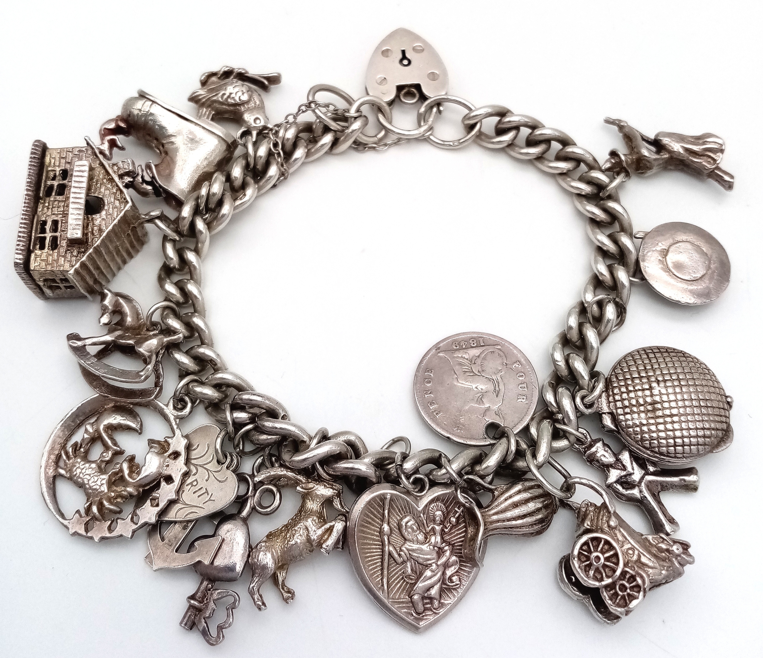 Vintage SILVER CHARM BRACELET. Complete with Silver Safety Chain and Padlock Clasp. Silver Charms to include Chalet,Pram,Anchor,St Christopher, Oyster , Victorian Silver Coin, etc,etc.