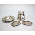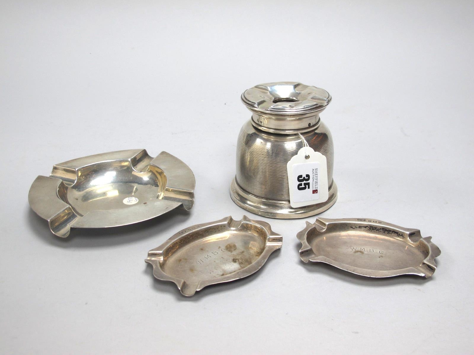A Hallmarked Silver 'No Fume' Ashtray, SLd, Birmingham 1930, allover engine turned design (dents); A Hallmarked Silver Ashtray, London 1933, of plain design (100grams); and a pair of smaller hallmarked silver ashtrays, each engraved "W.M.B.C.". (4)
