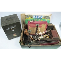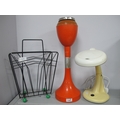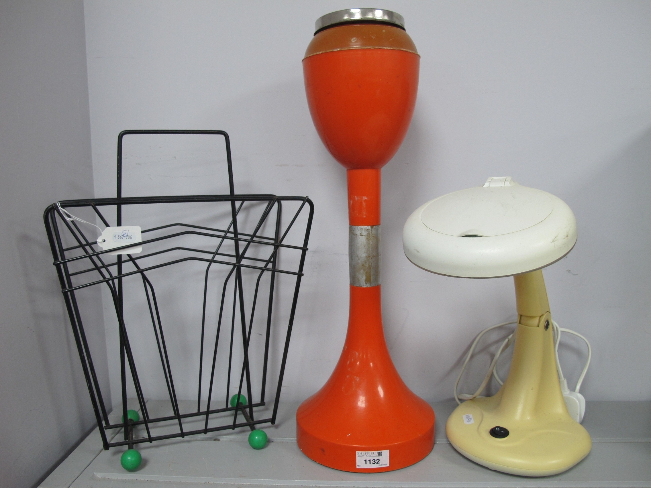 1970s Orange Plastic Floor Standing Ashtray, 52cm tall, magazine wirework rack with green atom feet, later desk lamp, untested, sold for parts only (3).