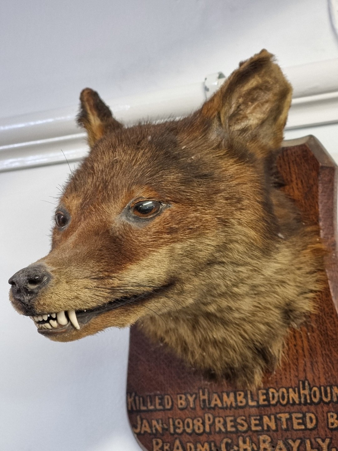 Taxidermy: a fox's head, on oak shield, inscribed 'Killed by Hambledon Hounds, Jan 1908...', labelled 'L W Bartlett & Son, Banbury...'.