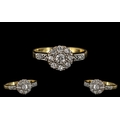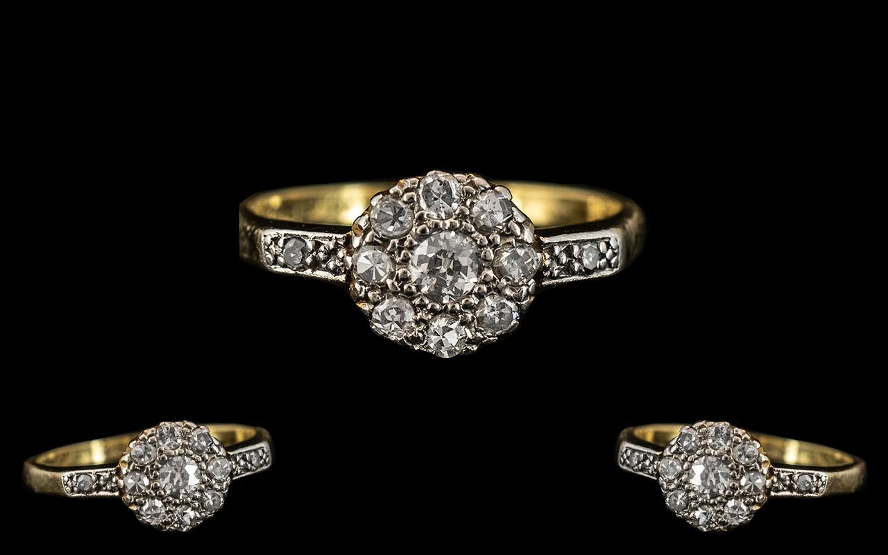 18ct Gold & Platinum Diamond Set Cluster Ring Flowerhead Design, circa 1920s. Marked 18ct and platinum to interior of shank. Diamonds of excellent white colour. Ring size L-M. All aspects of condition excellent, includes shank and setting.
