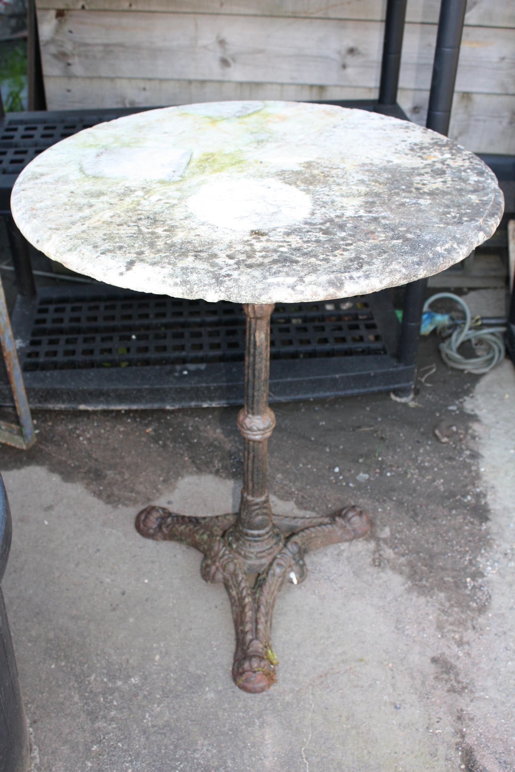 Circular marble top iron base pedestal table 28" h x 23" diameter