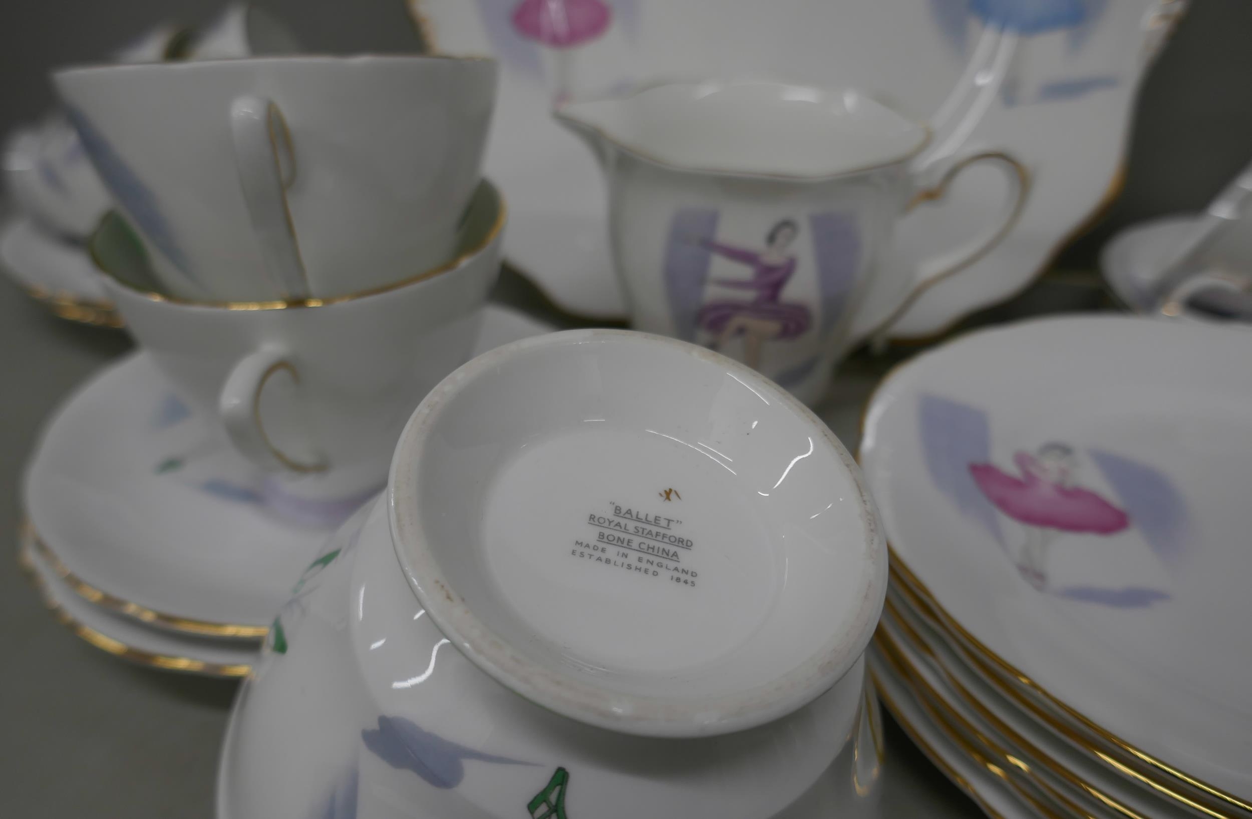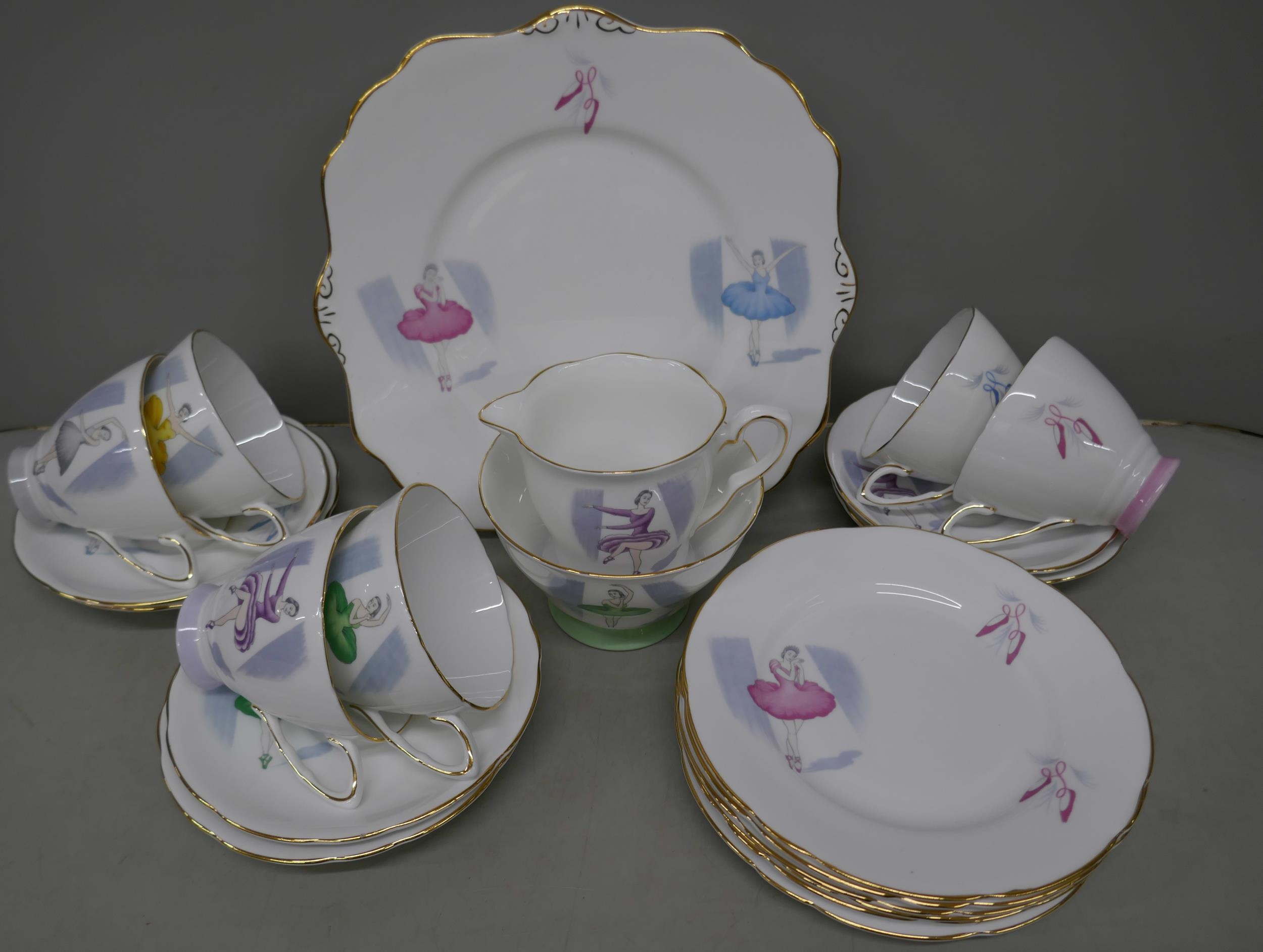 A Royal Stafford 'Ballet' tea set, cake plate, six side plates, six cups and saucers, sugar bowl and milk jug